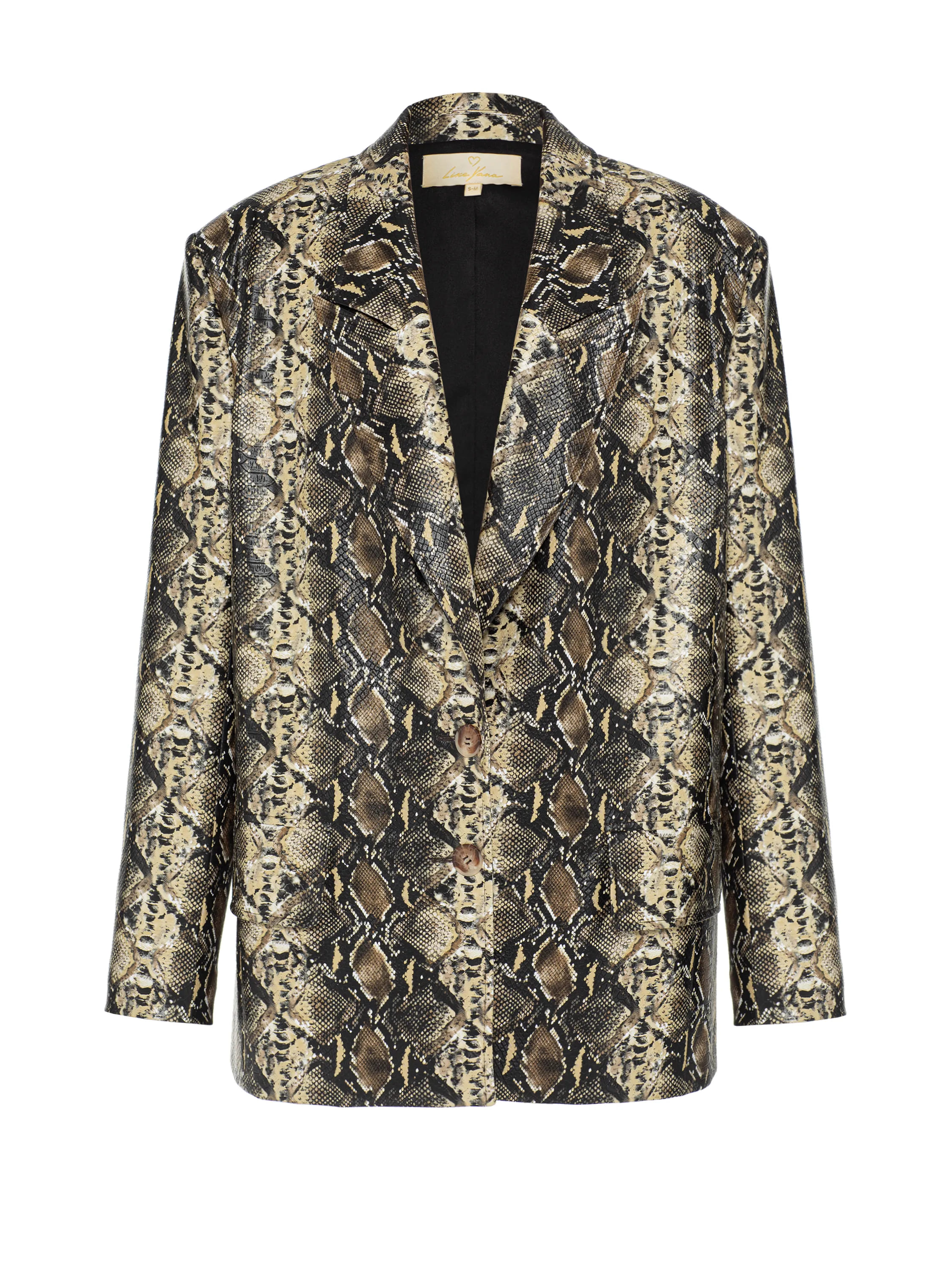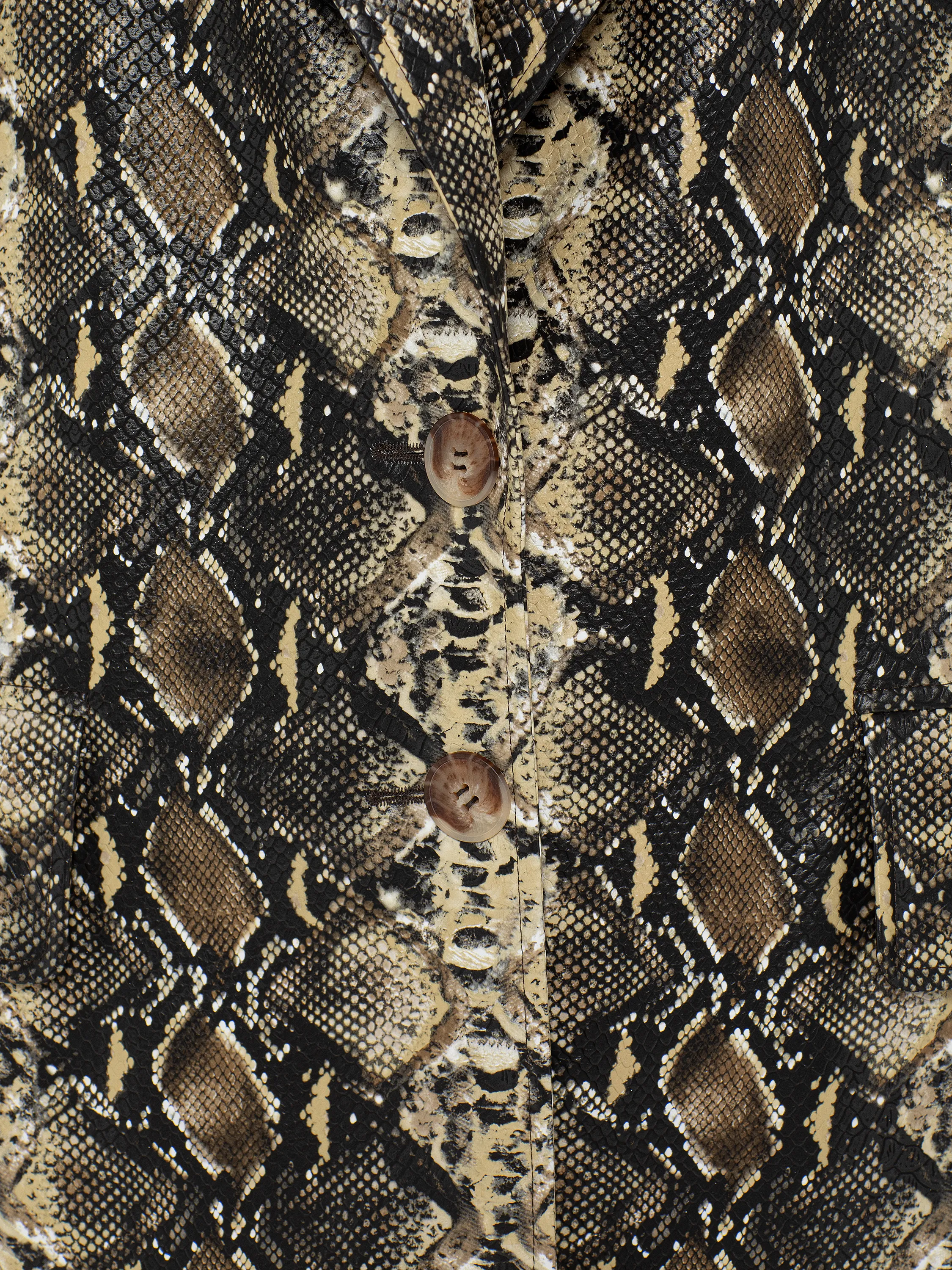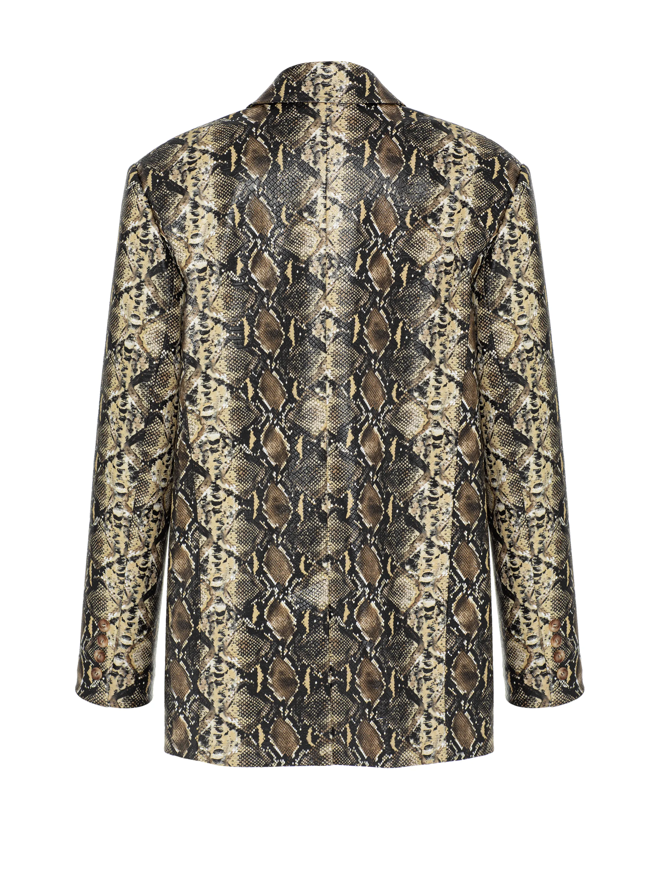 Beige eco-leather blazer with snake print. Snake print has become one of the trendiest of the autumn-winter season. The oversized model with two welt pockets is complemented by a solid lining and a front fastening with two buttons.