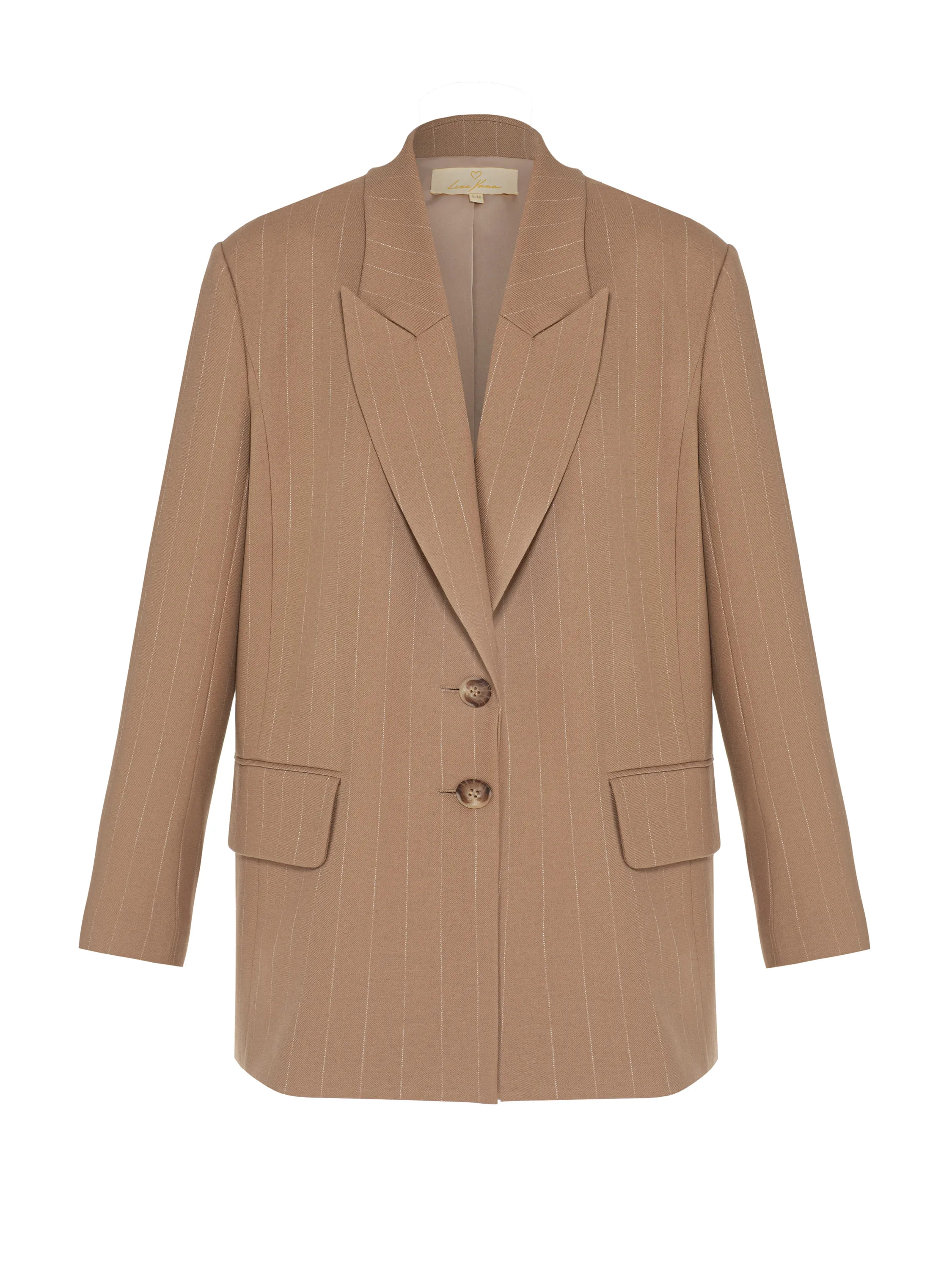 The beige oversized striped blazer from the new limited Fall’24 collection will be the perfect addition to a business look. The understated straight-cut design is complemented by shaped lapels and welt pockets with flaps.