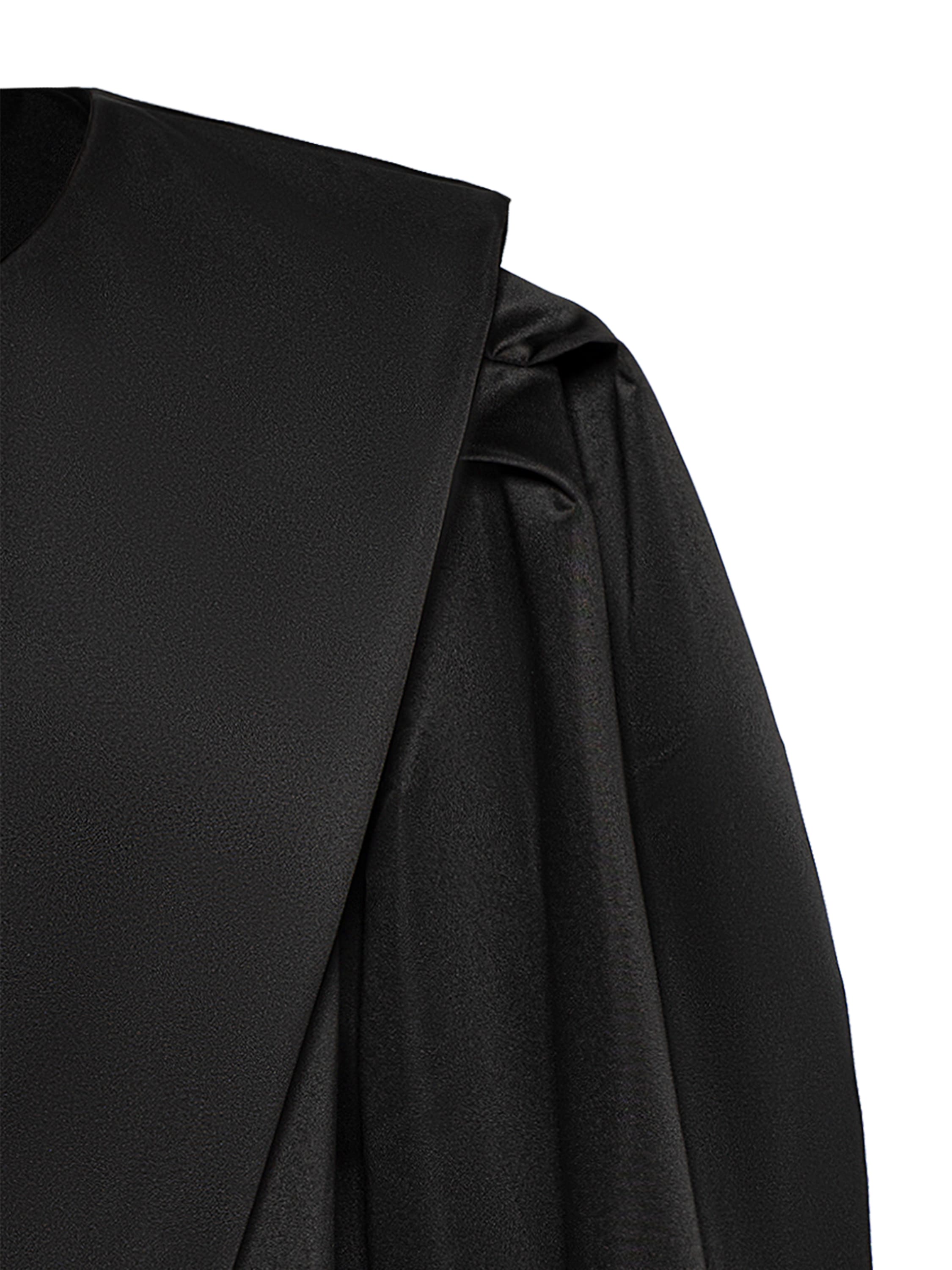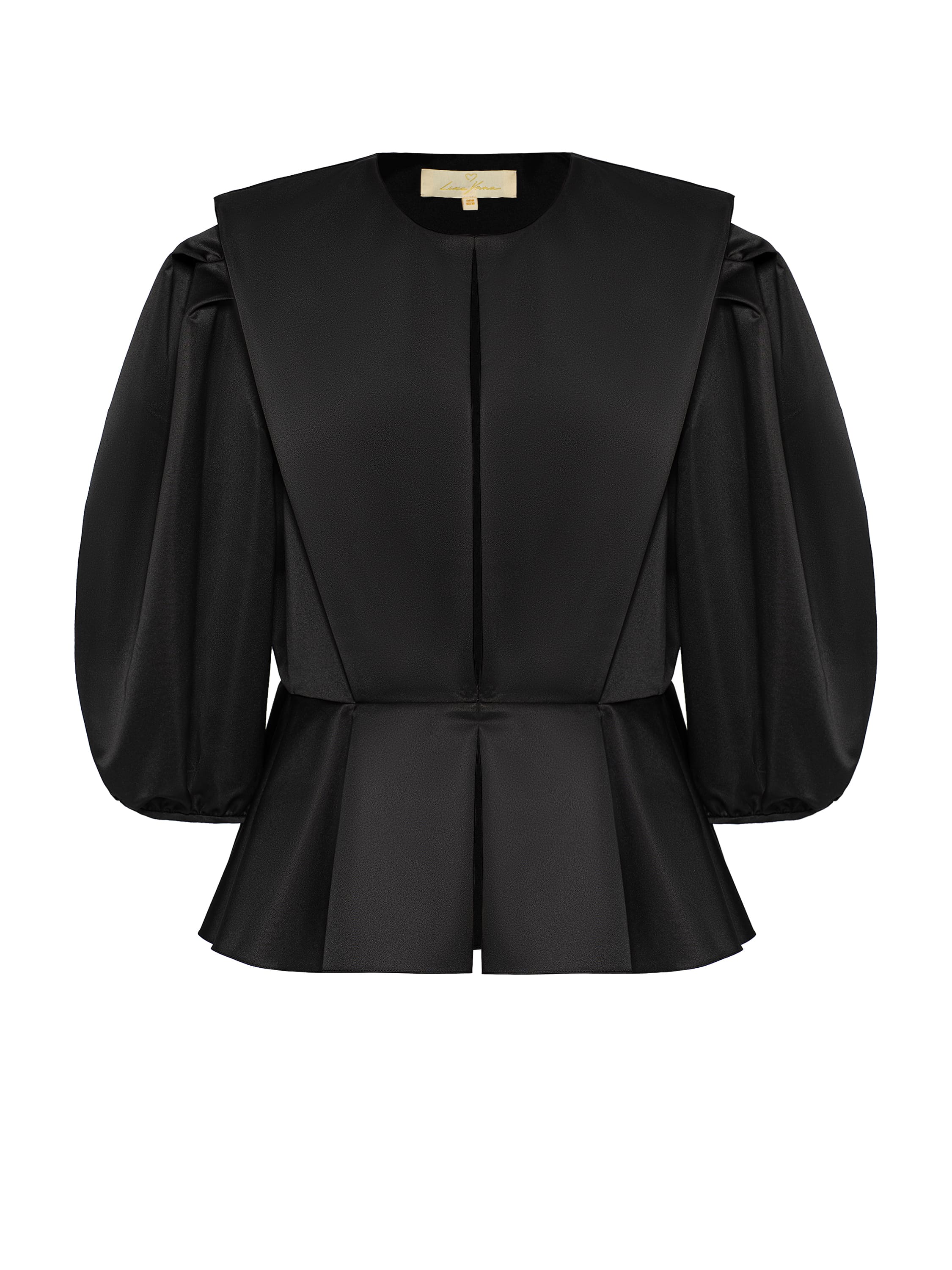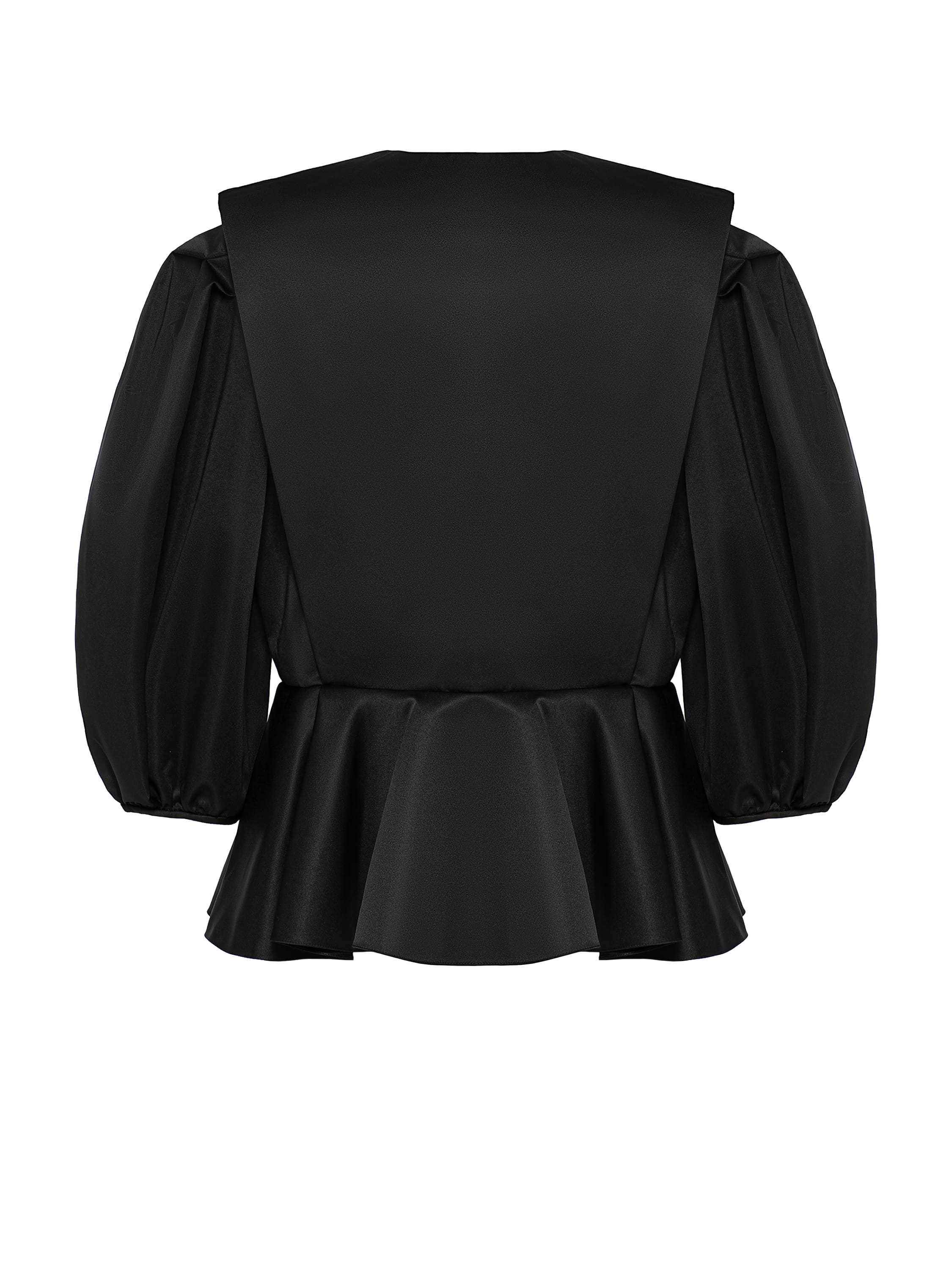 A solid-color jacket of an unusual cut is made of black taffeta. The cropped model with a peplum and voluminous sleeves will look especially striking when paired with a balloon skirt.