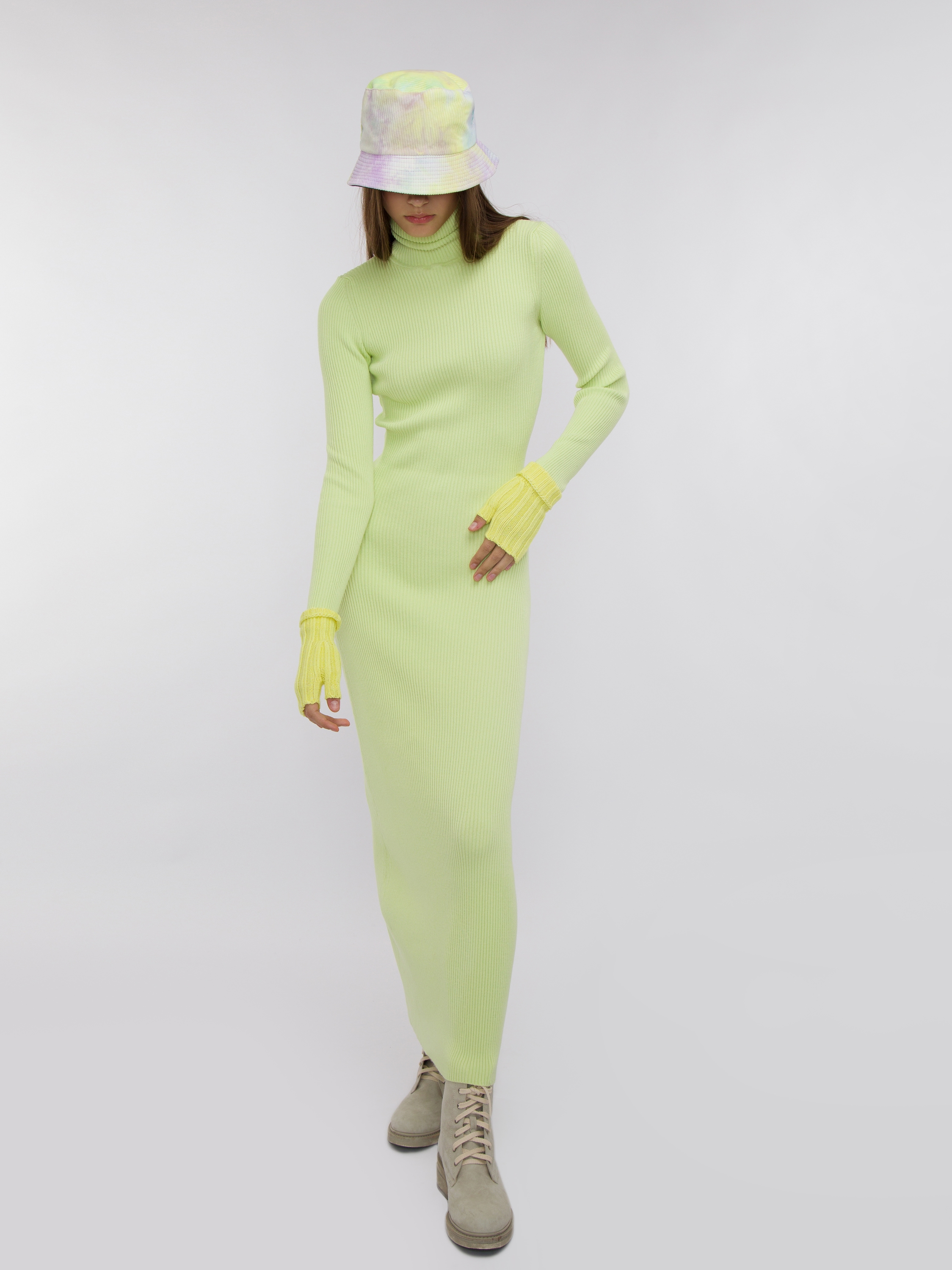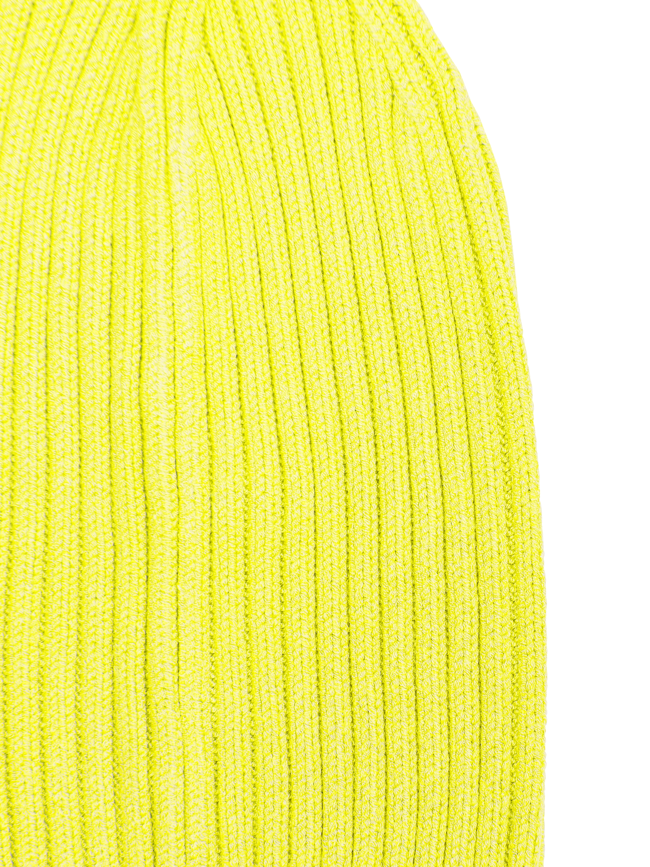 A knit set of a beanie hat and fingerless gloves is made of soft bright yellow yarn in a chunky rib.