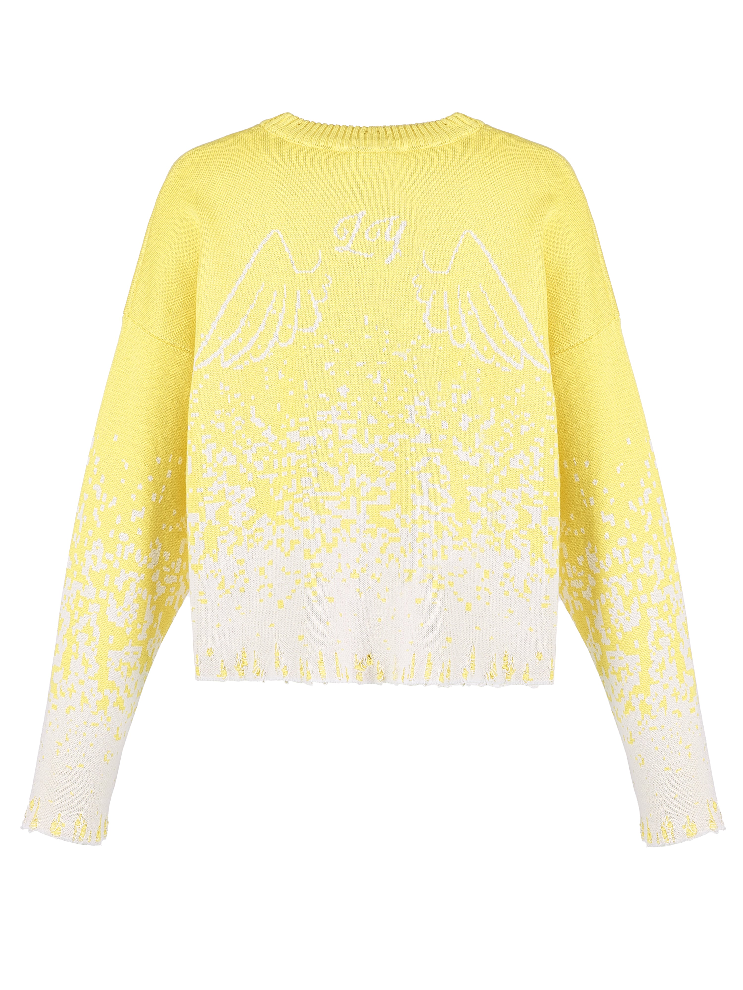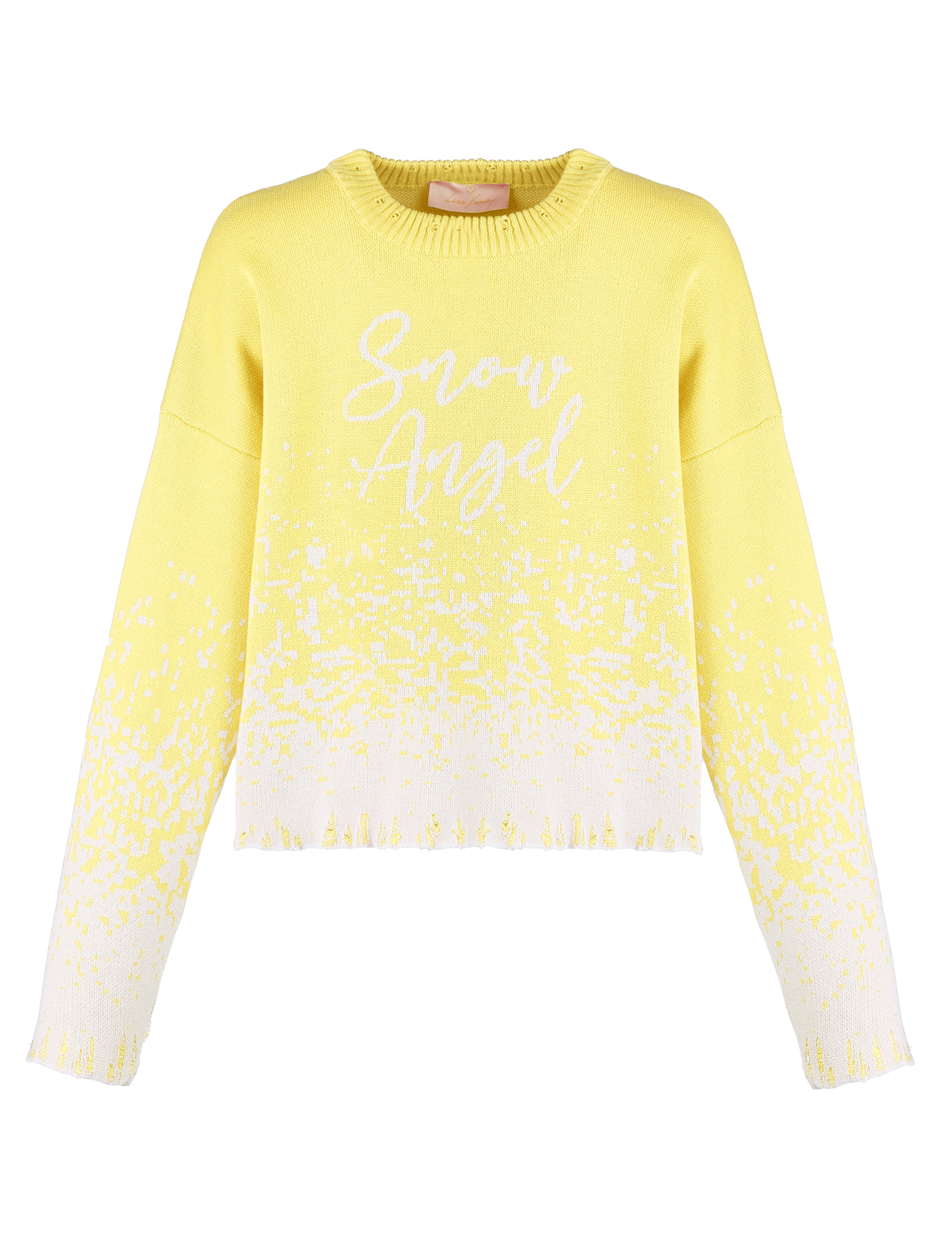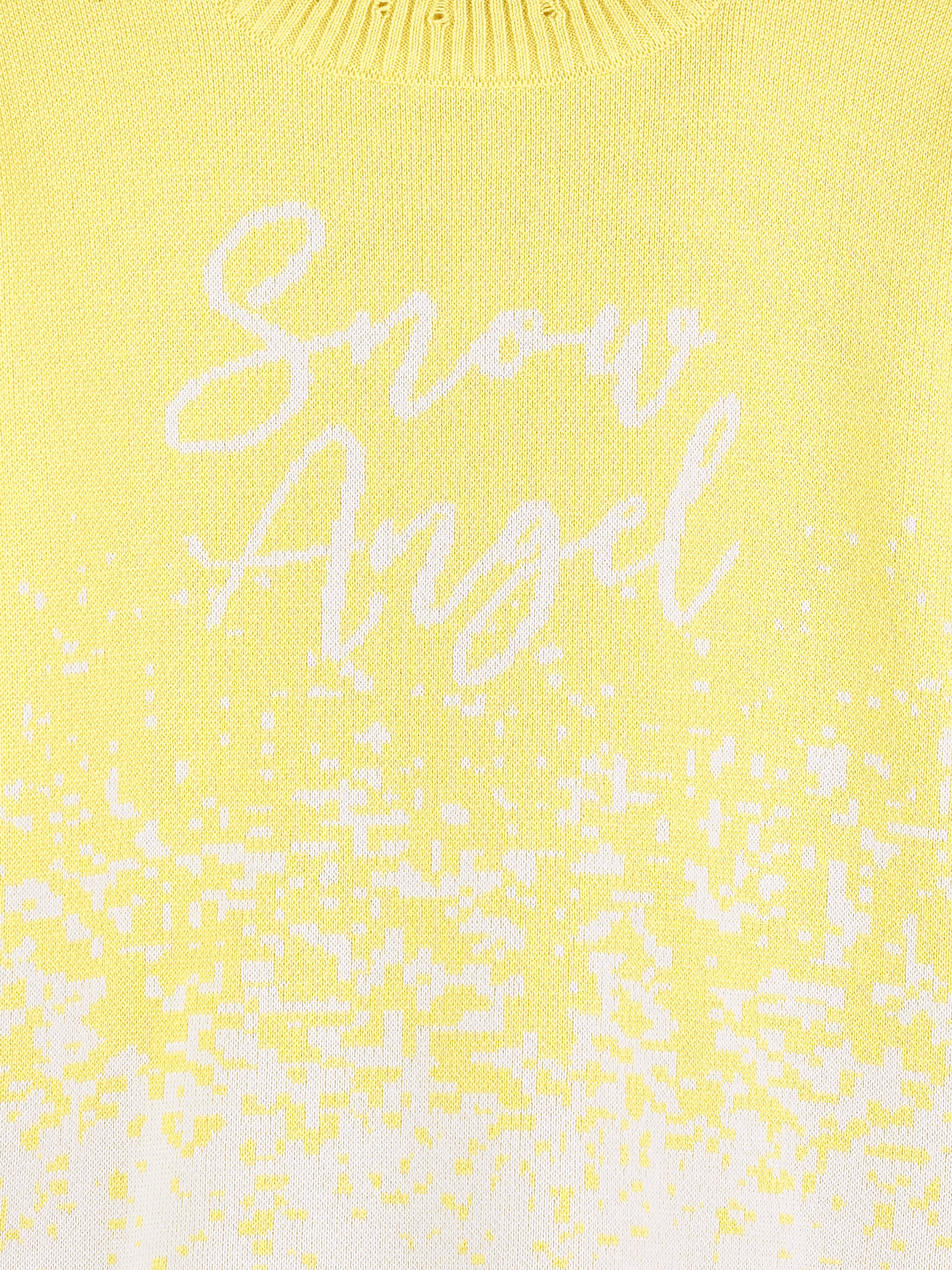 A yellow sweater with a white inscription against a background of falling snowflakes will give a feeling of coziness and become the perfect companion for a winter wardrobe. The round neckline and hem are finished with decorative distressing.