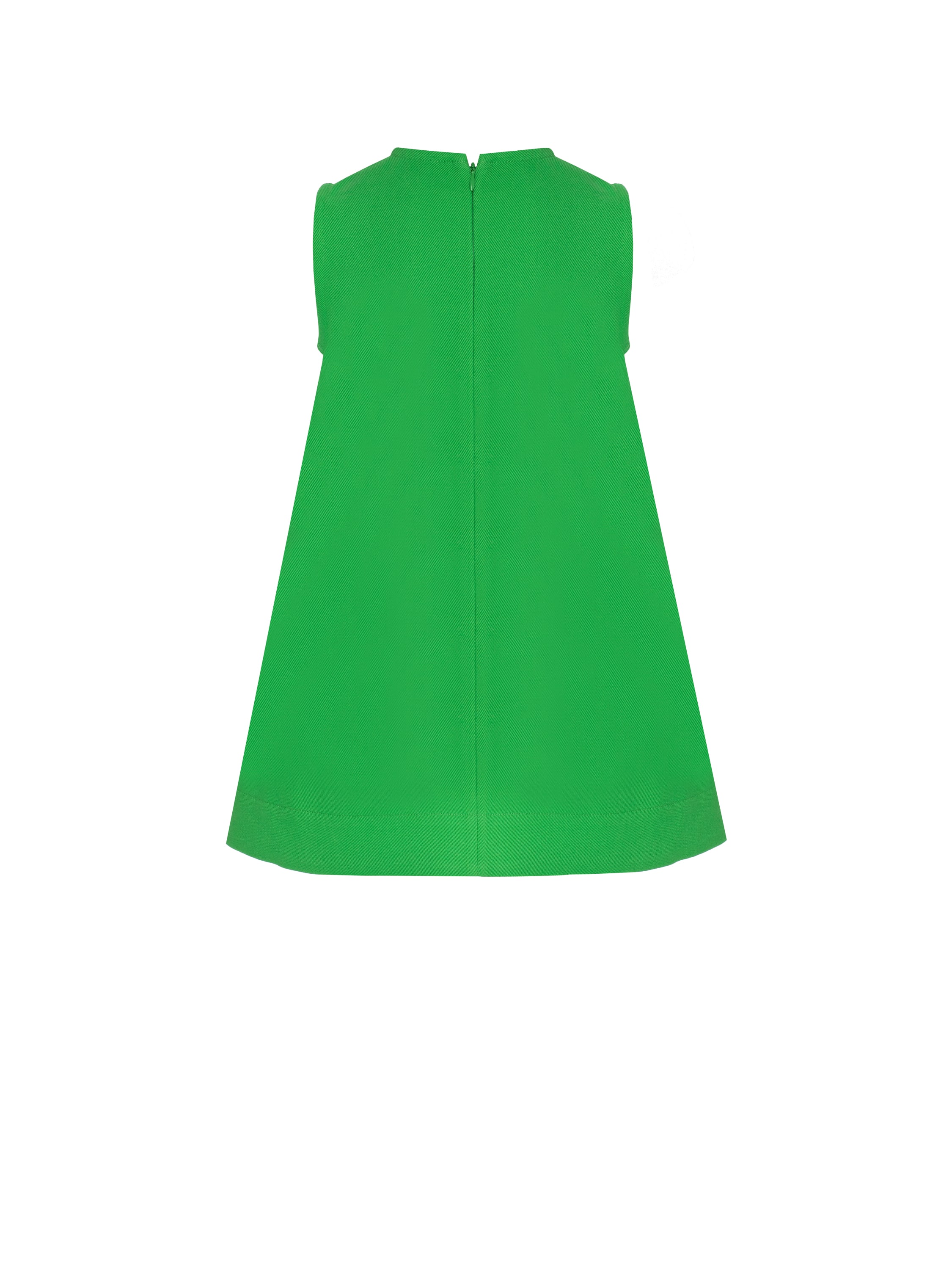 A green A-line children’s dress is made of practical denim. The solid-color loose-fit model is perfect for any occasion.