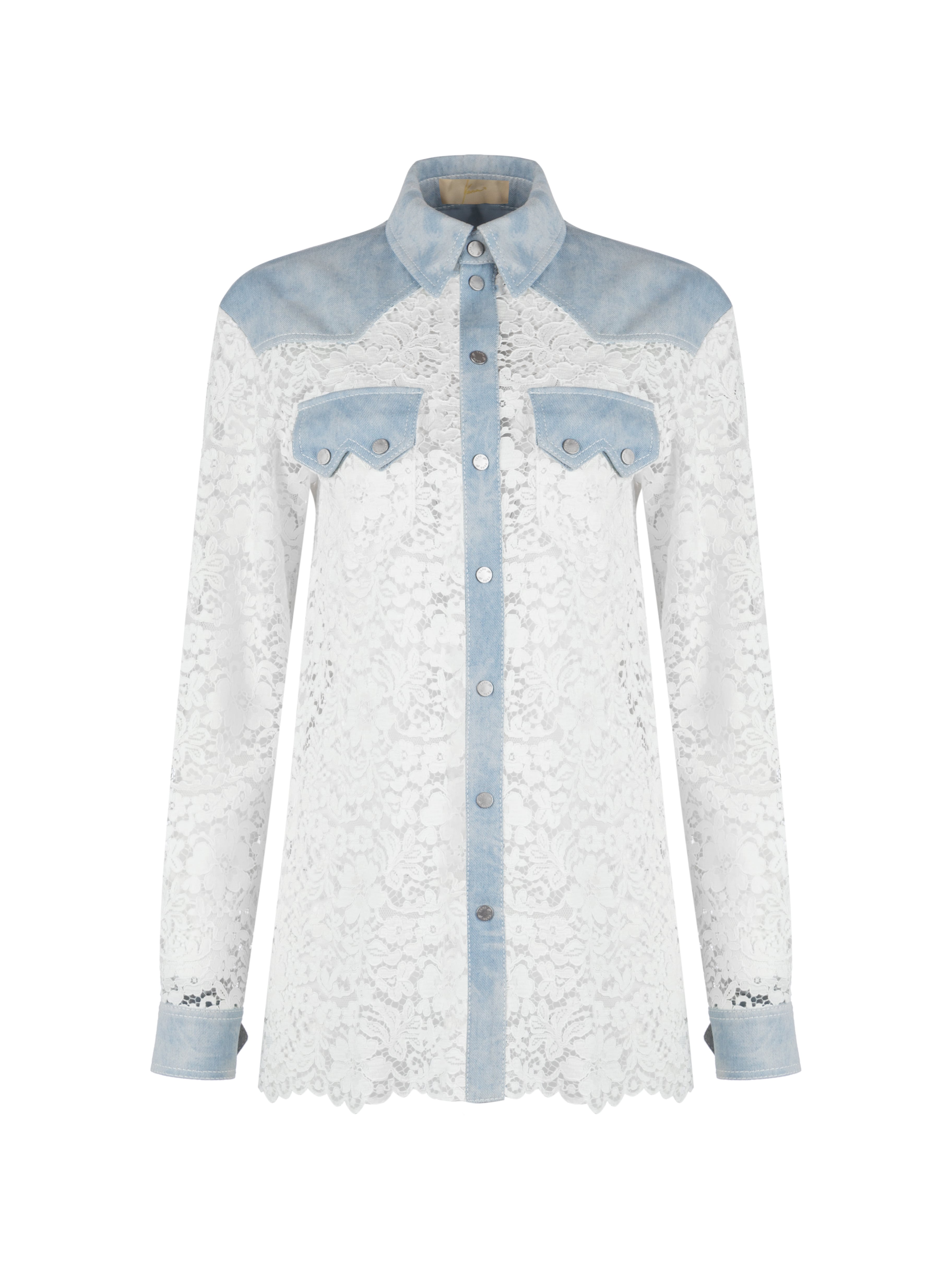 The white shirt is made of lace fabric and complemented by a yoke and shaped denim flaps on the pockets. The piece fastens with snaps at the front.