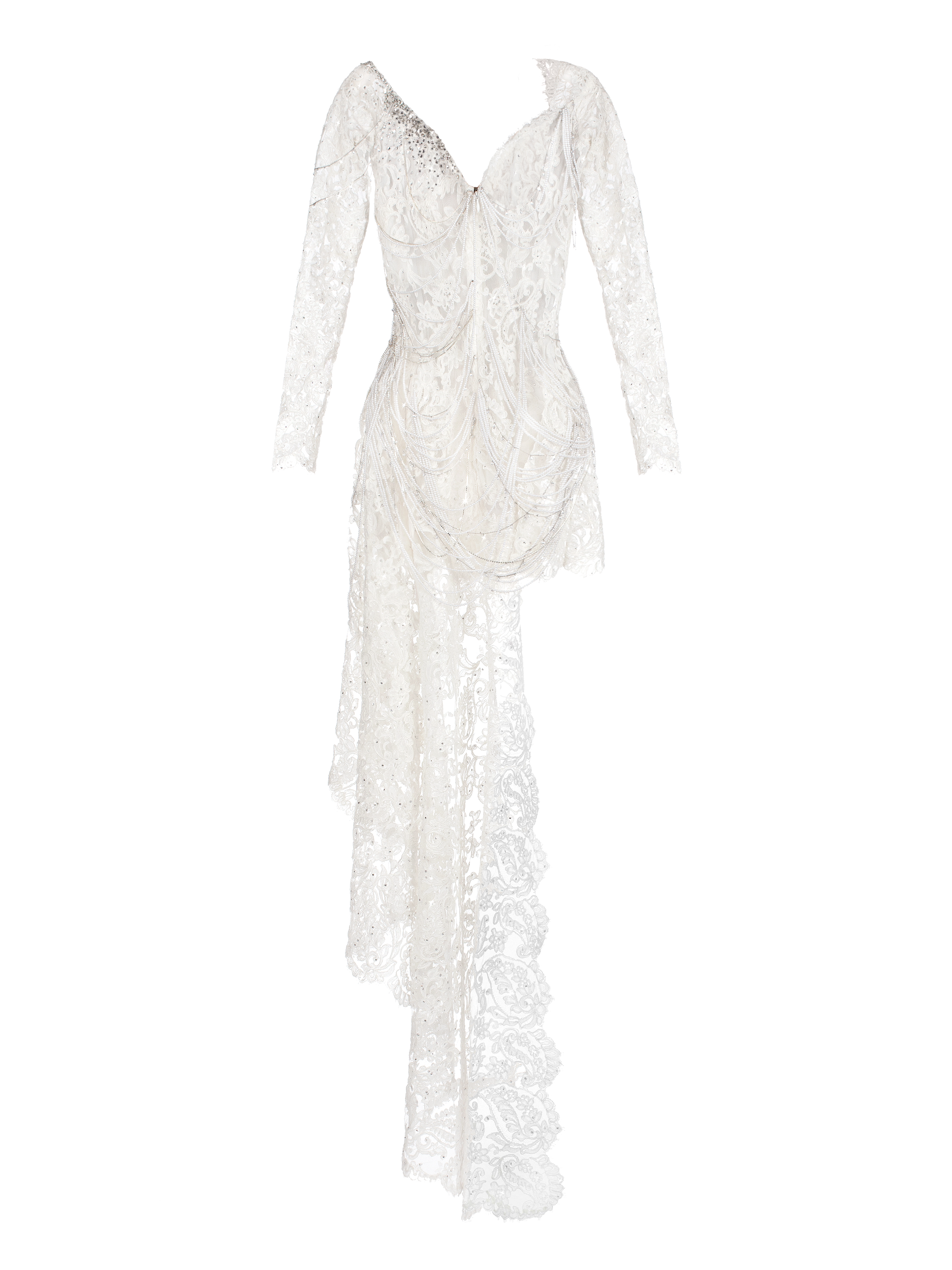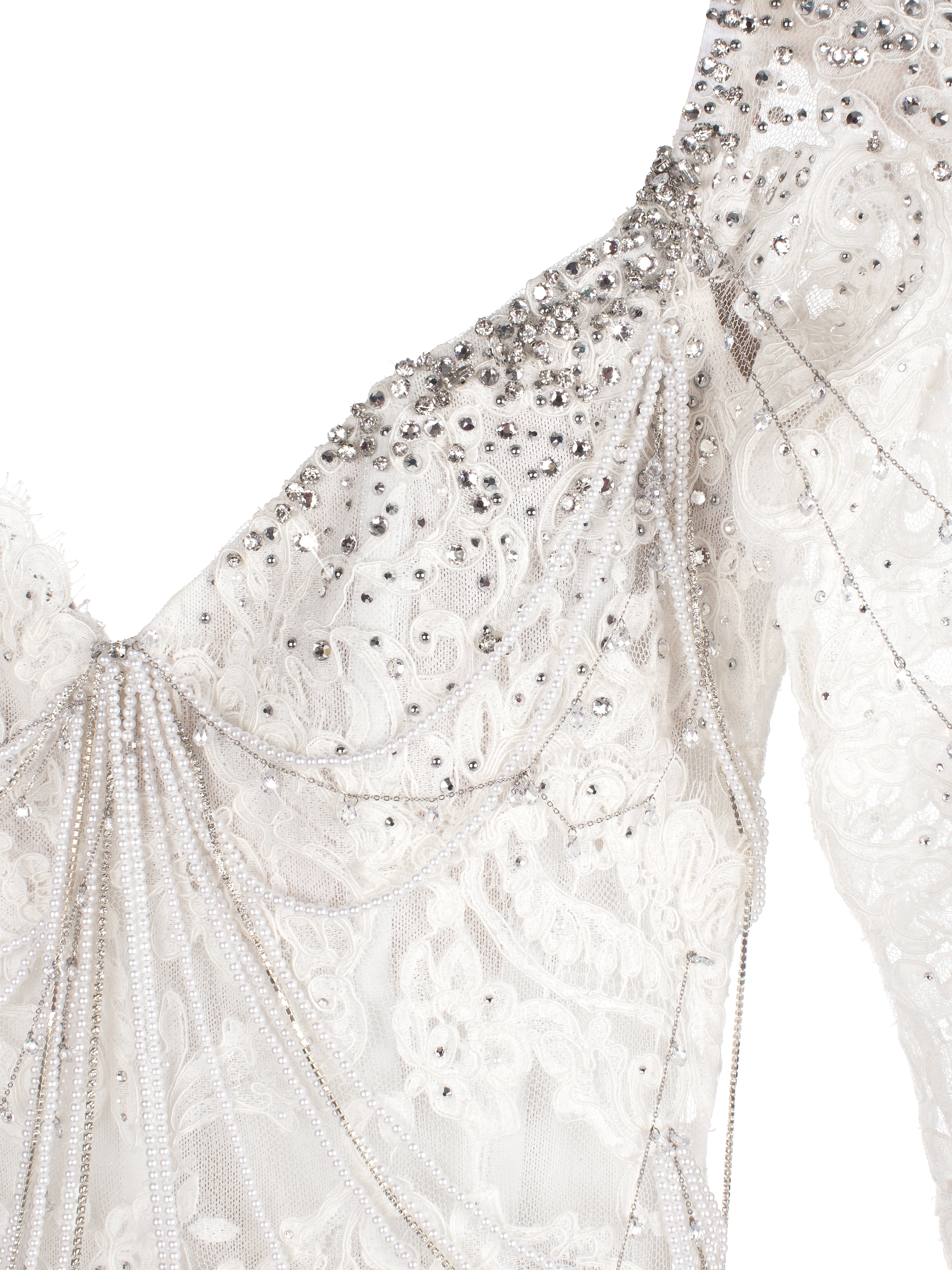A white dress with an elongated hem, long sleeves and bare shoulders, made of lace, will be an ideal choice for a flawless evening look. The brand’s craftsmen manually decorated the model with rhinestones and pearl and silver chains with crystal stones.