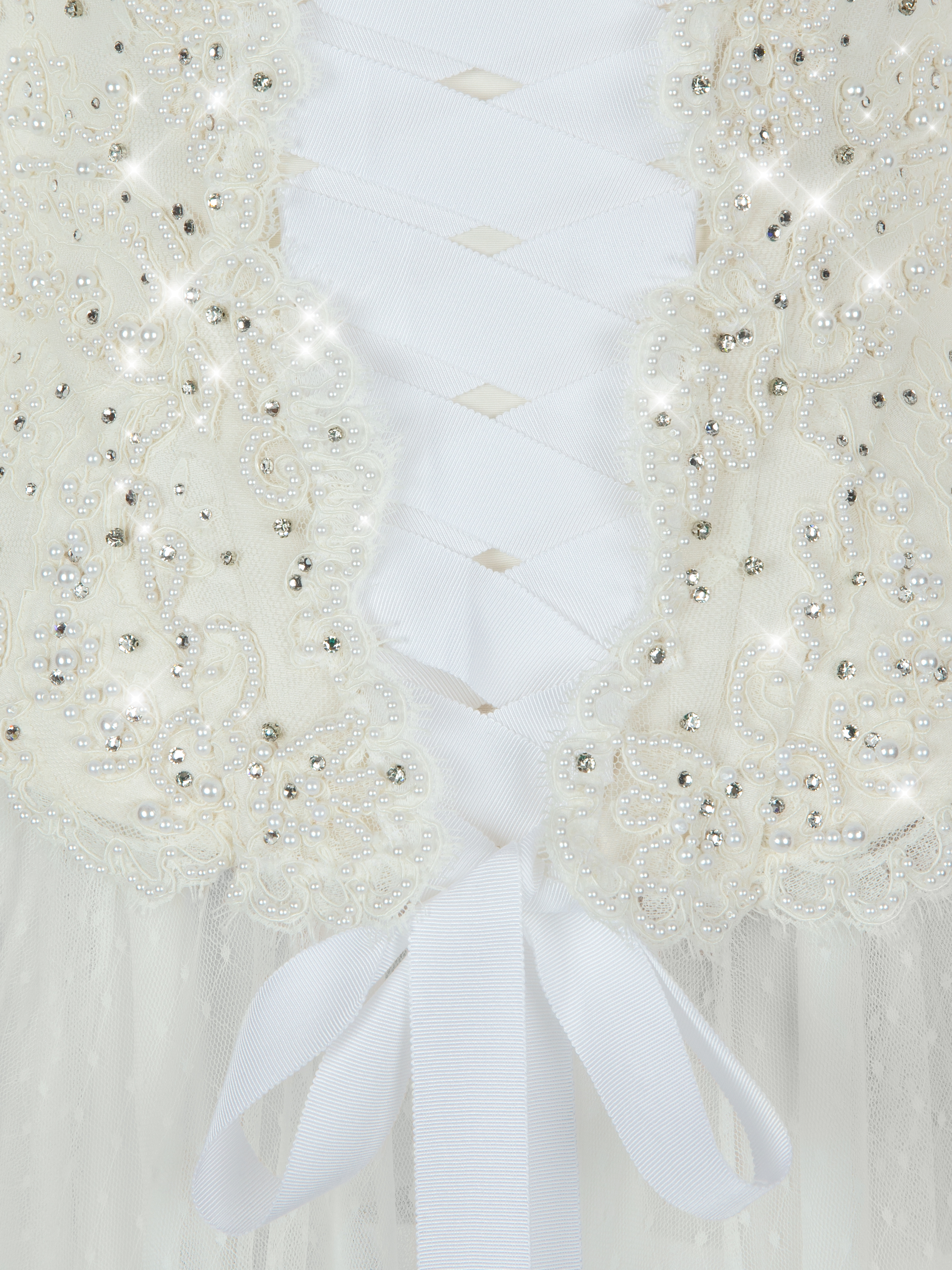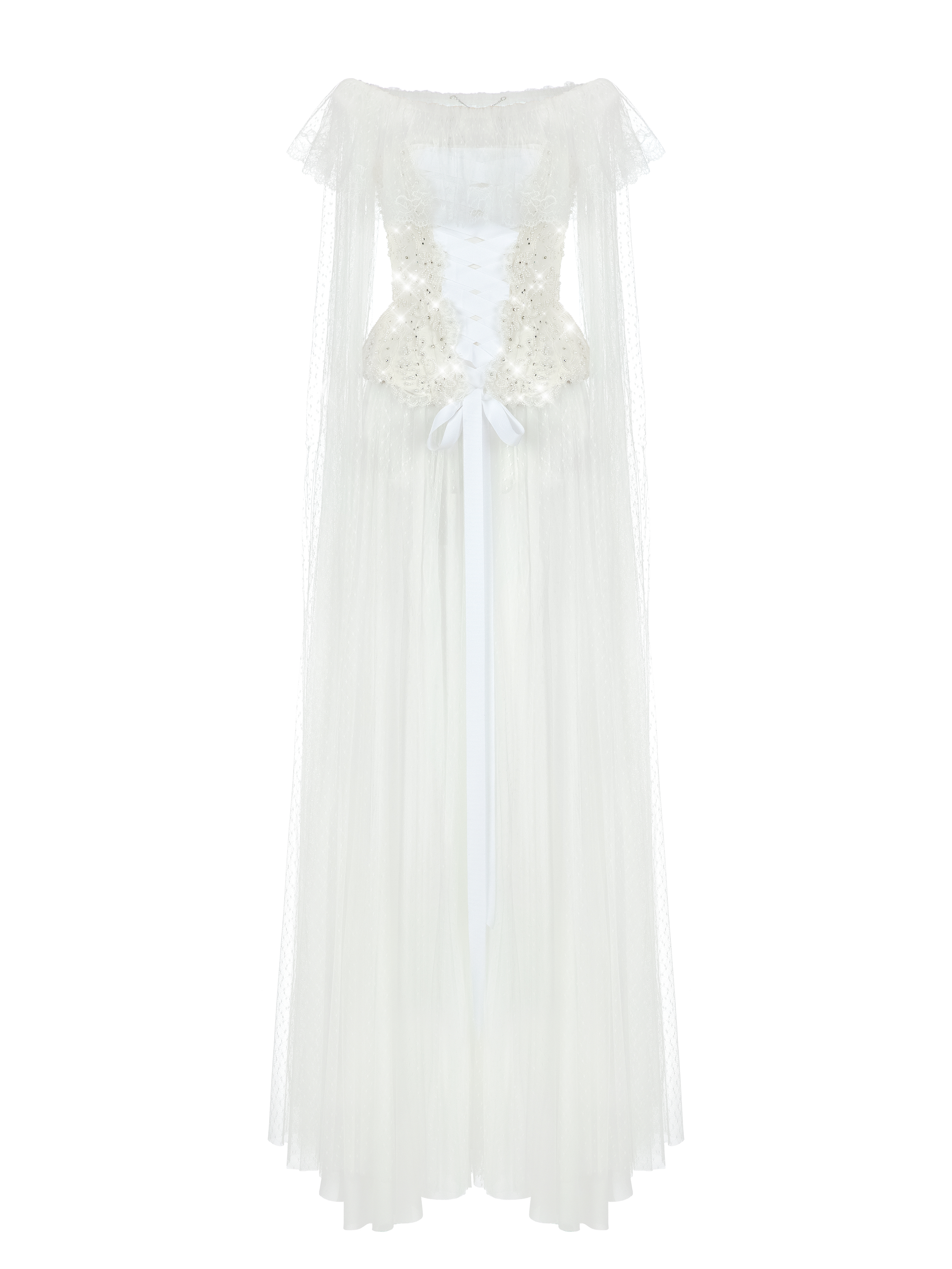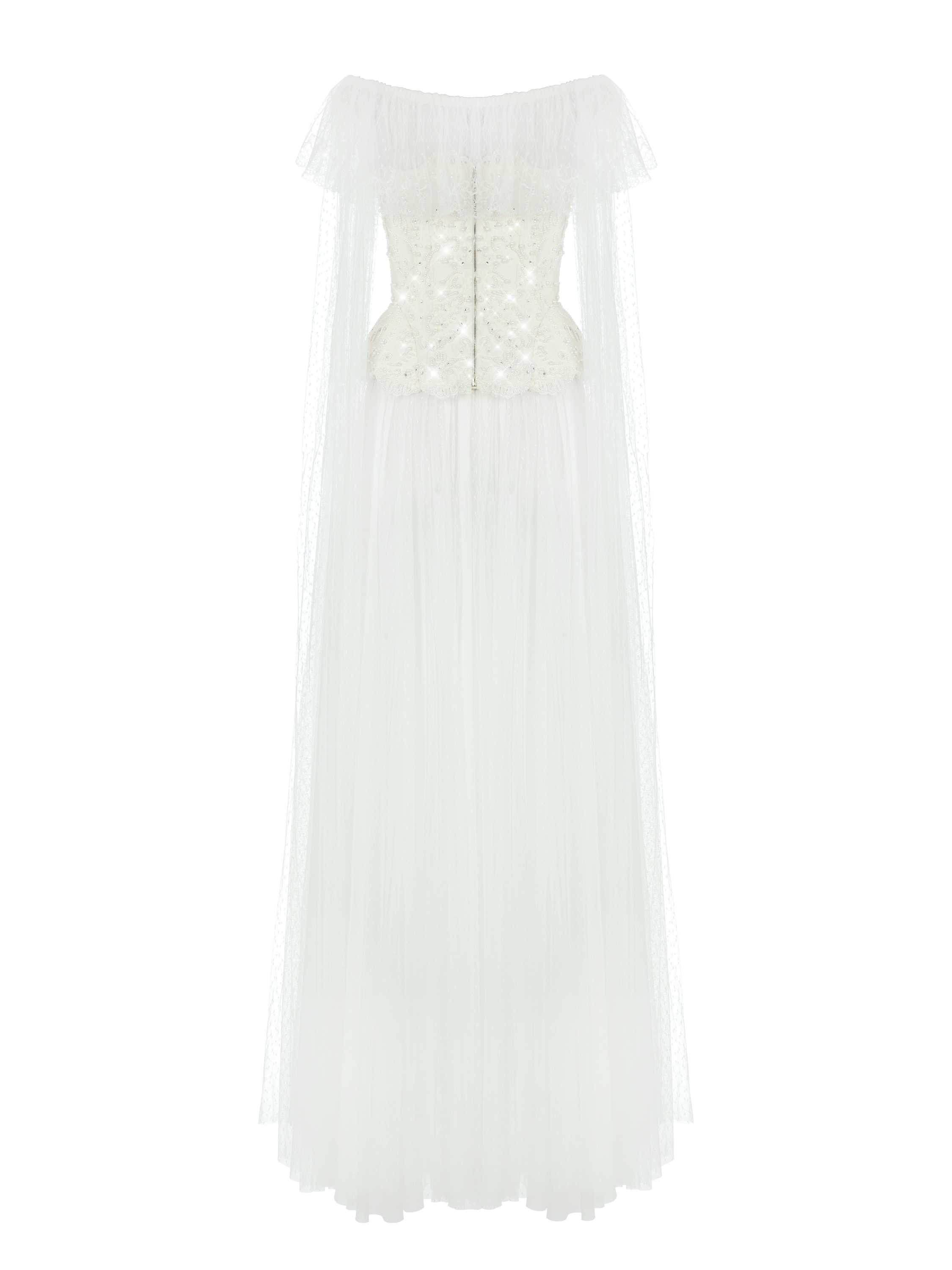 A white semi-sheer maxi dress with bare shoulders and a high front slit. The piece is complemented by a ruffle on the shoulders and a lace corset hand-embellished with pearls and crystals. Fastens with a back zipper.
