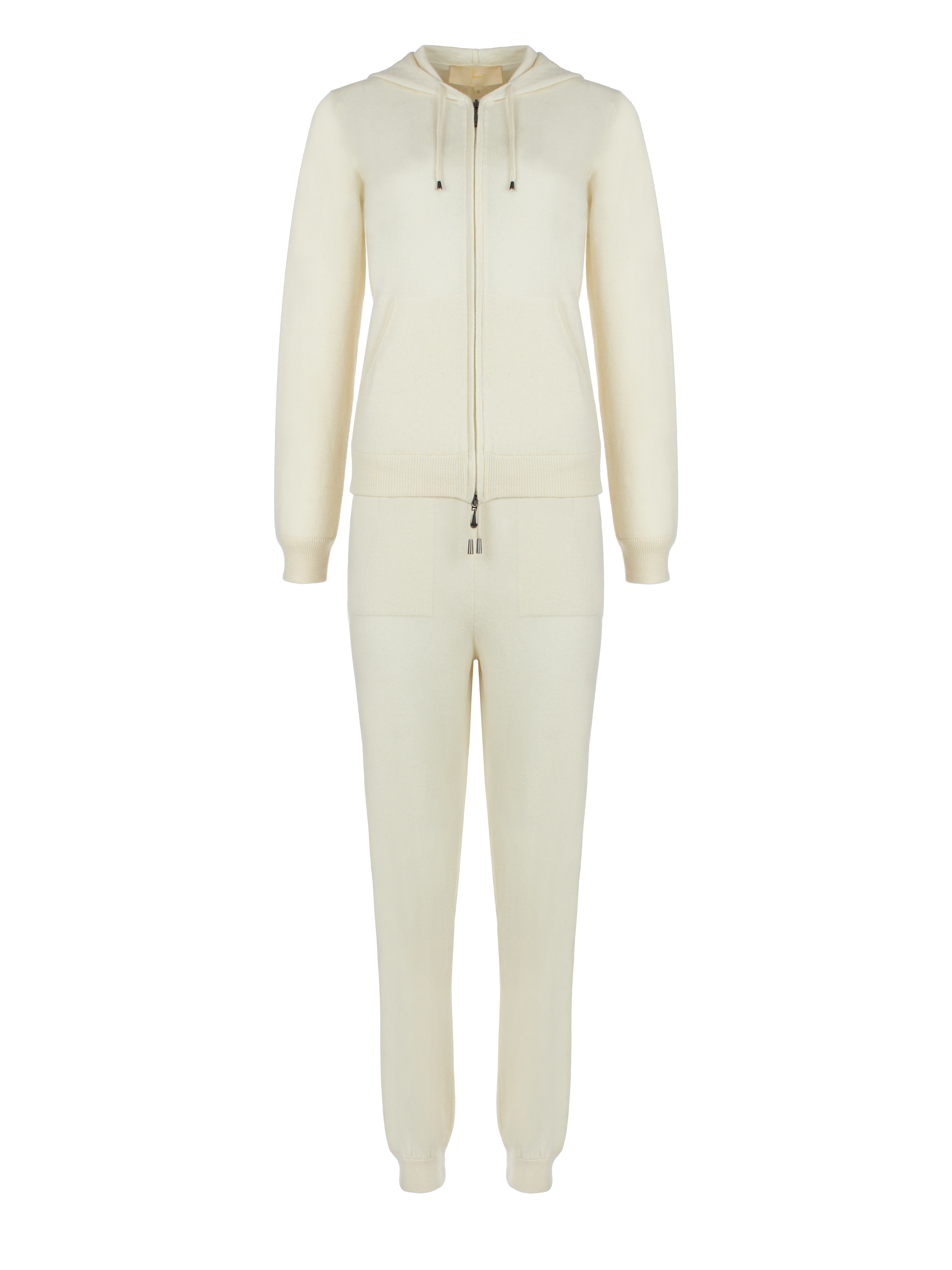 The white cashmere set consists of a zip-up hoodie and cuffed pants. The pants are complemented by a wide elastic waistband with drawstrings and two front welt pockets.