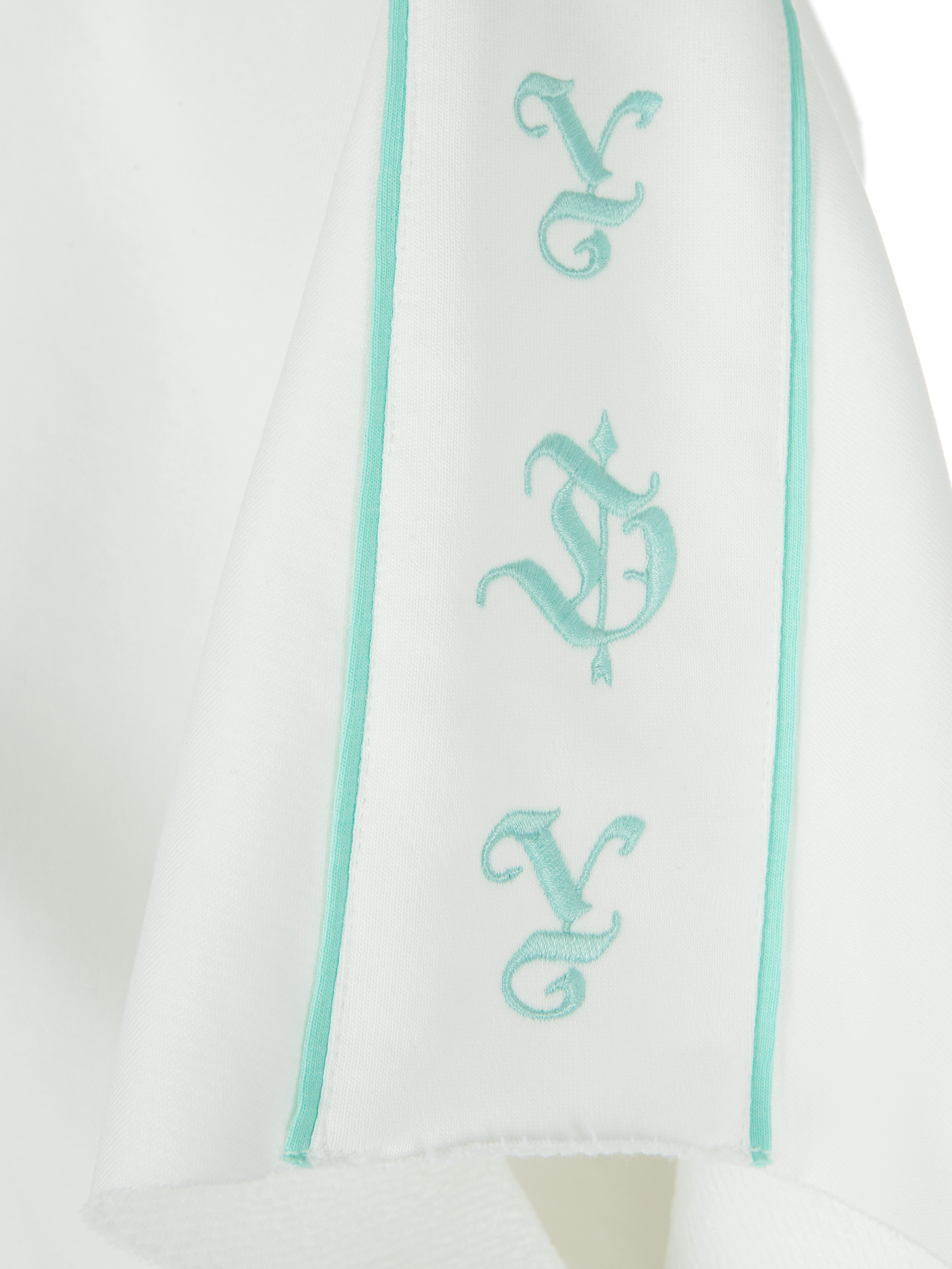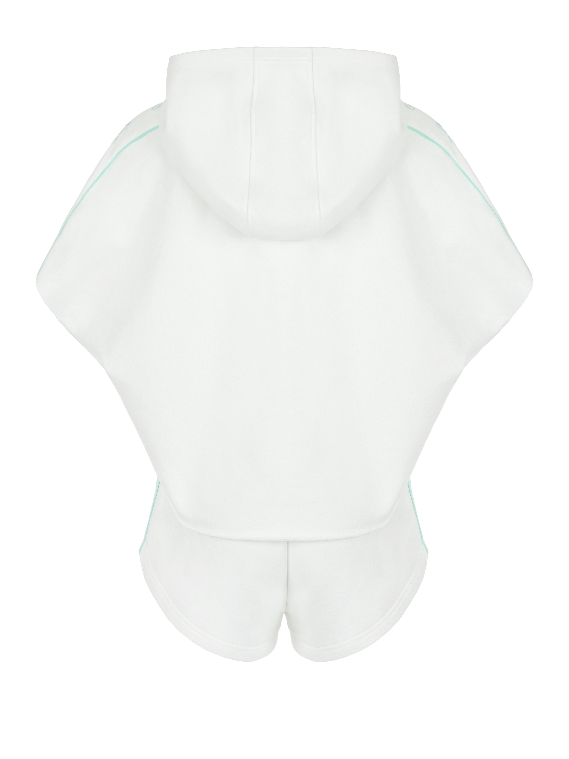 A white summer knit set consists of an oversized square-cut sleeveless hoodie and short elastic-waist shorts. The design is complemented by side stripes with mint logo embroidery.