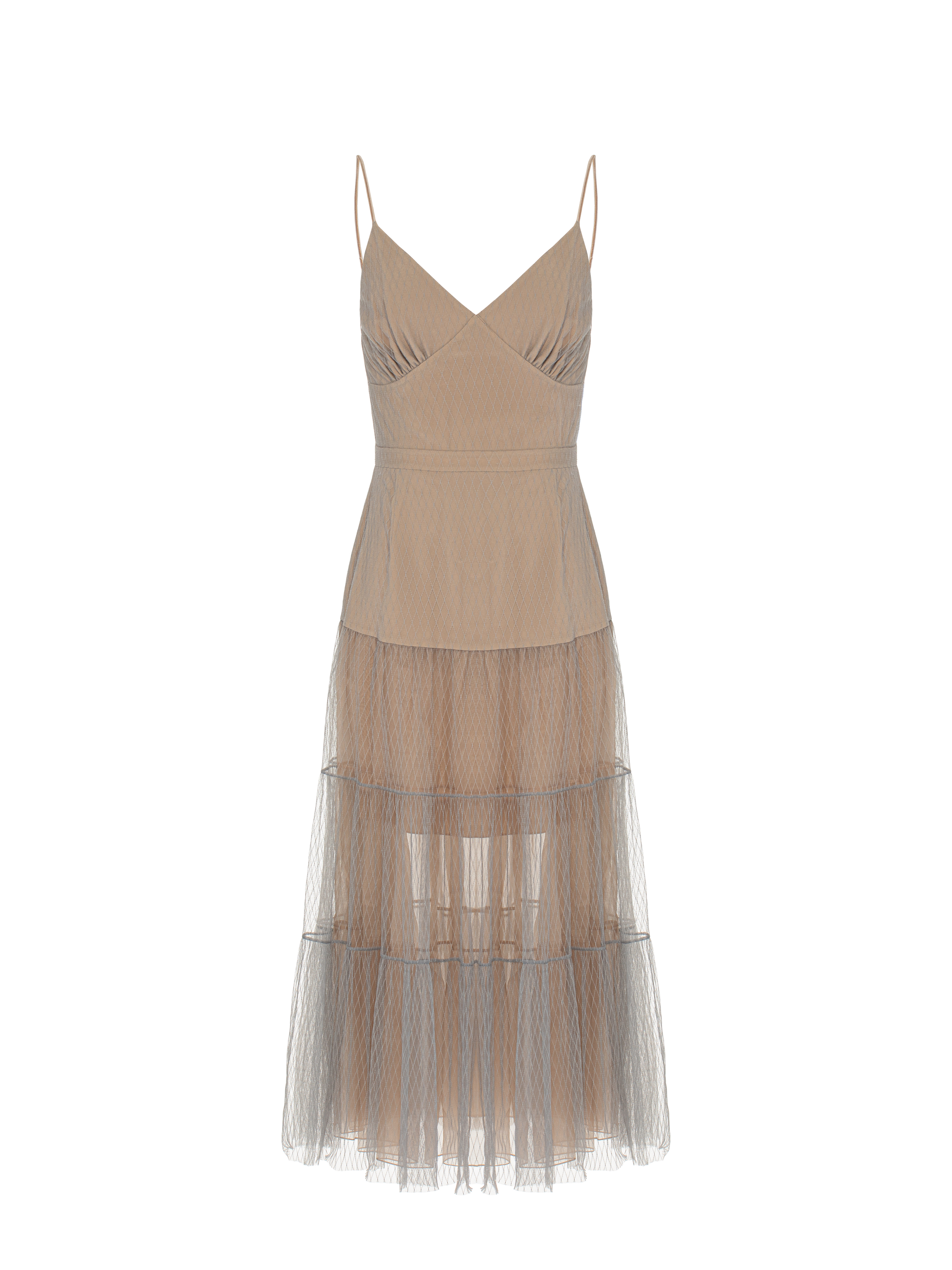 A beige midi dress on thin straps with an open back is made of semi-sheer mesh with diamond-shaped embroidery. The hem is cut in three tiers and complemented by an underskirt made of organza. Fastening with pearl buttons and tassel ties at the back.