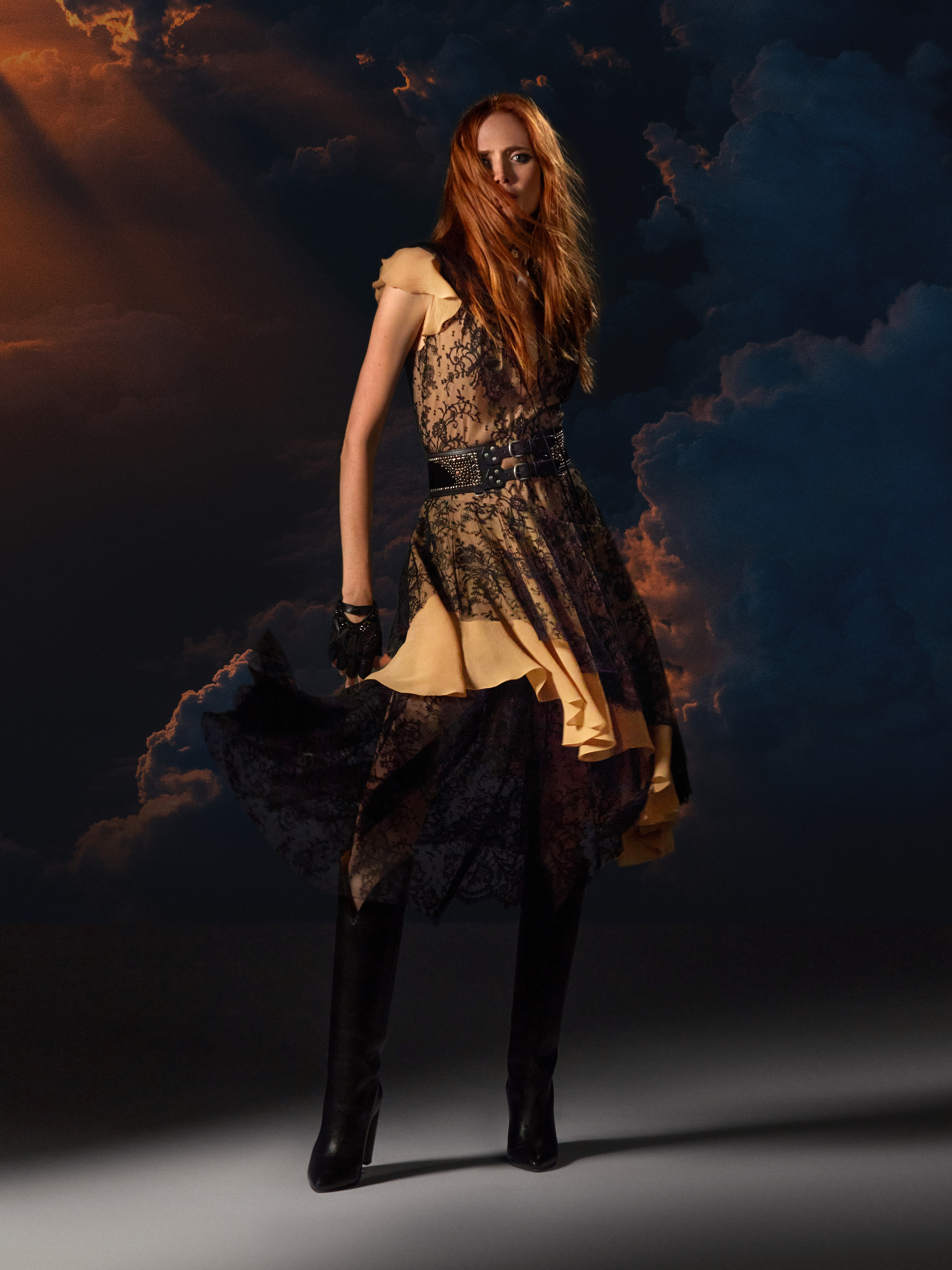Two-layer midi dress with short sleeves made of lightweight beige chiffon and semi-sheer black lace. The model is complemented by an asymmetric hem, ruffles on the shoulders and skirt, and ties with feather tassels at the V-neckline. Fastens with a zipper at the back.