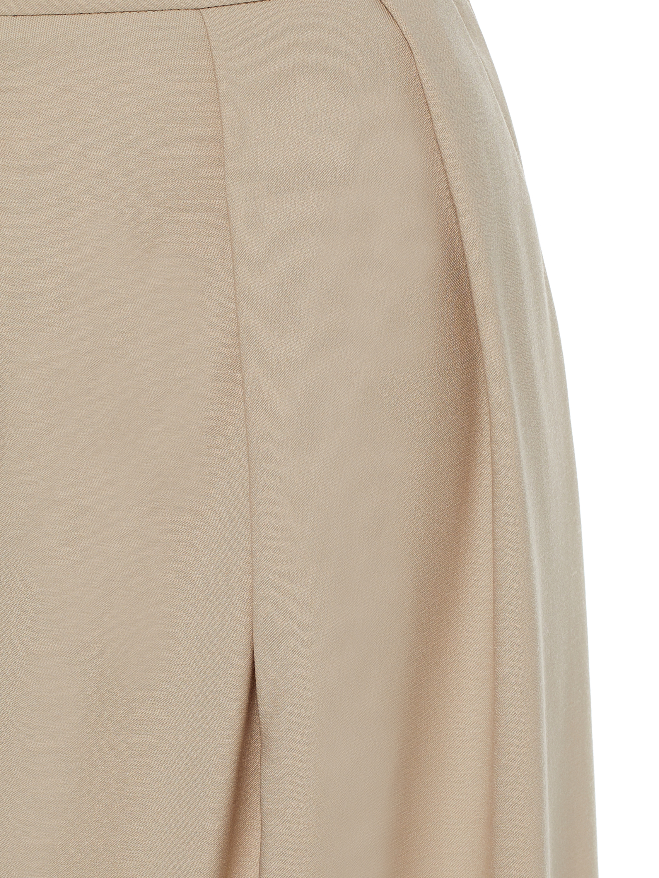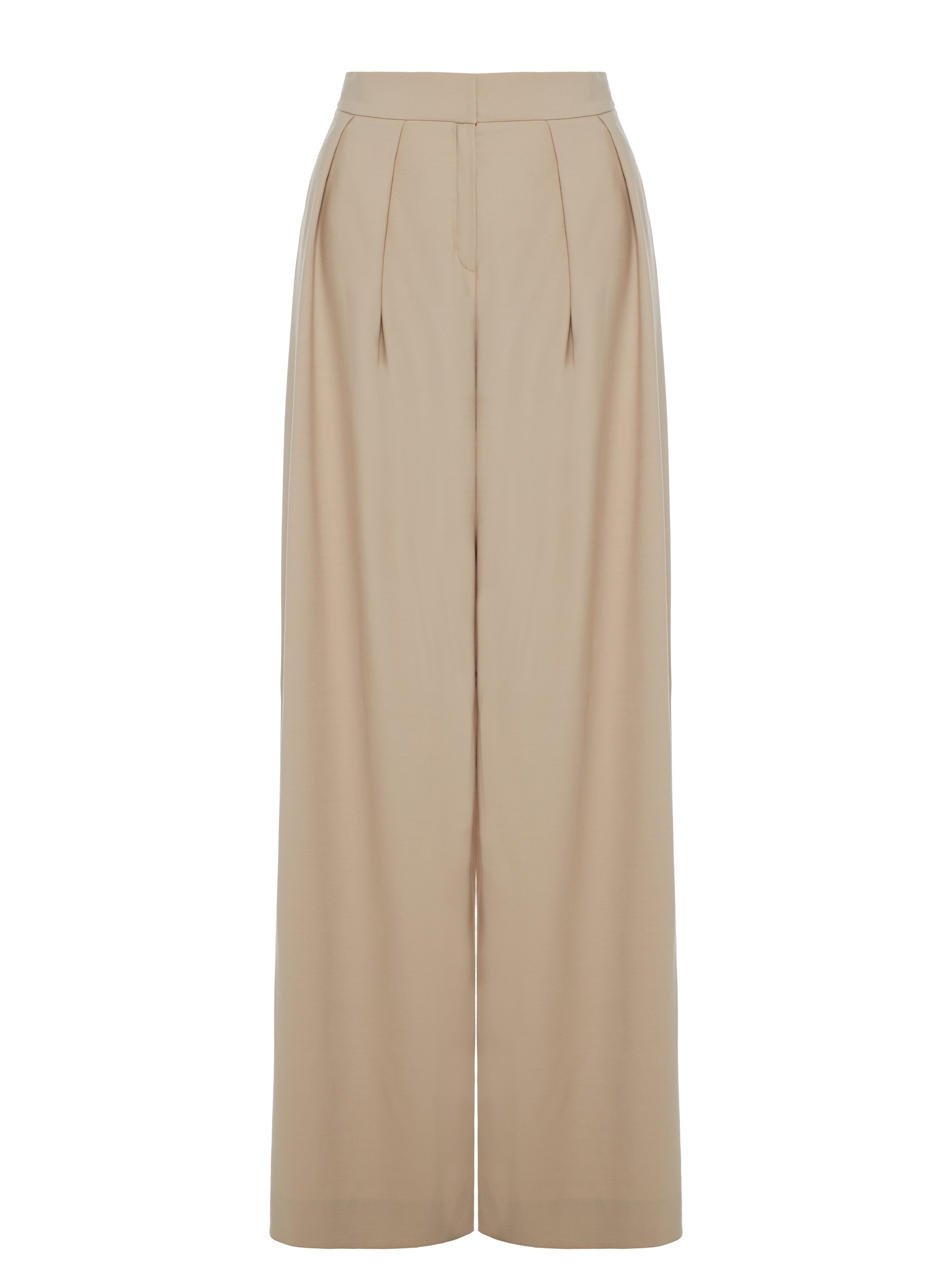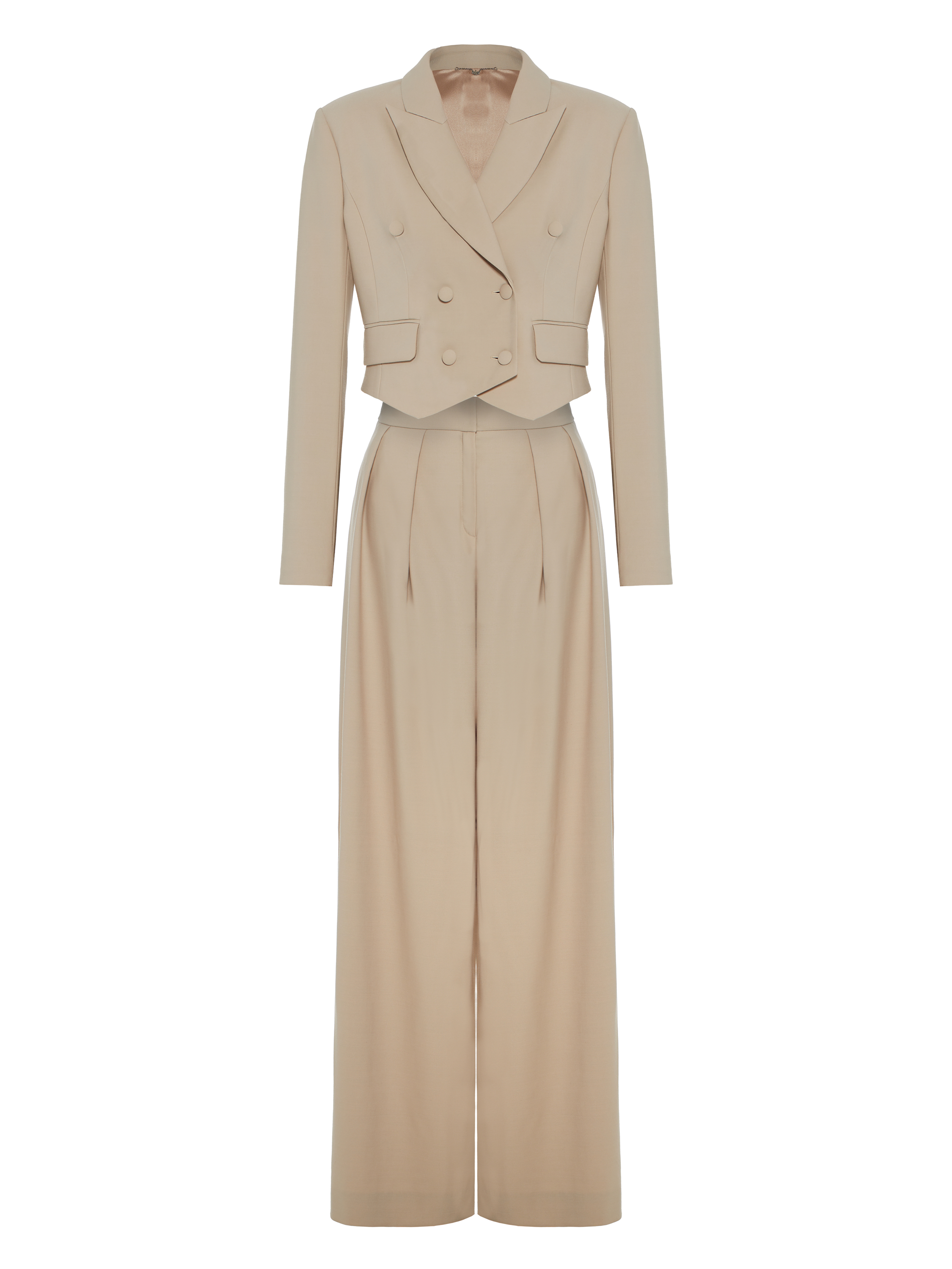 The beige trouser suit in the designer interpretation of the Yana fashion house consists of a cropped double-breasted jacket and wide high-waisted trousers. The suit is made of natural wool. The jacket is complemented by a shaped hem and two welt pockets with flaps on the sides.