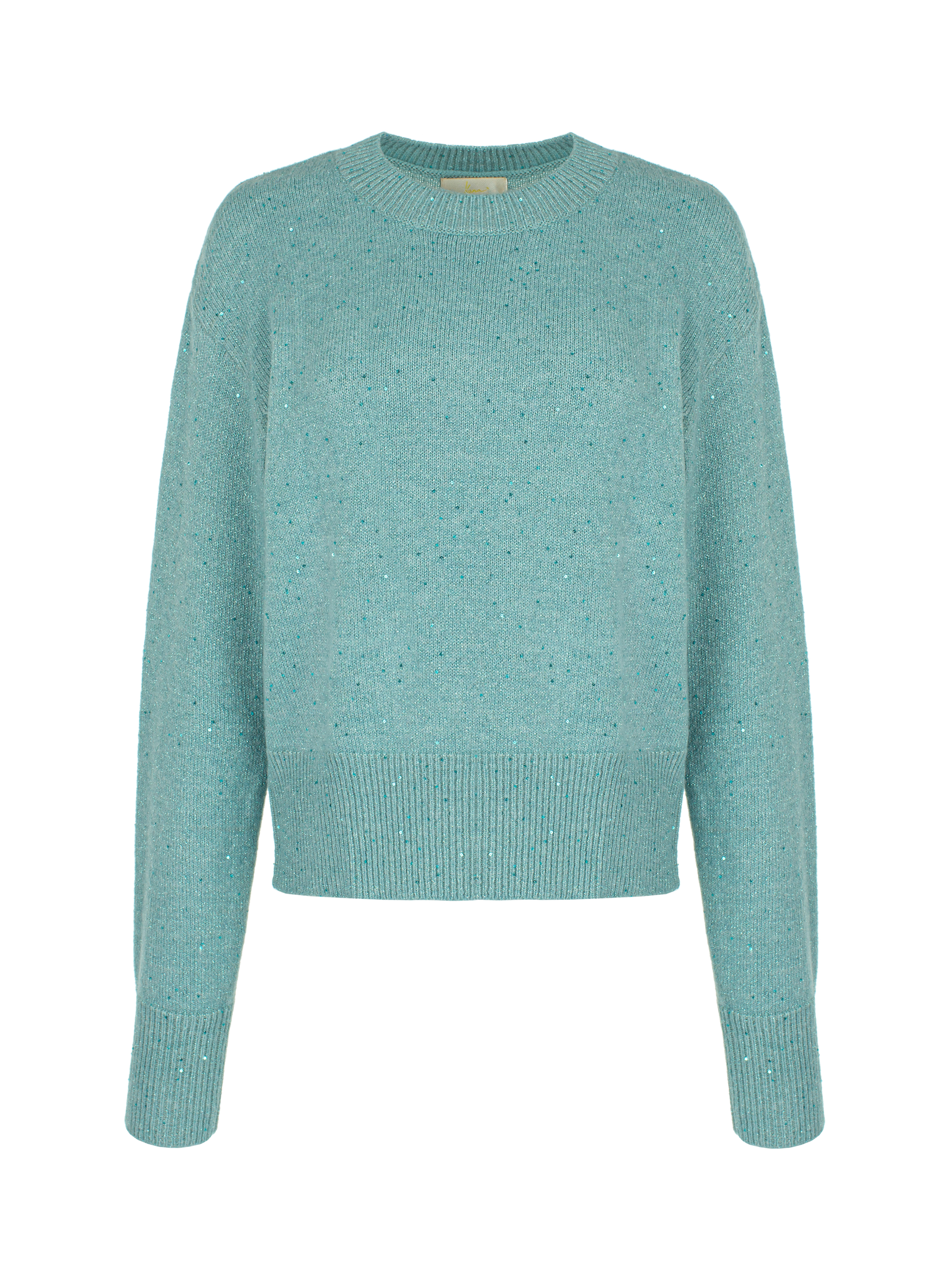 The pullover is made of blended turquoise cashmere with lurex and shimmering sequins. Loose fit, round neckline and elegant dropped shoulder line.