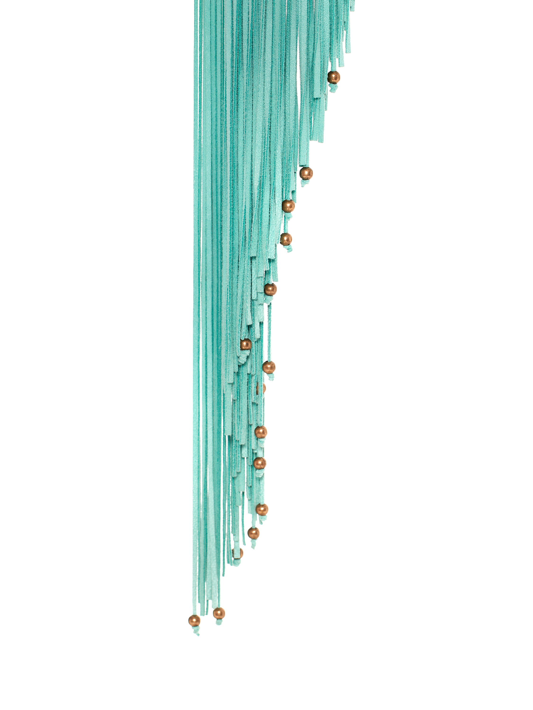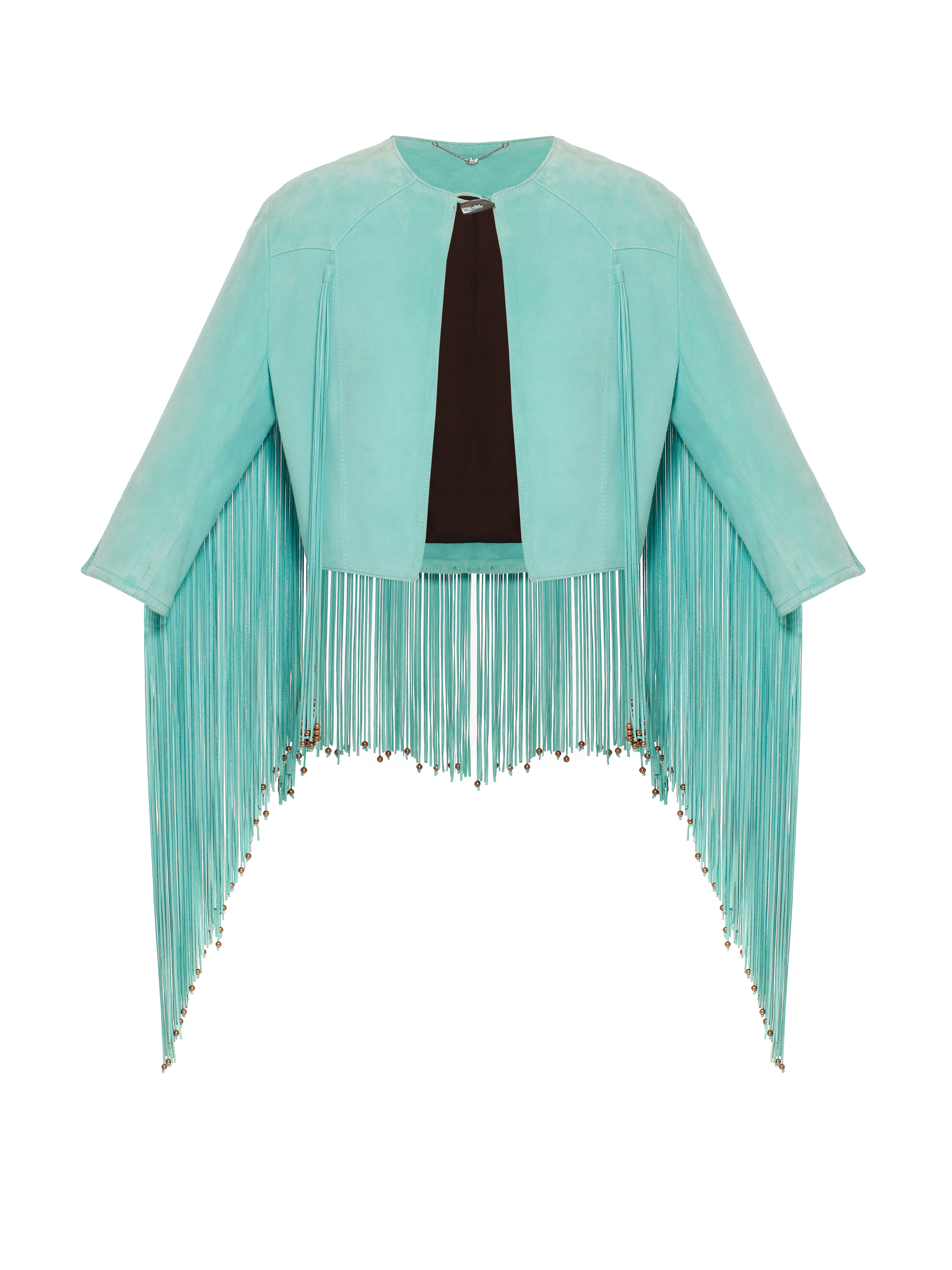 The cropped jacket is made of soft turquoise suede. The model is complemented by 3/4 sleeves, a round neckline and a lining made of natural silk. The jacket is decorated with matching fringe with brown beads along the hem and floral embroidery with shimmering beads on the back.
