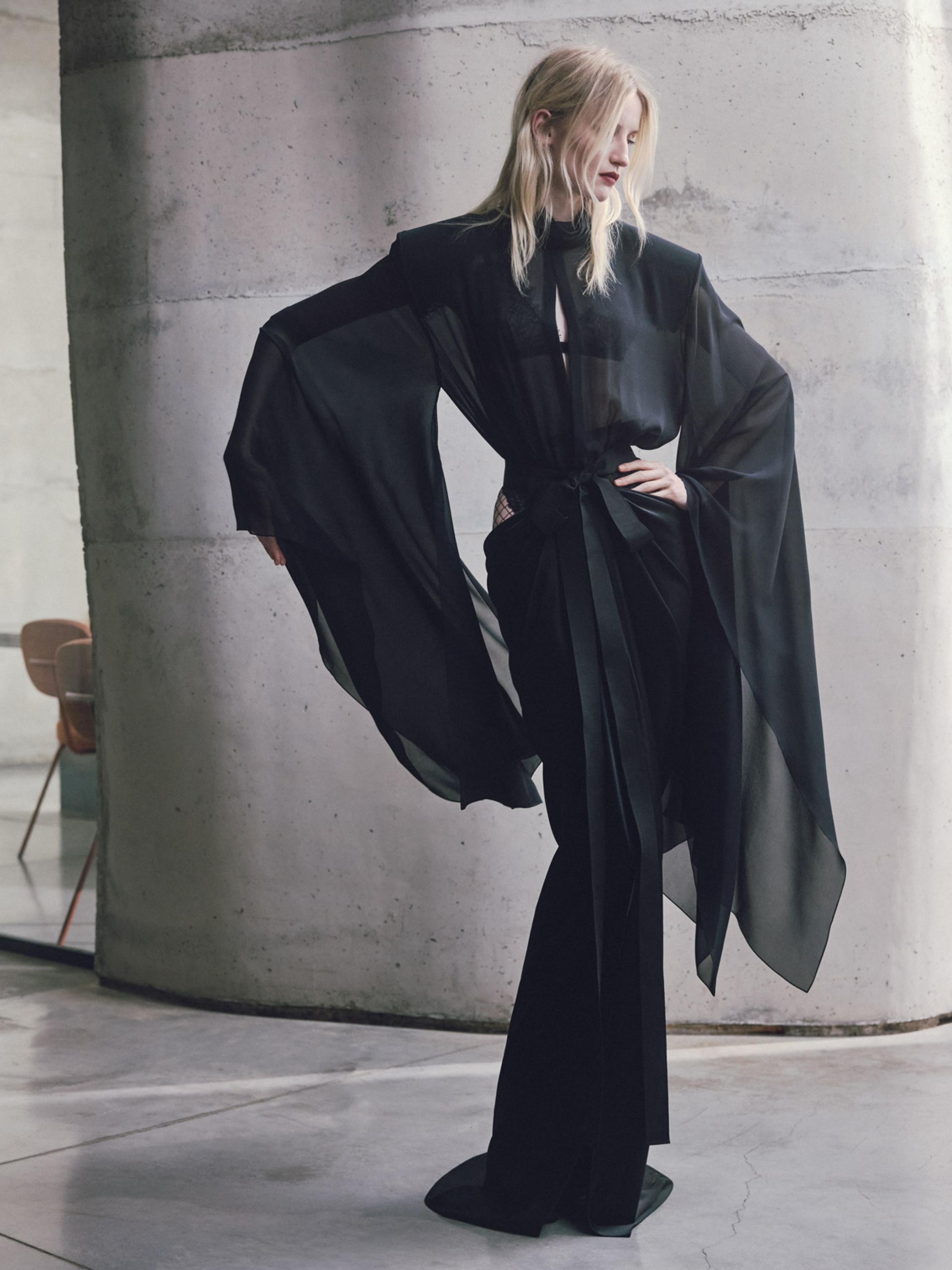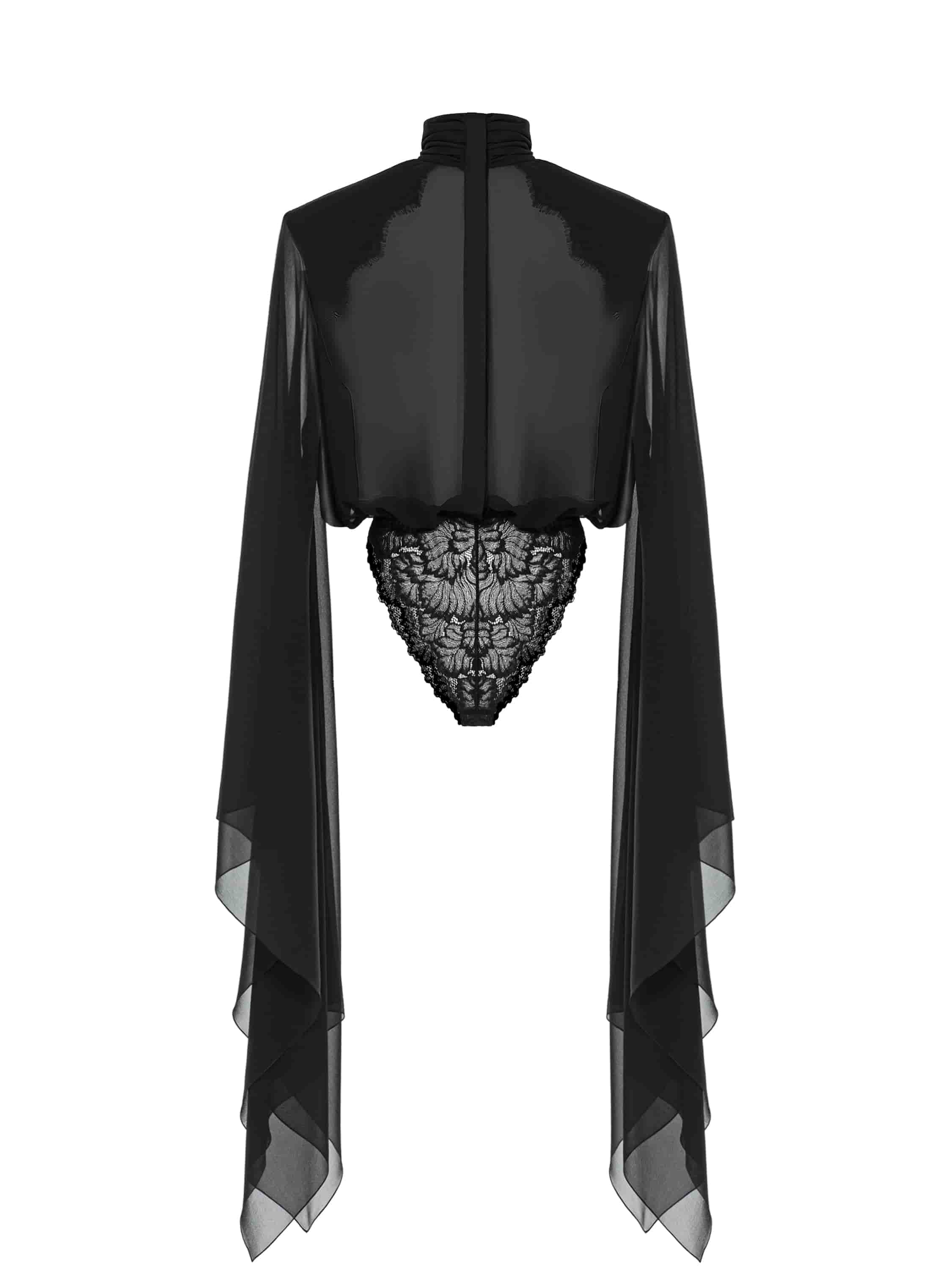 The bodysuit blouse with long kimono sleeves and a neat stand collar is made of black silk chiffon. The lace bottom gives the piece a special charm, becoming a seductive accent in the look.