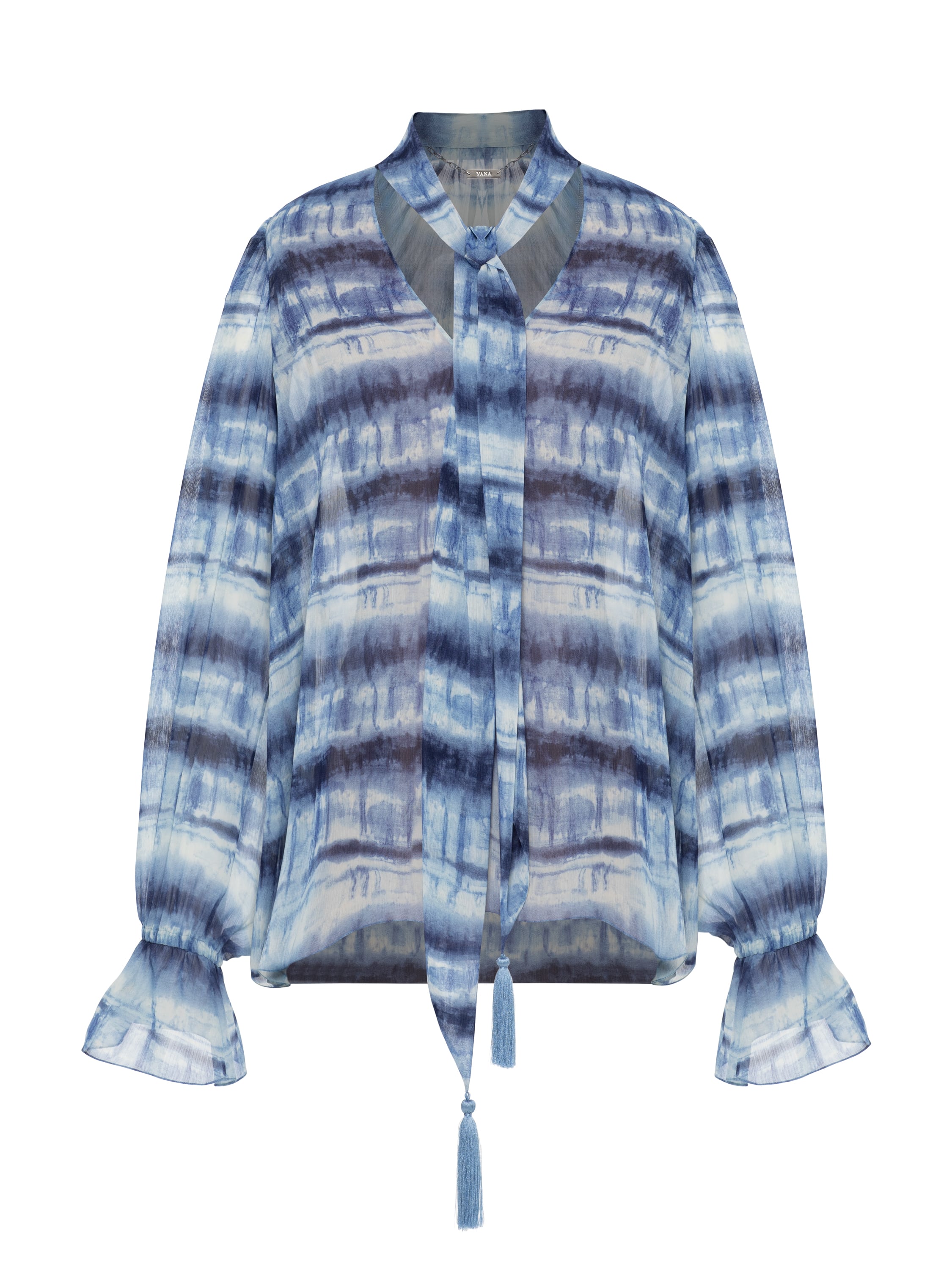 The white and blue striped blouse with long sleeves is made of lightweight, pleasant-to-the-skin chiffon. The loose-fit model is complemented by handmade tassel ties in the spirit of Boho Chic.