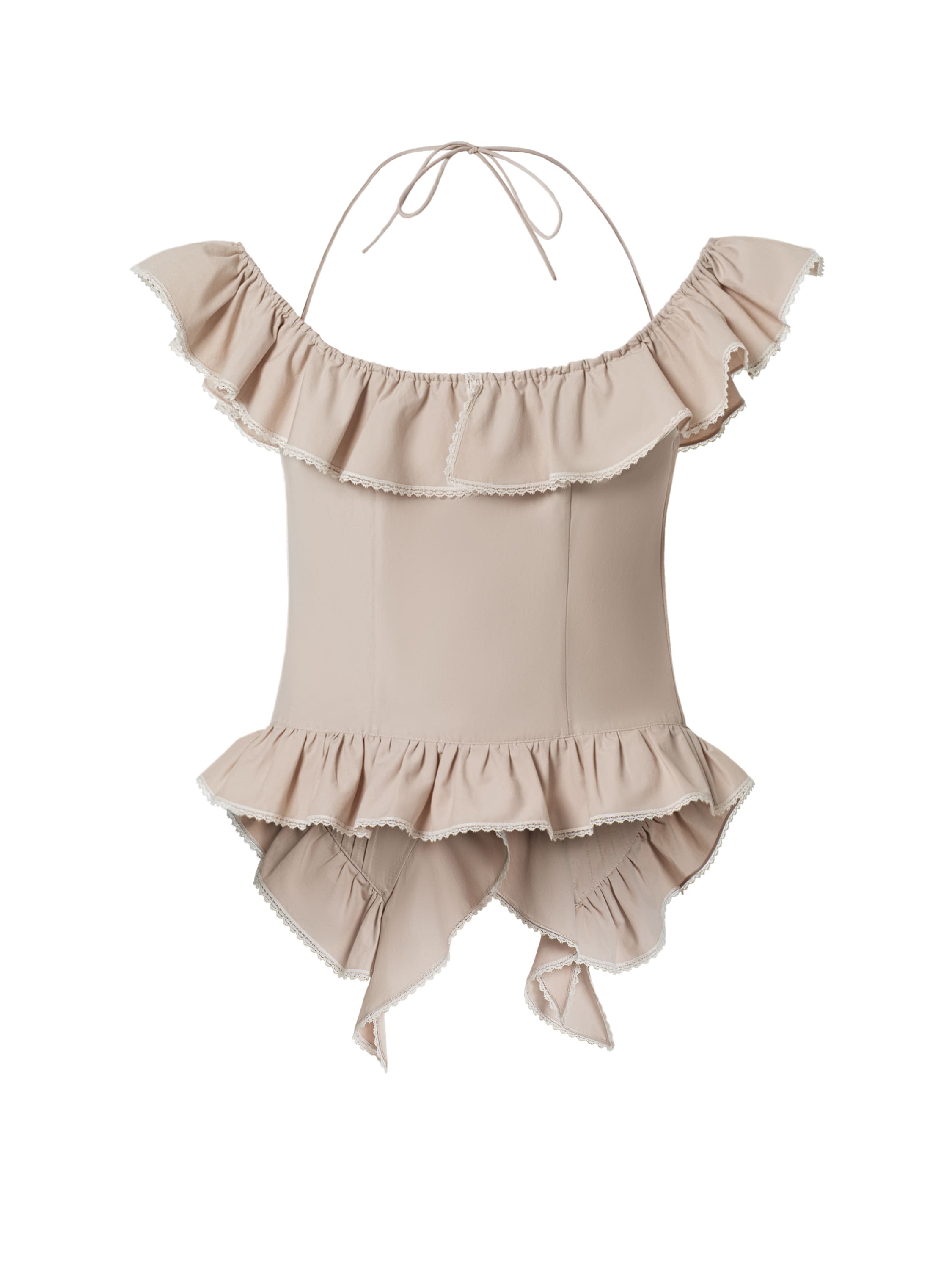 A beige off‑shoulder top made of soft, body‑friendly cotton fabric. The model is decorated with romantic ruffles and lace trim. Adjustable ties.