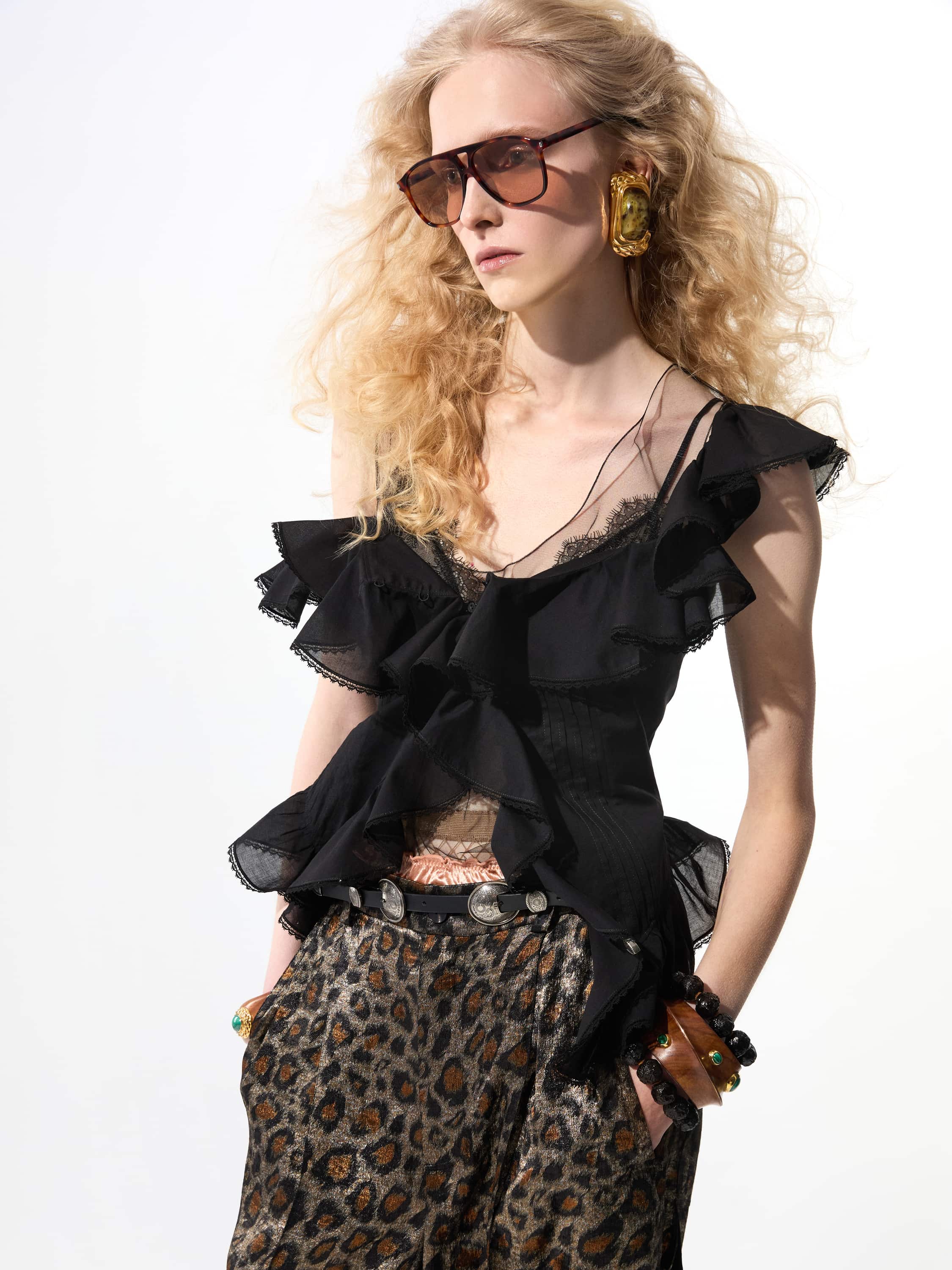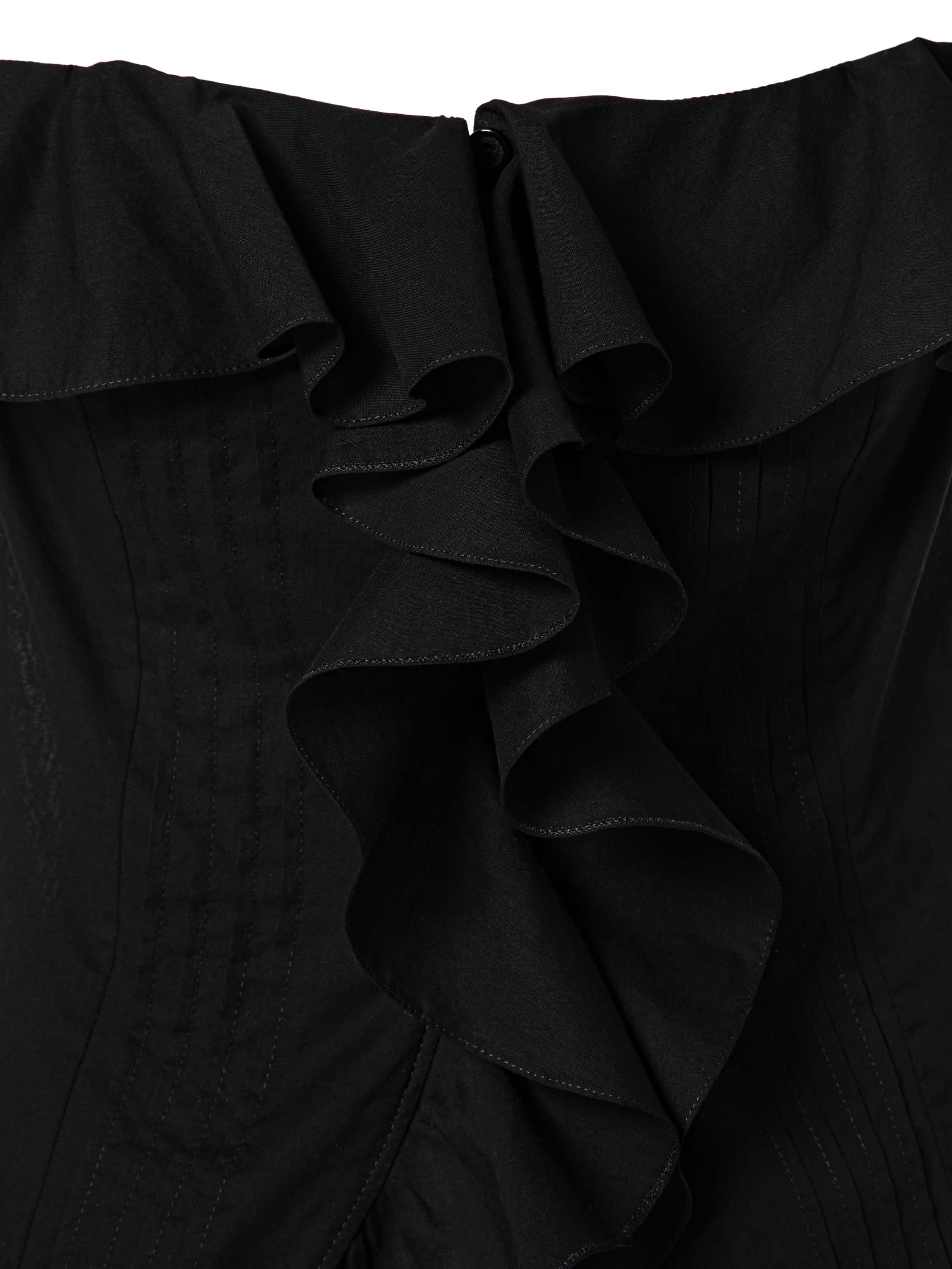 A black off‑shoulder top made of soft, body‑friendly cotton fabric. The model is decorated with romantic ruffles. Adjustable ties.