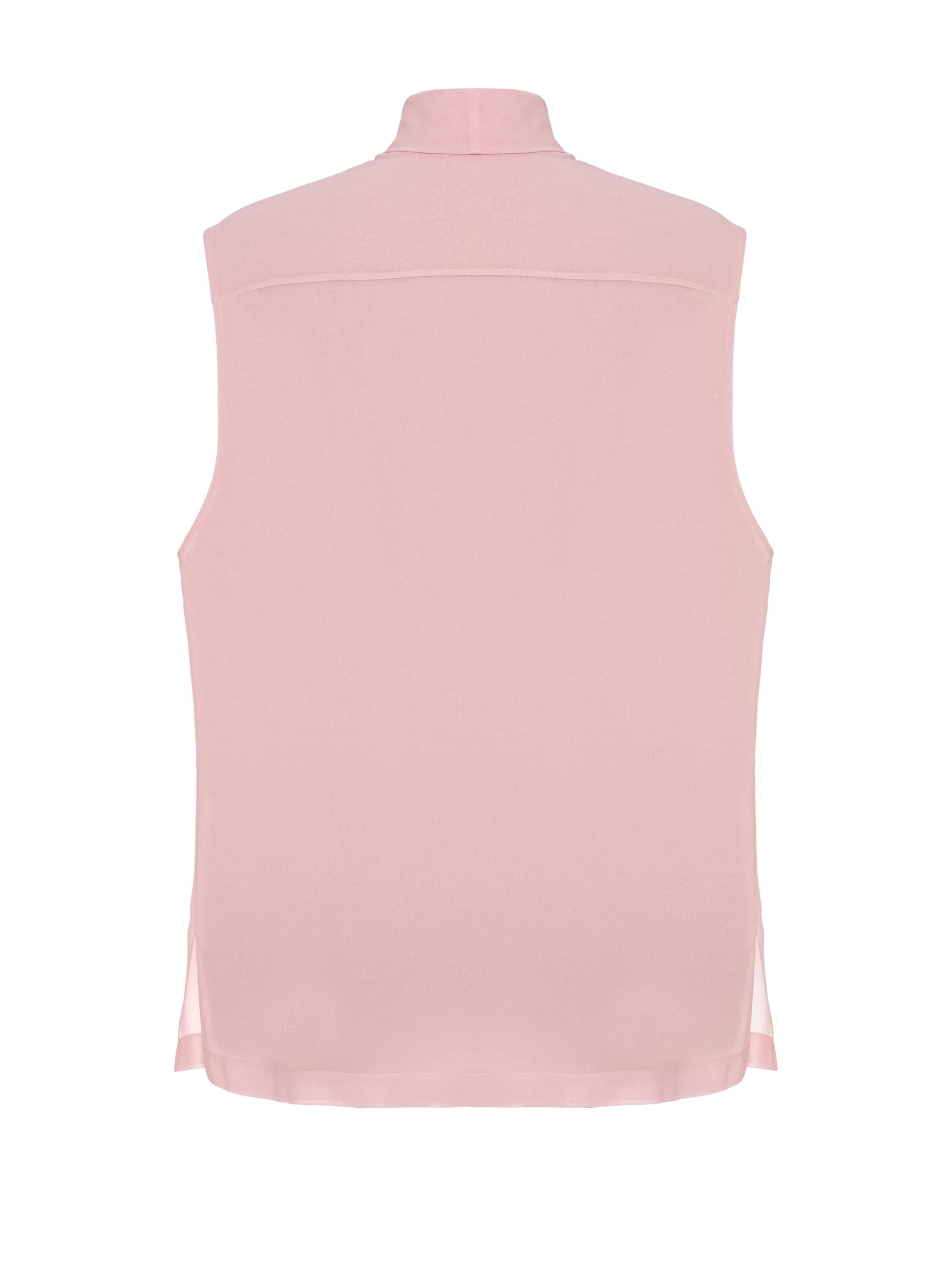 The pink blouse with tie-up collar is made from lightweight sheer chiffon. The model does not limit styling options and can be easily combined with any basic wardrobe pieces.