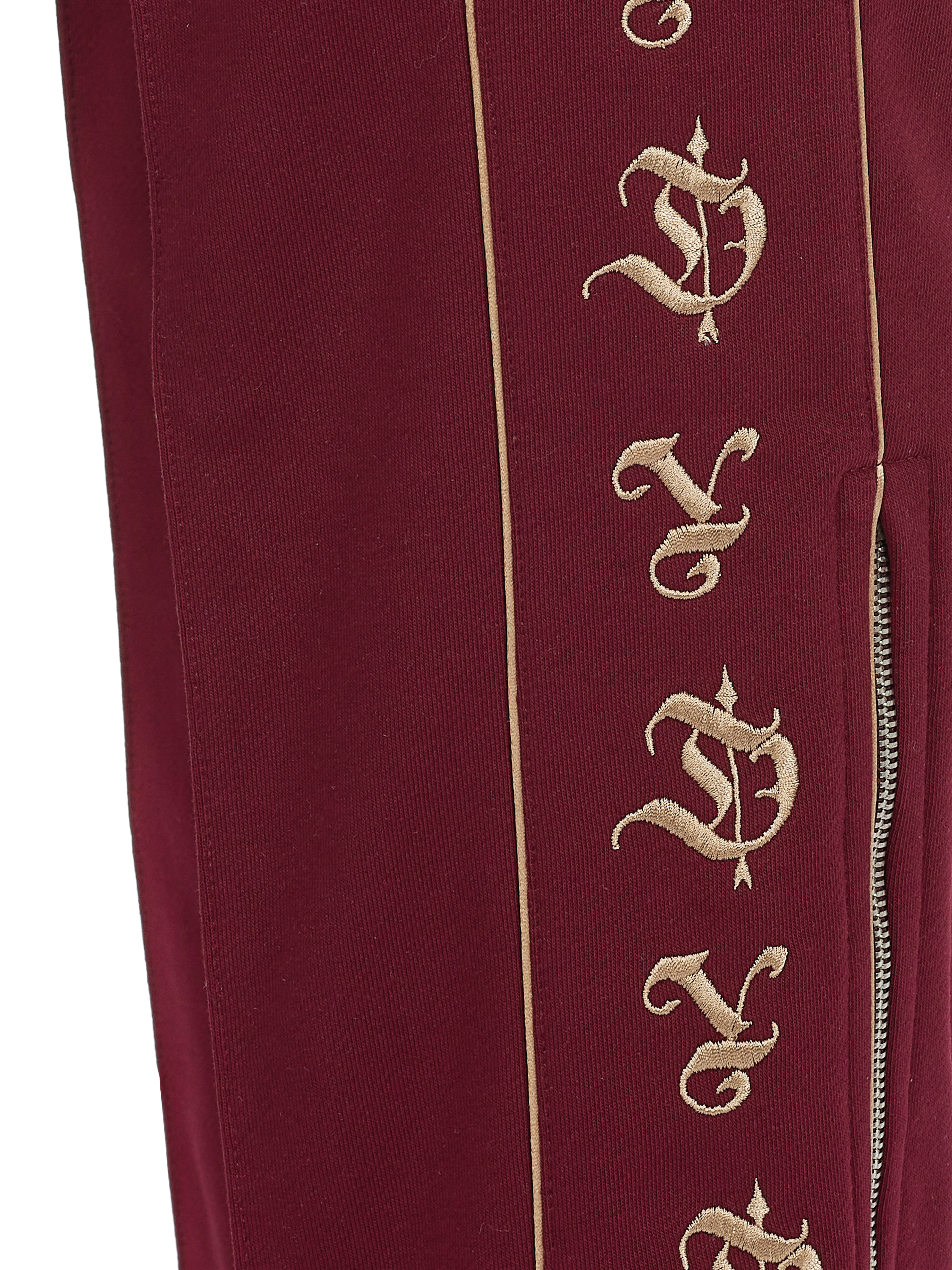 The knitwear suit is made of burgundy jersey and consists of a cropped sweatshirt with a stand-up collar and zipper and track pants. The cuffs and collar are finished with a wide elastic band. The sweatshirt is decorated with beige YD embroidery on the sleeves. The trousers are complemented with side stripes and zippers at the bottom.