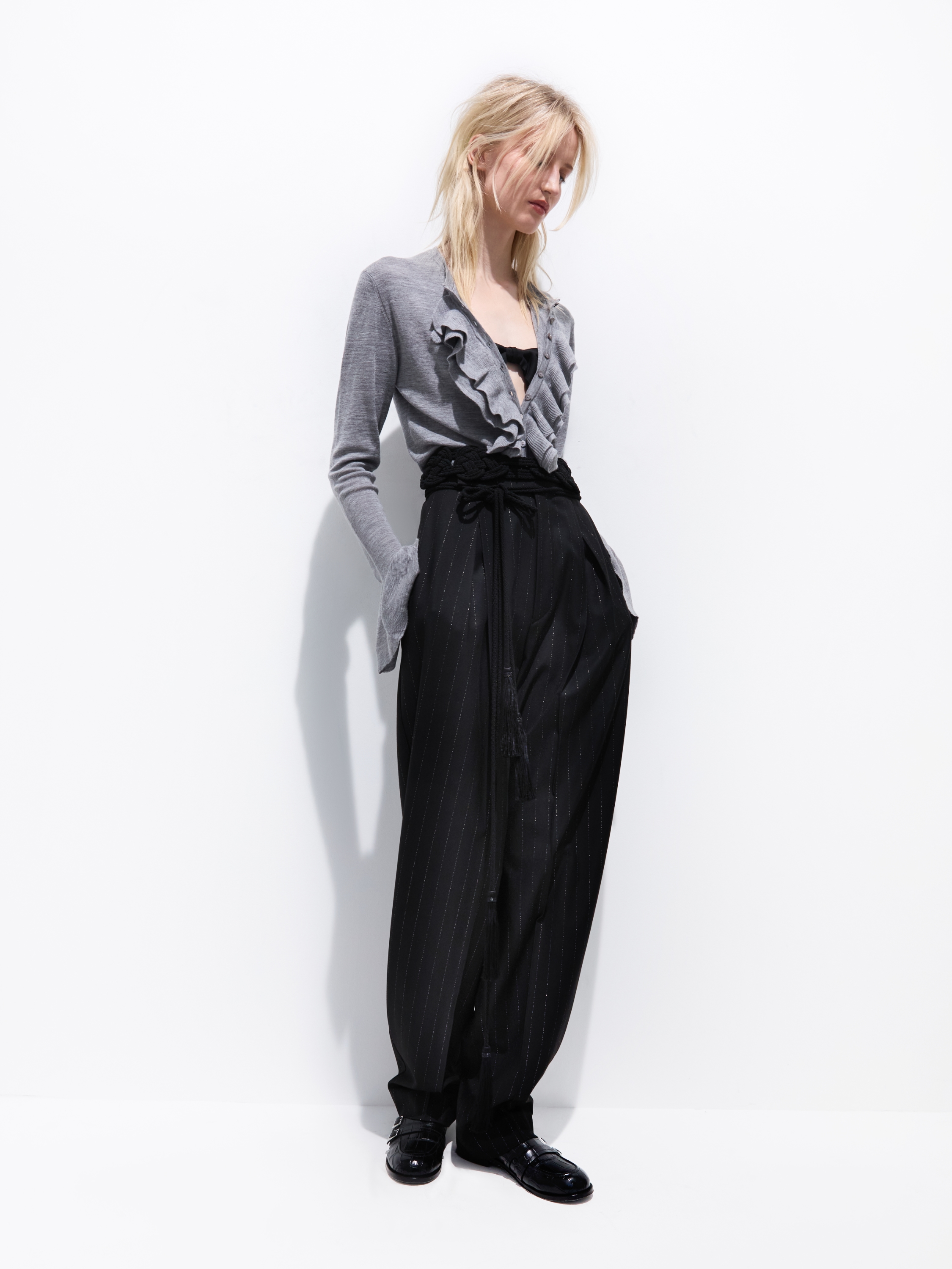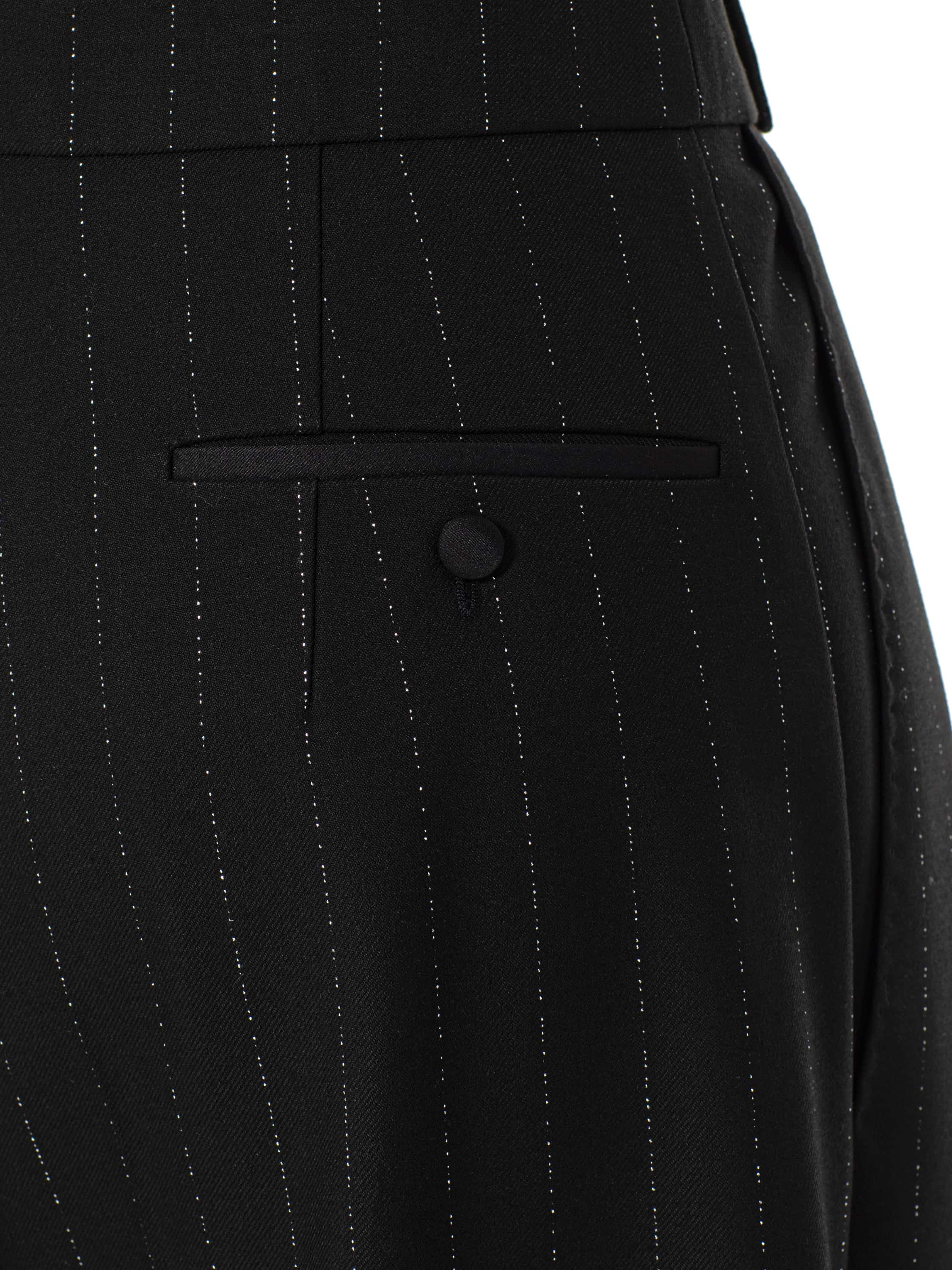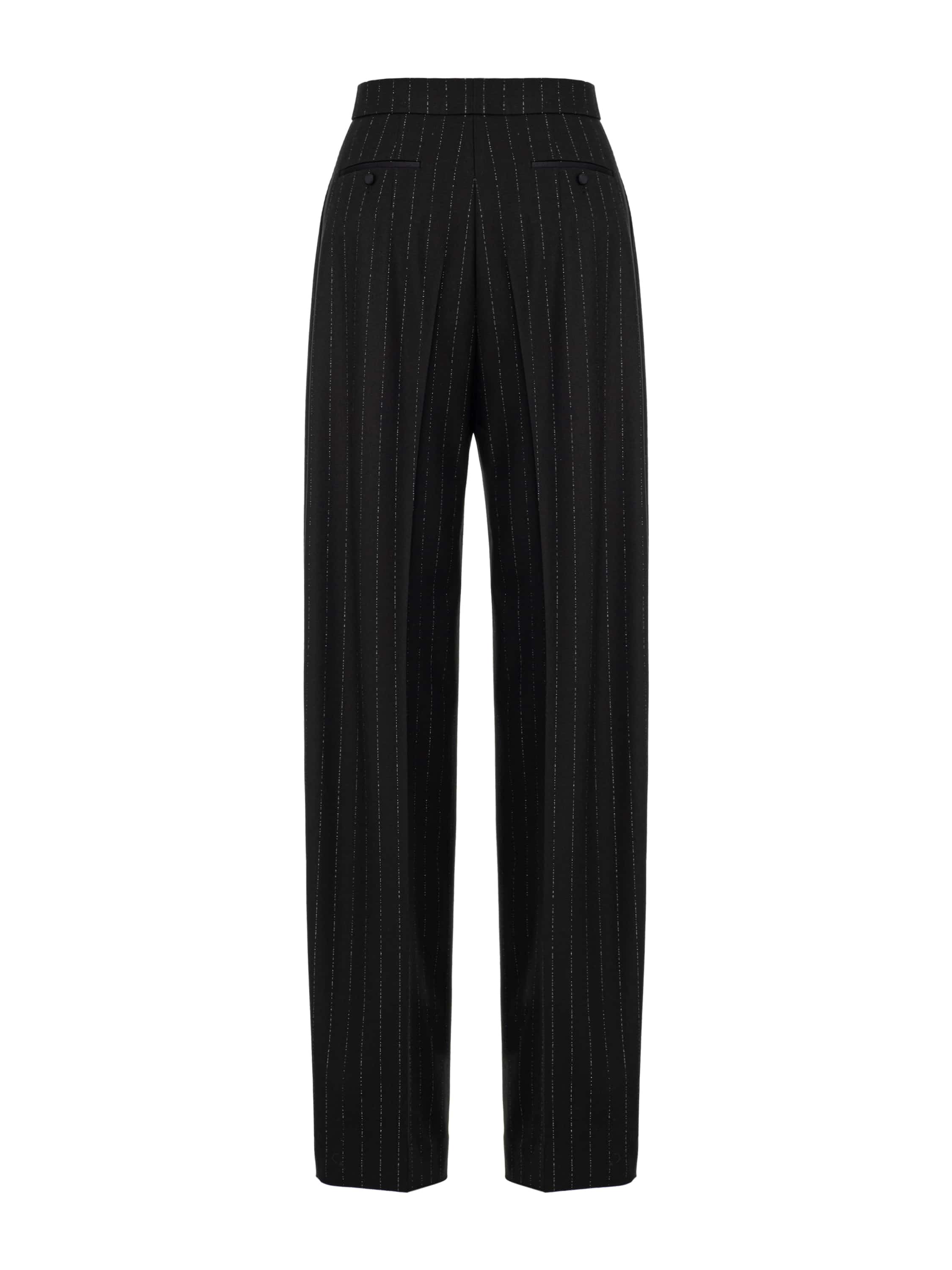 Elegant trousers made of noble black striped suiting fabric are a real find for a business wardrobe. The D-silhouette creates a feminine look, delicately emphasizing the advantages of the figure.