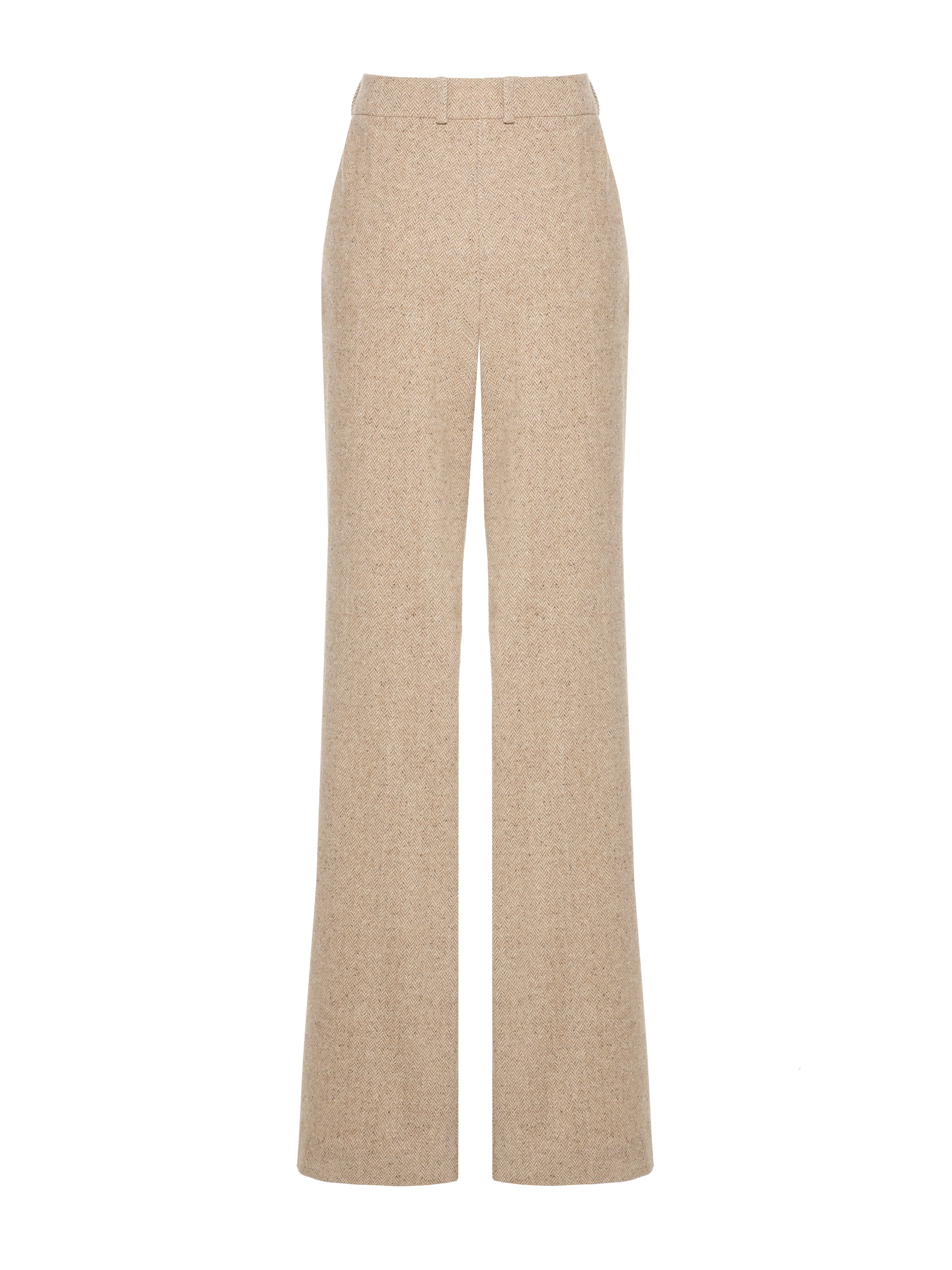 Beige trousers are made of wool suiting fabric with a delicate herringbone pattern. The straight-cut high-waisted model perfectly accentuates the waistline.