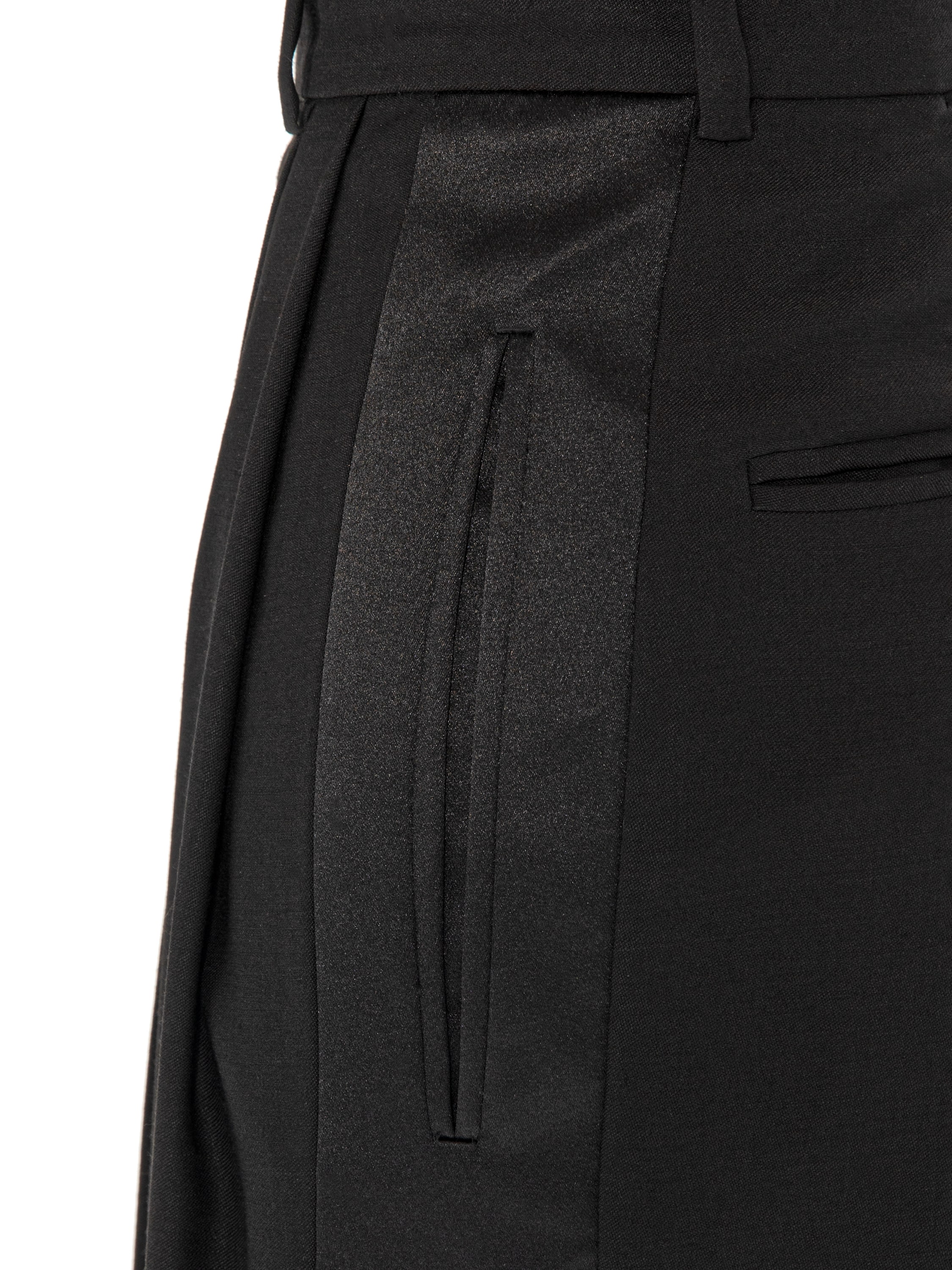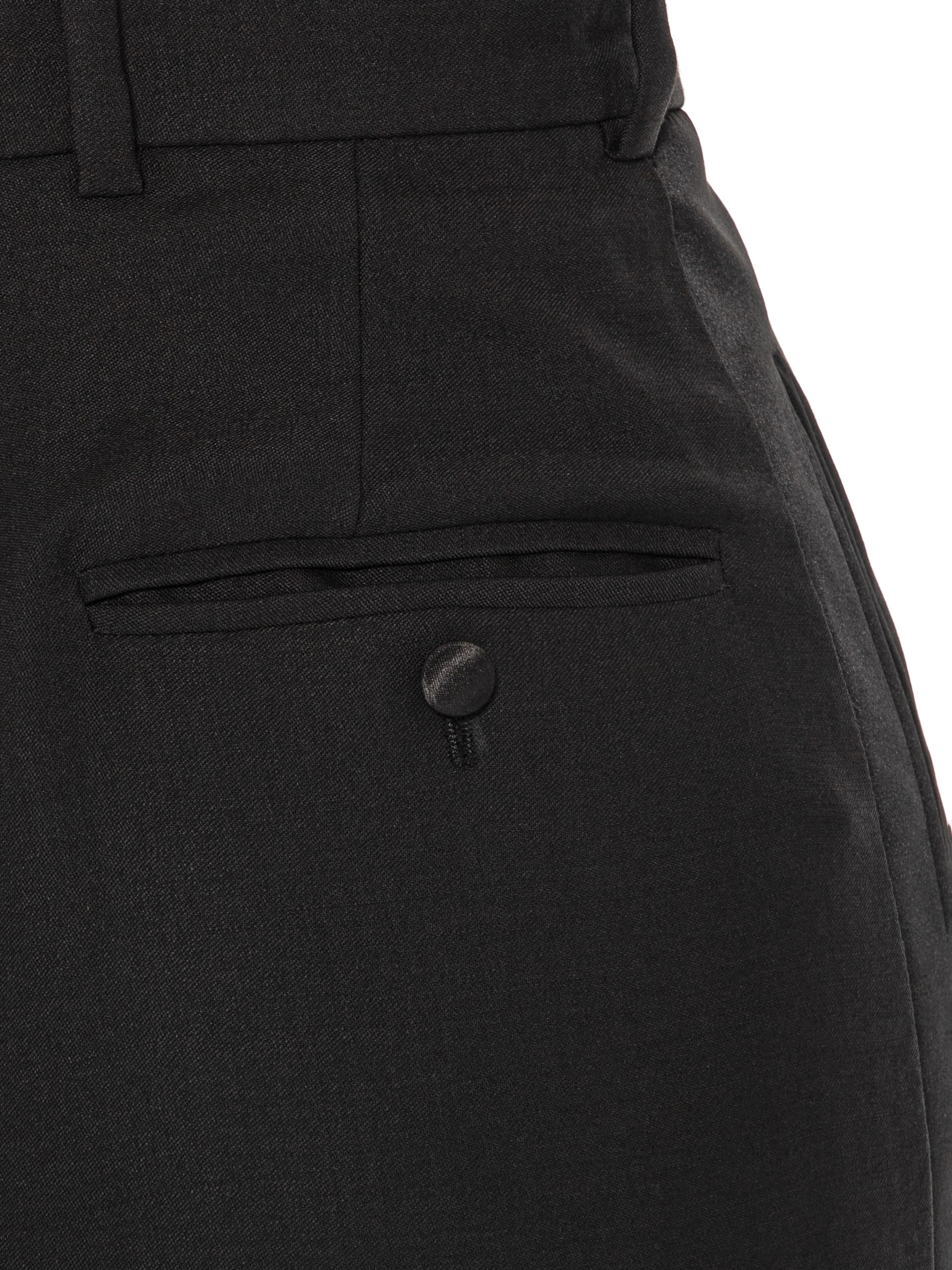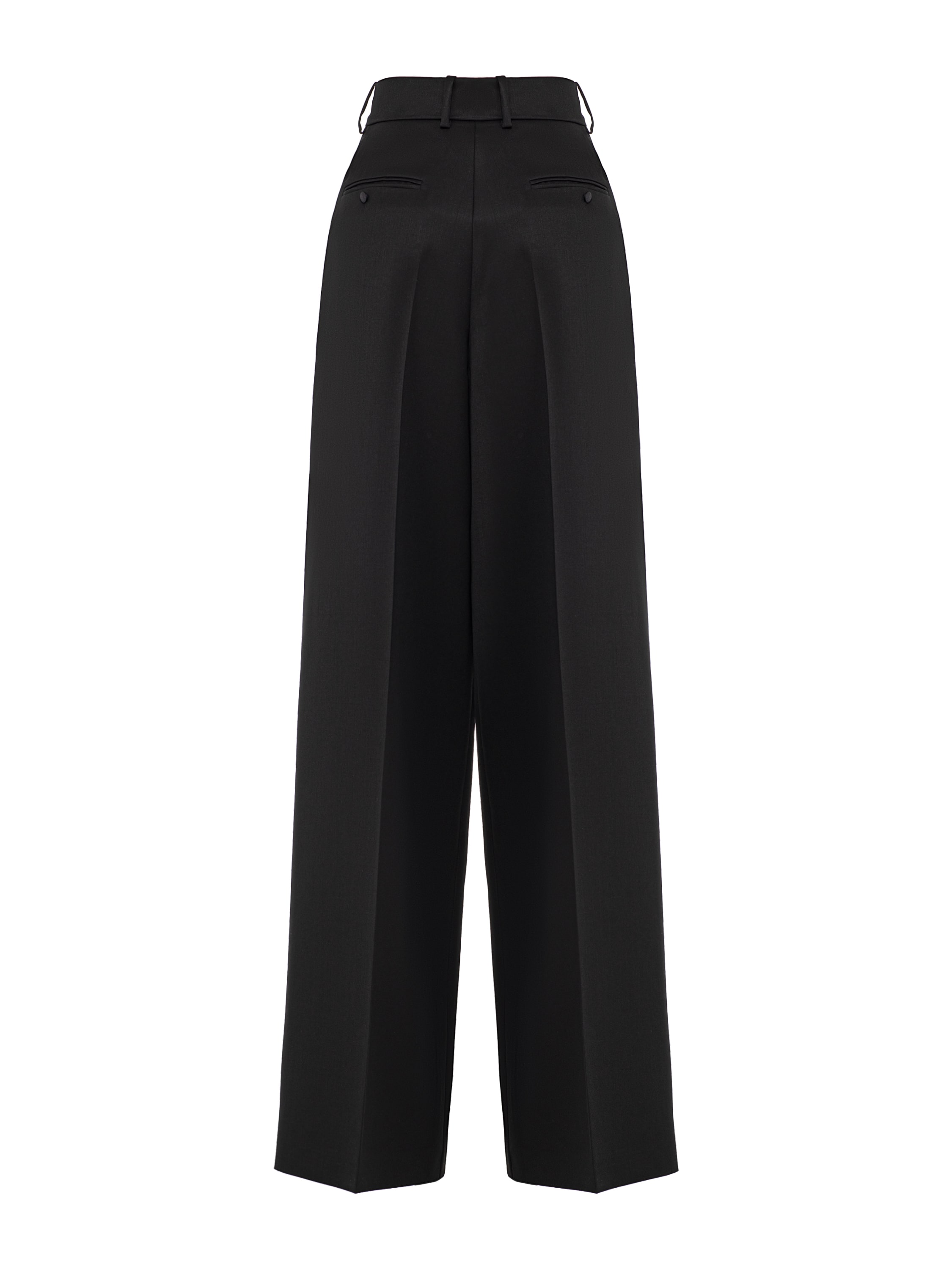 Laconic trousers made of black suiting fabric will be an ideal base for a business look. The model is complemented by front pleats, pockets and side stripes.