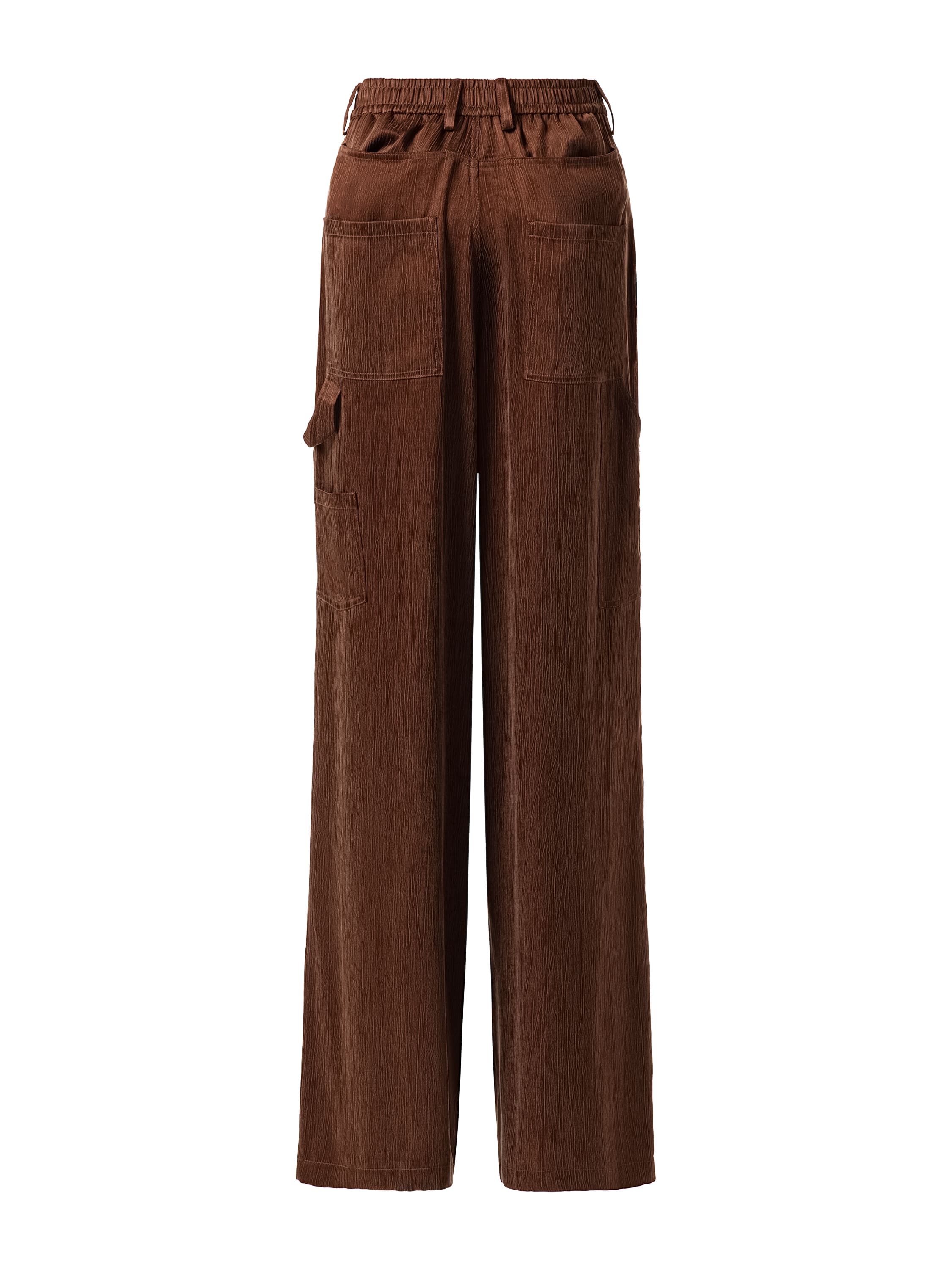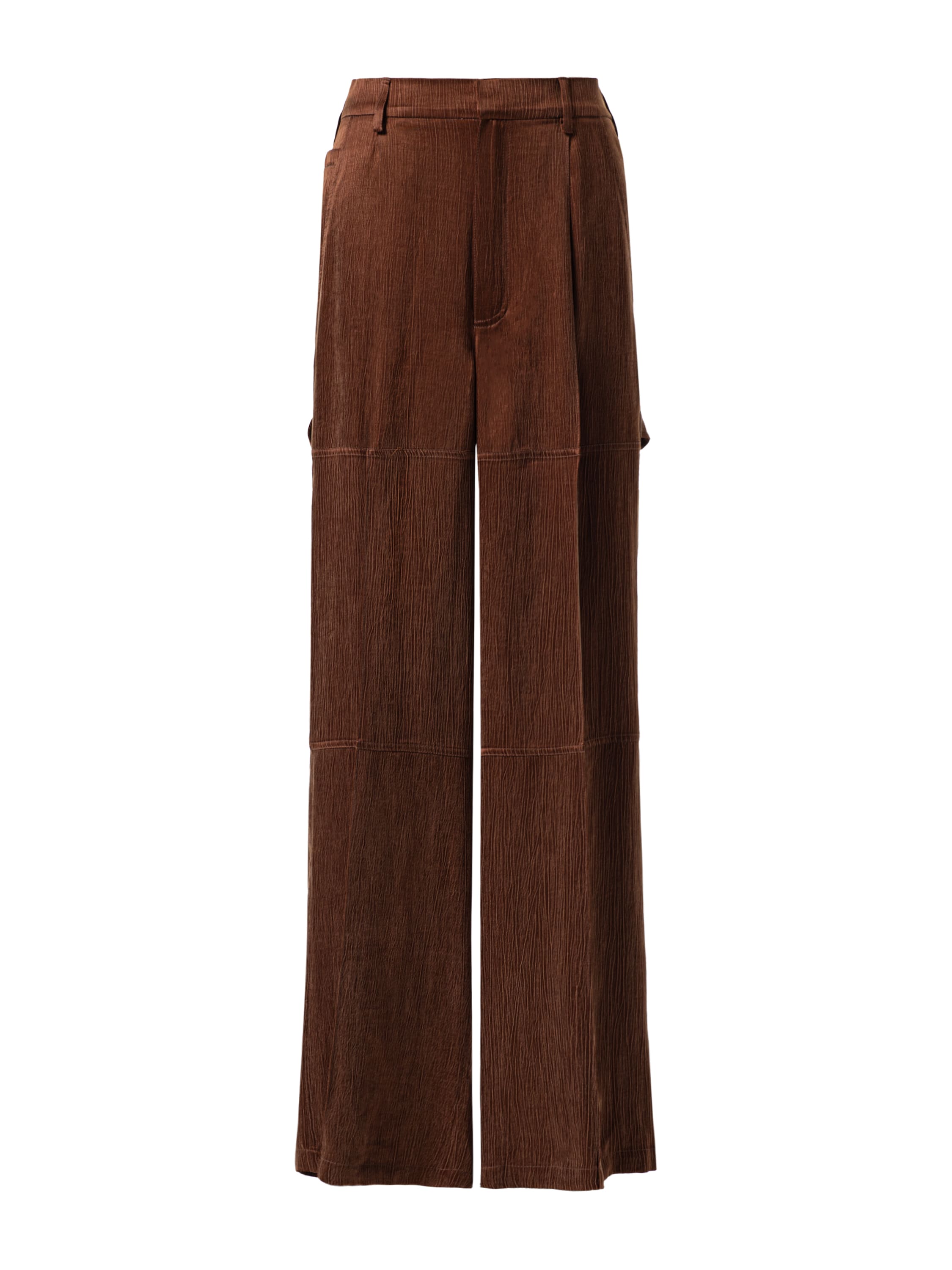 Straight‑leg trousers made of bronze‑coloured cupro. The model features pleats at the front and three patch pockets.
