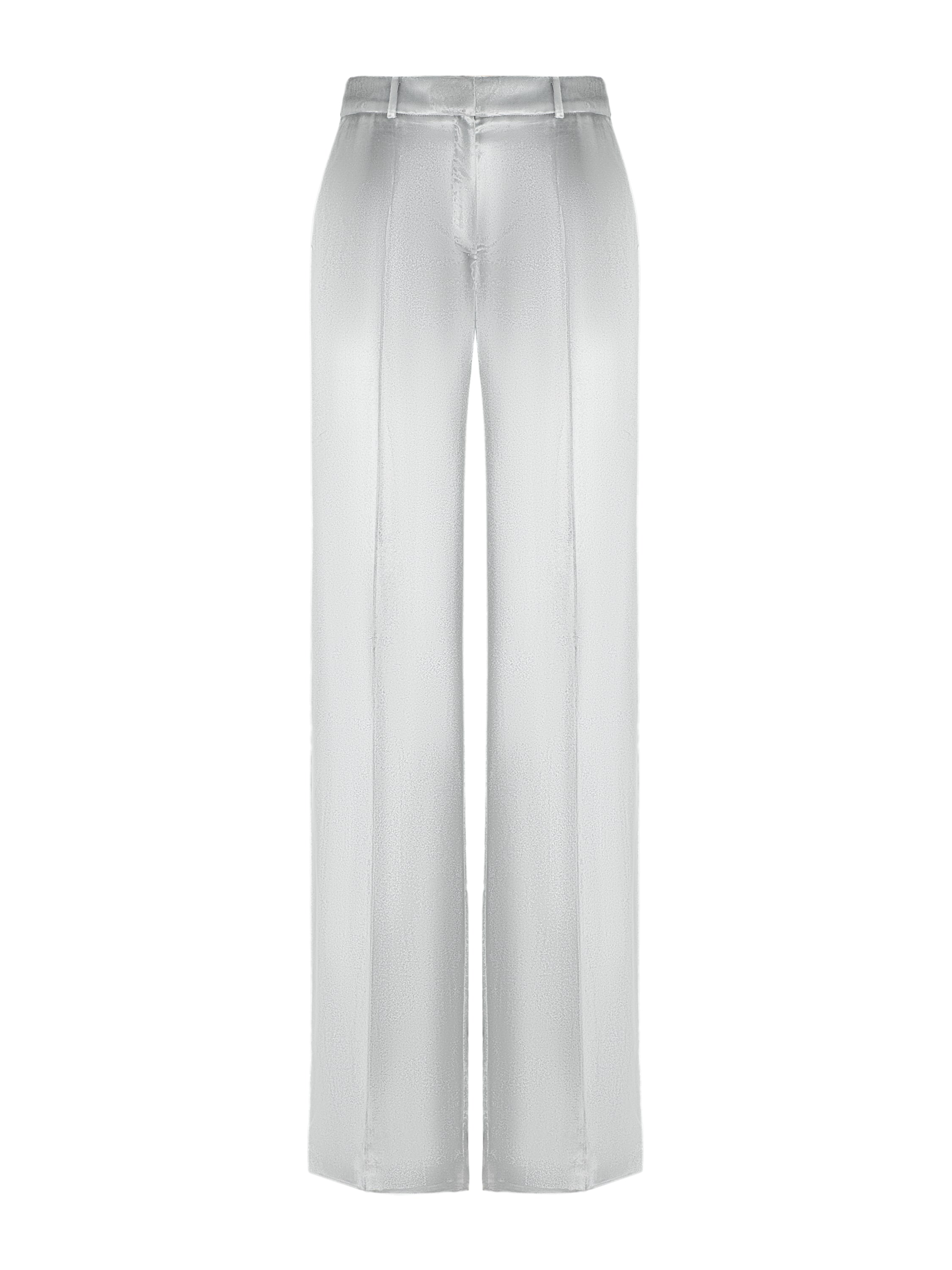 Straight-leg silver velvet trousers will become an original accent in the look. The model with a classic fit will pair well with both elongated and cropped tops.