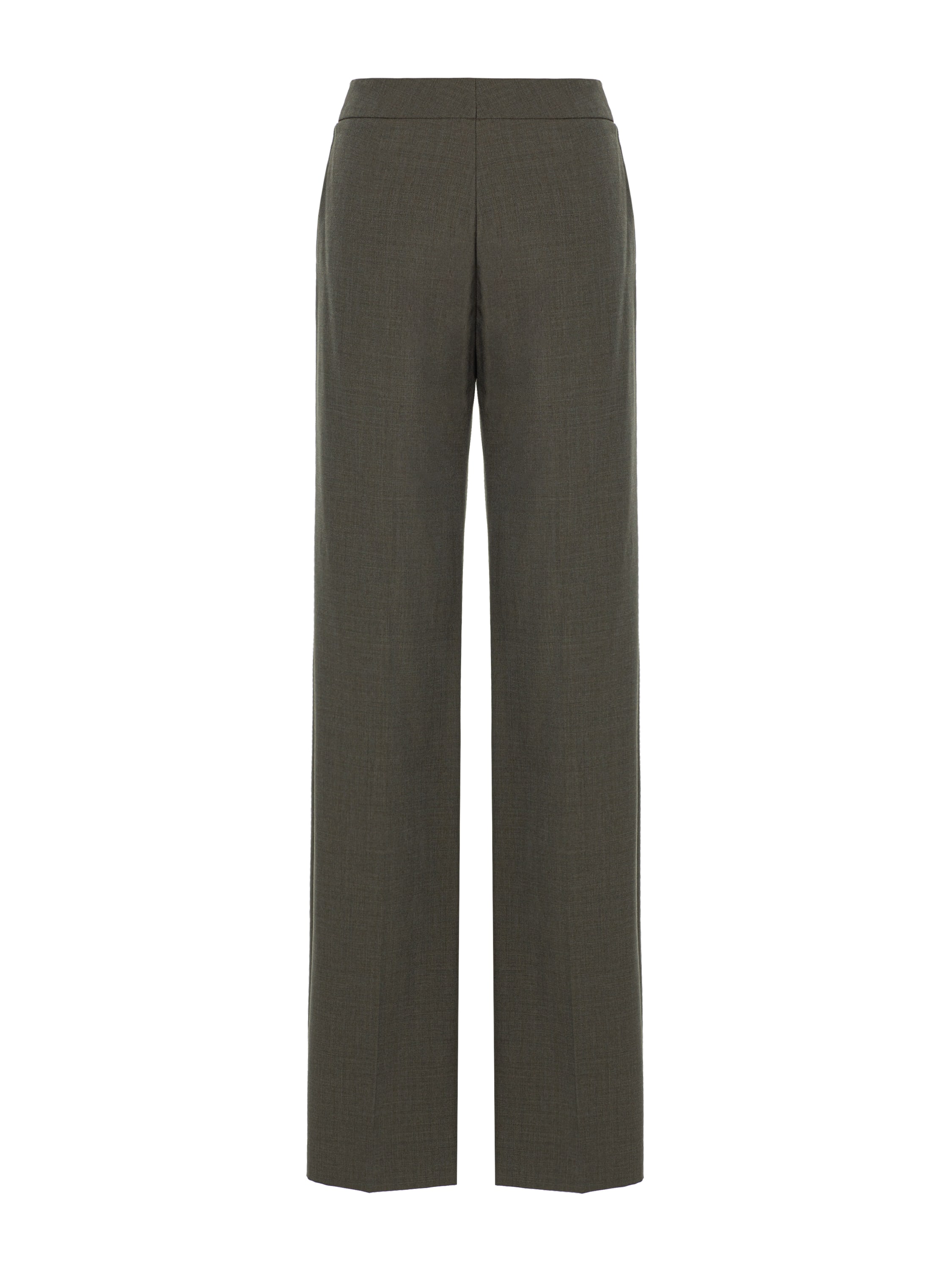 Straight-leg trousers with creases are made of khaki wool suiting fabric. High-rise style.