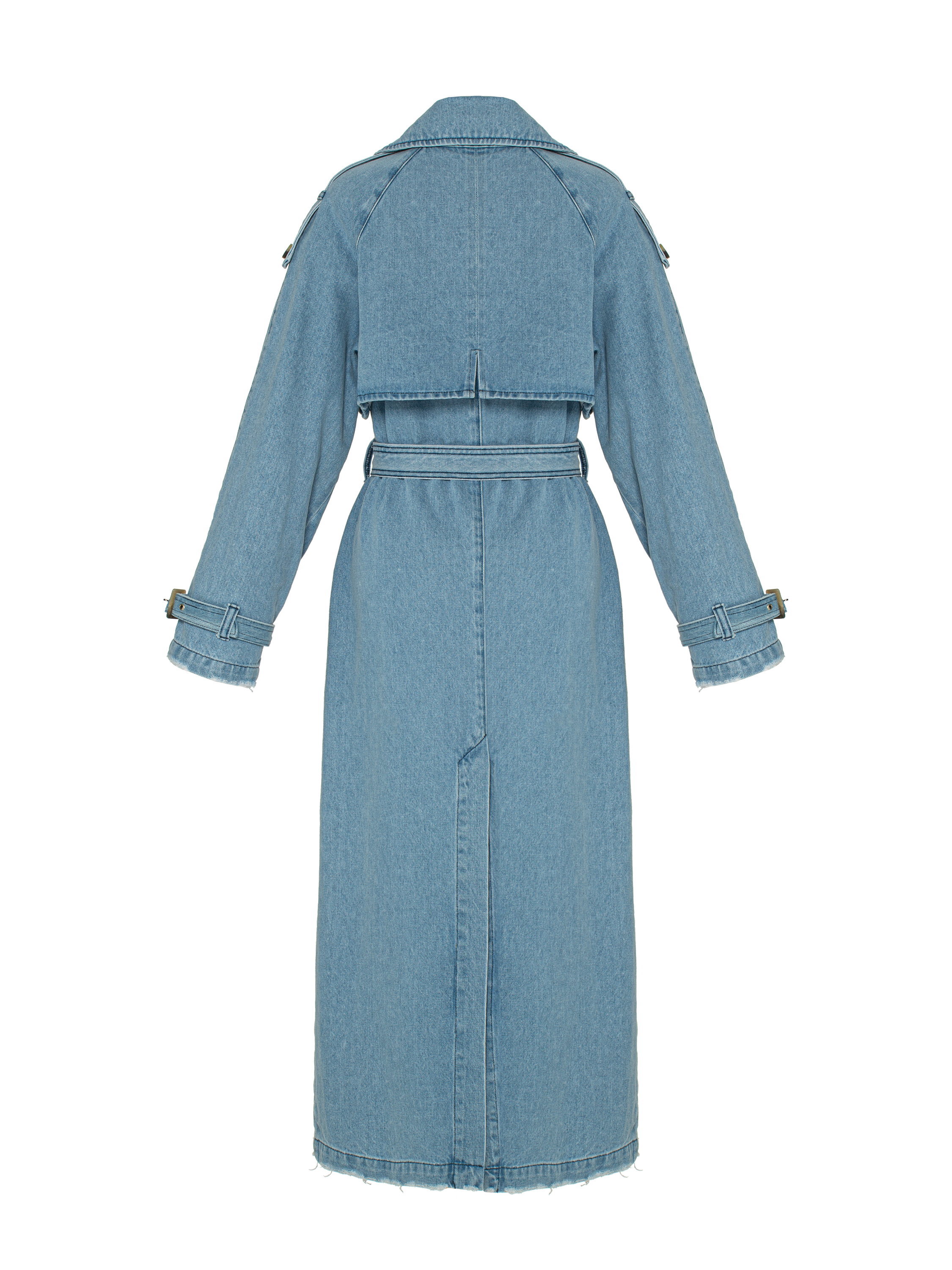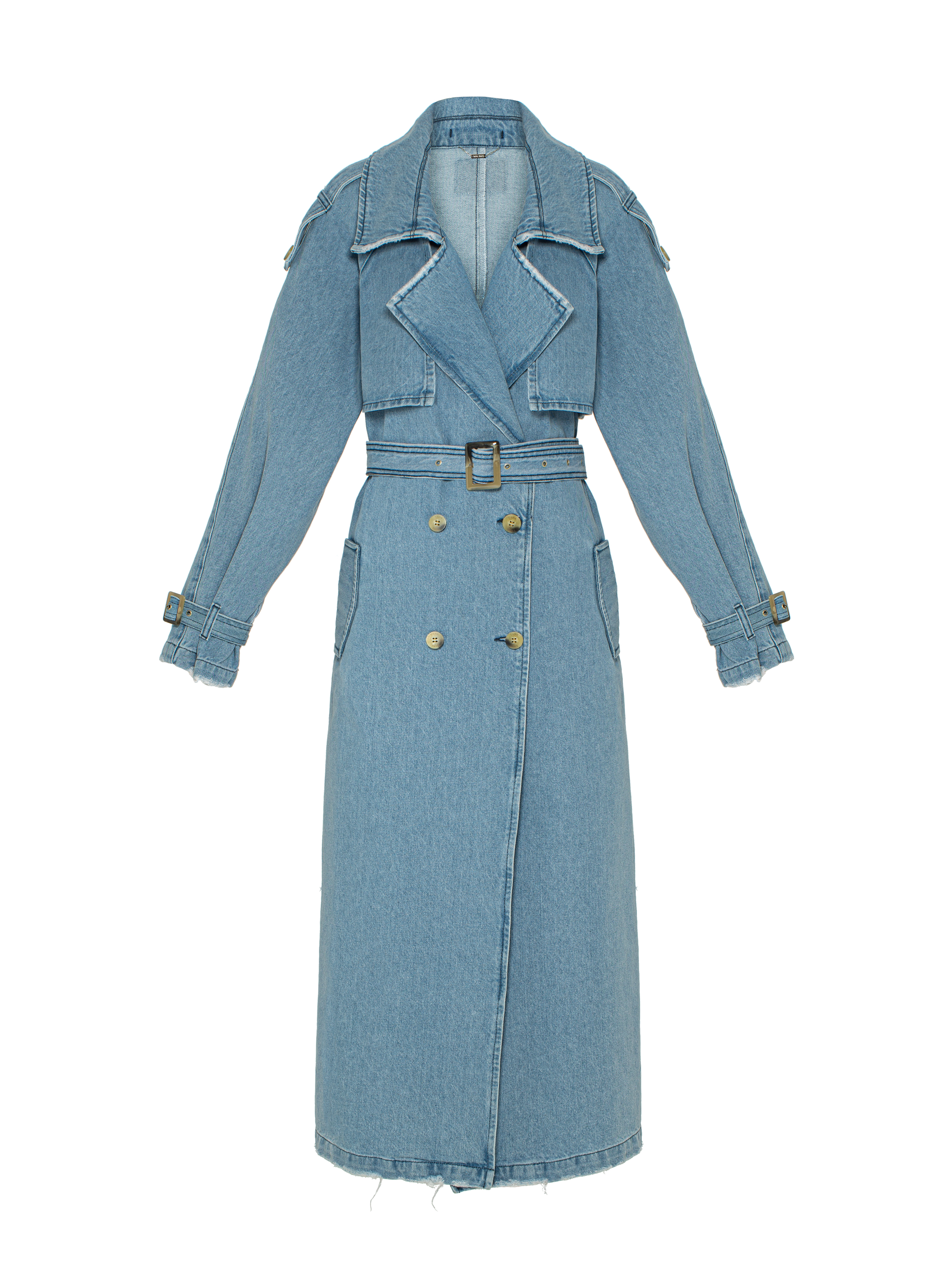 A light blue double-breasted denim trench coat is a win-win option that will go with any wardrobe piece. The trench is complemented with decorative fading and beige horn buttons. Classic features of this model: wide lapels, a storm flap and straps on the cuffs. The belt elegantly accentuates the waist.