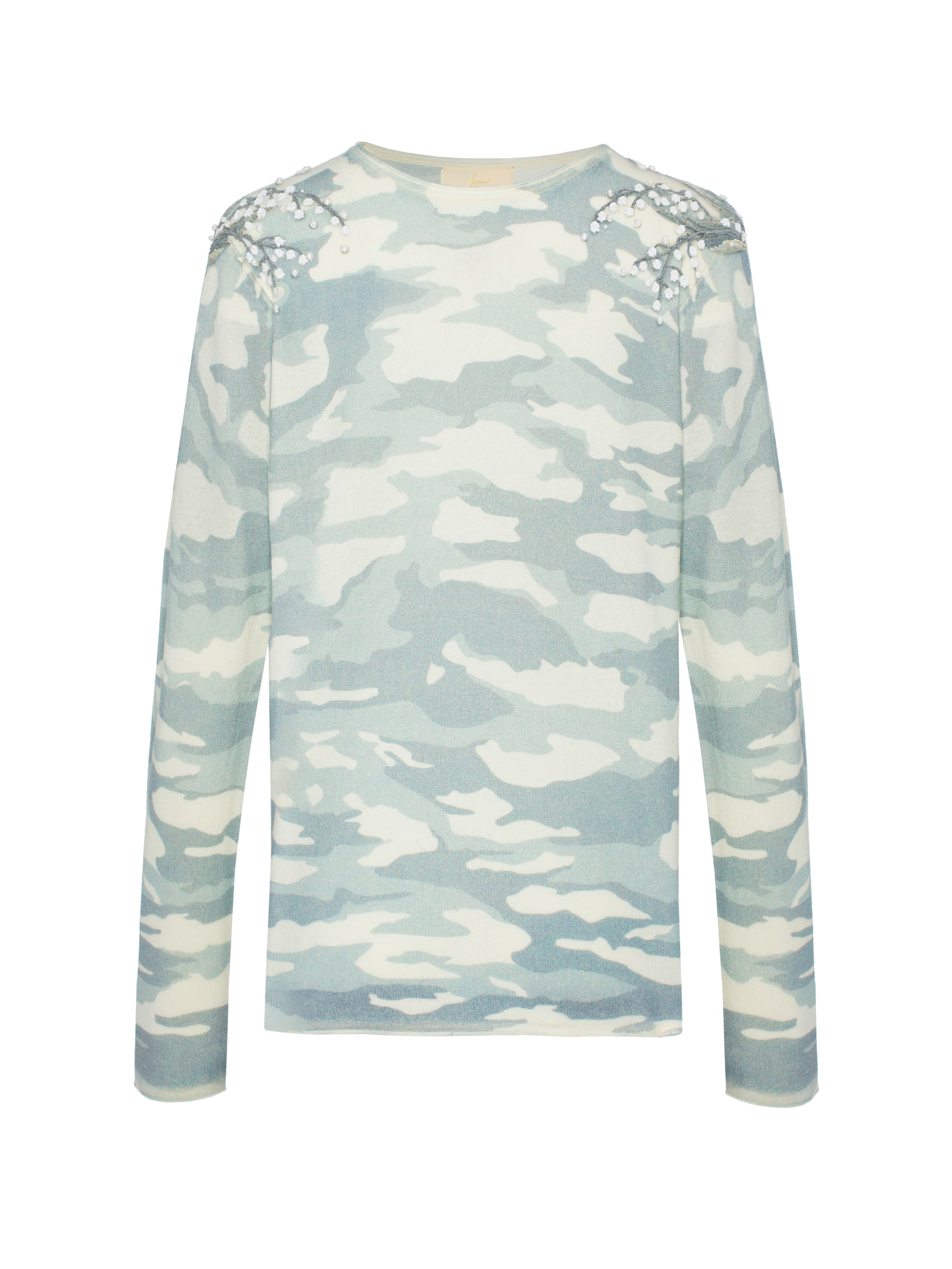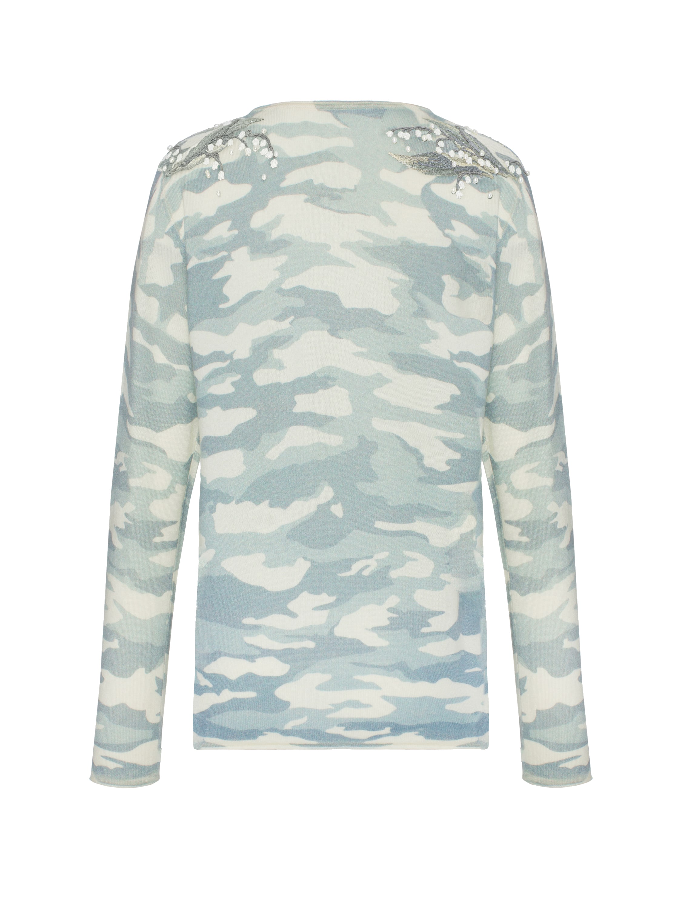 The jumper made of natural cashmere with a camouflage print and lily-of-the-valley embroidery is a comfortable everyday piece. A model made of such material provides natural thermoregulation, allowing air to pass through and letting the skin breathe. The item is made of baby cashmere – light and thin yarn from the undercoat of cashmere kids under one year old.