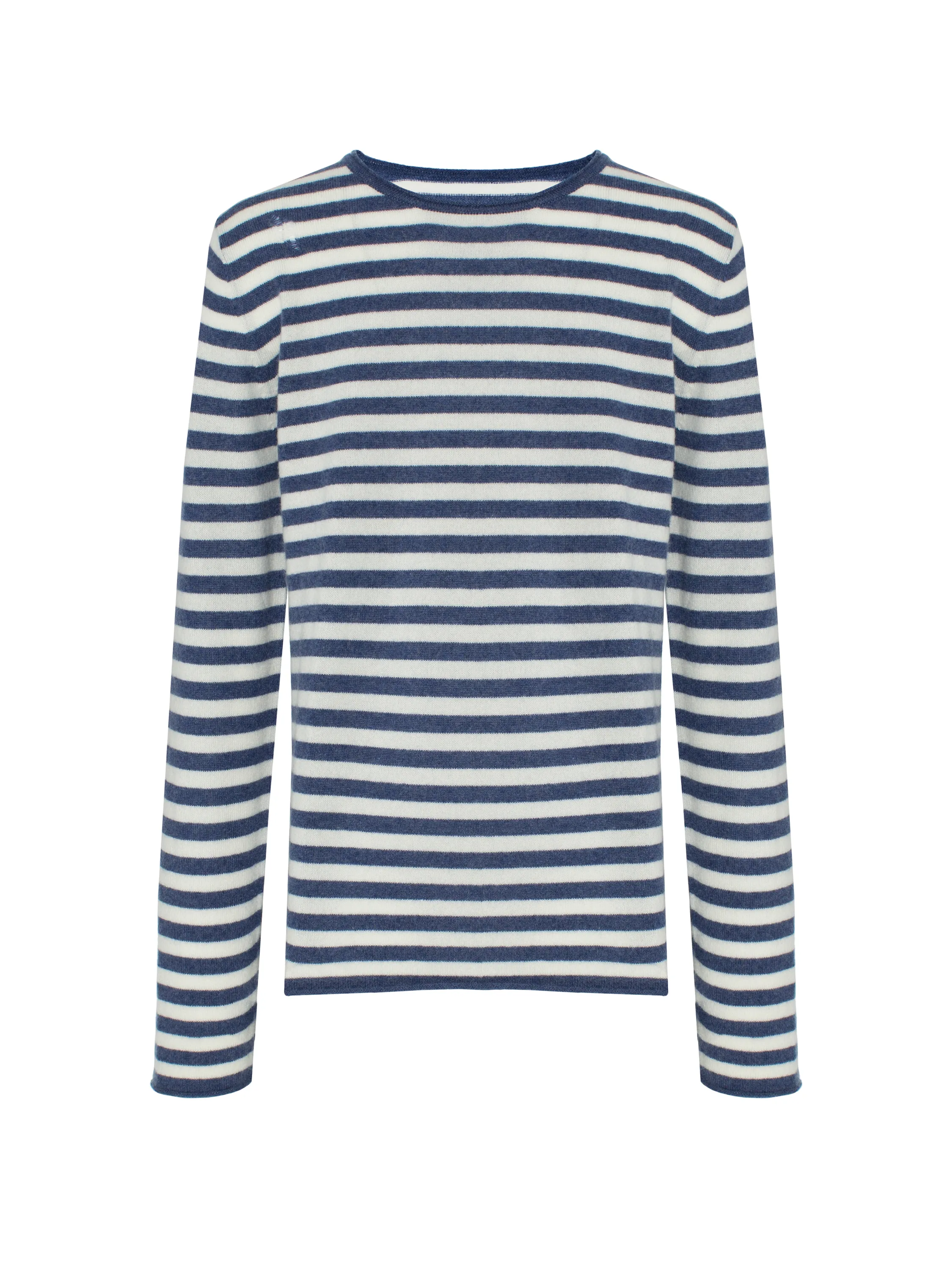 The men's long-sleeve top in white and blue stripes is made of baby cashmere, a premium-quality yarn from the undercoat of cashmere-breed kids under one year old. The loose-fit model does not restrict movement; the material holds its shape well and practically does not wrinkle. The piece is decorated with ornamental holes on the shoulders.
