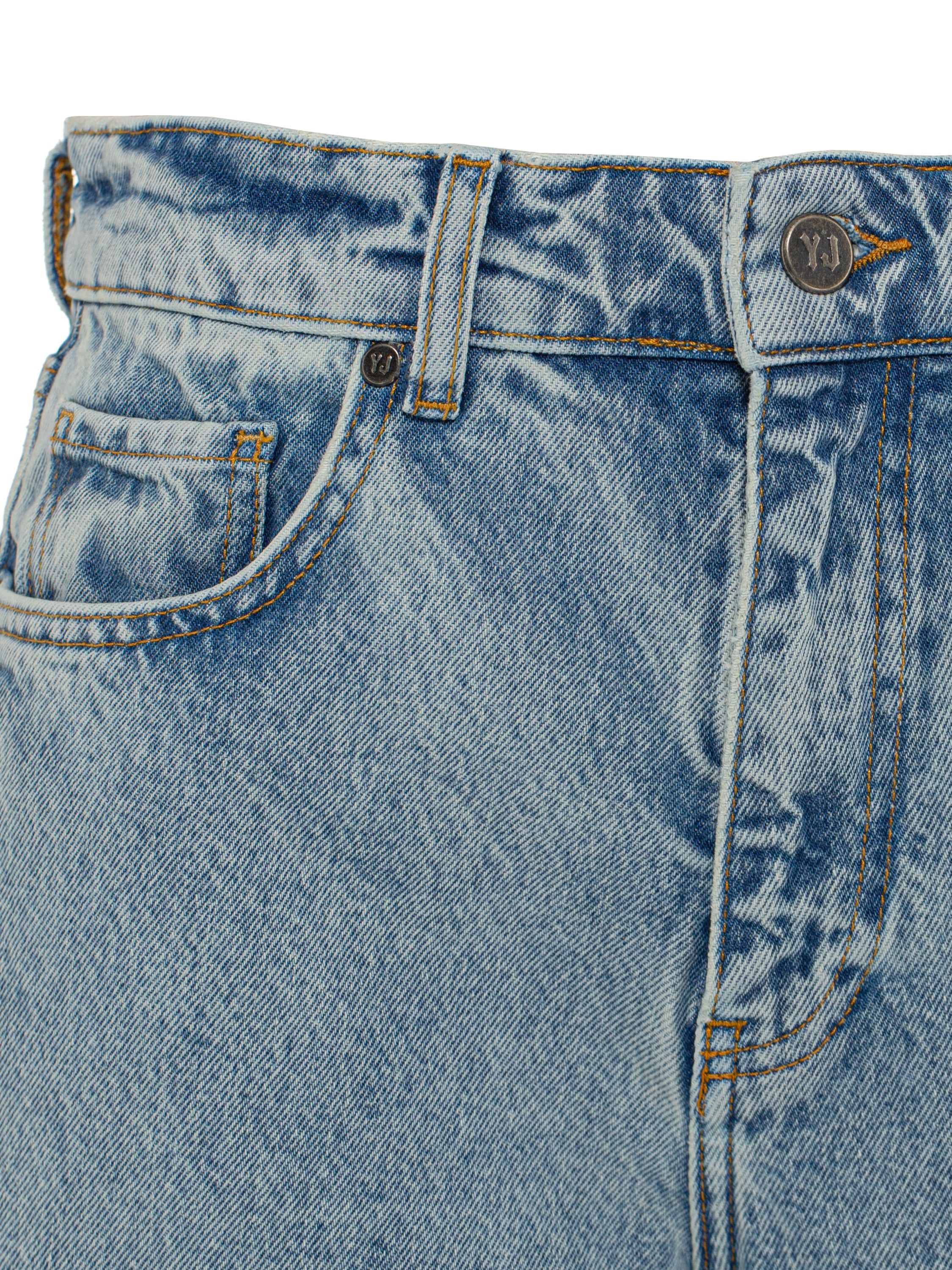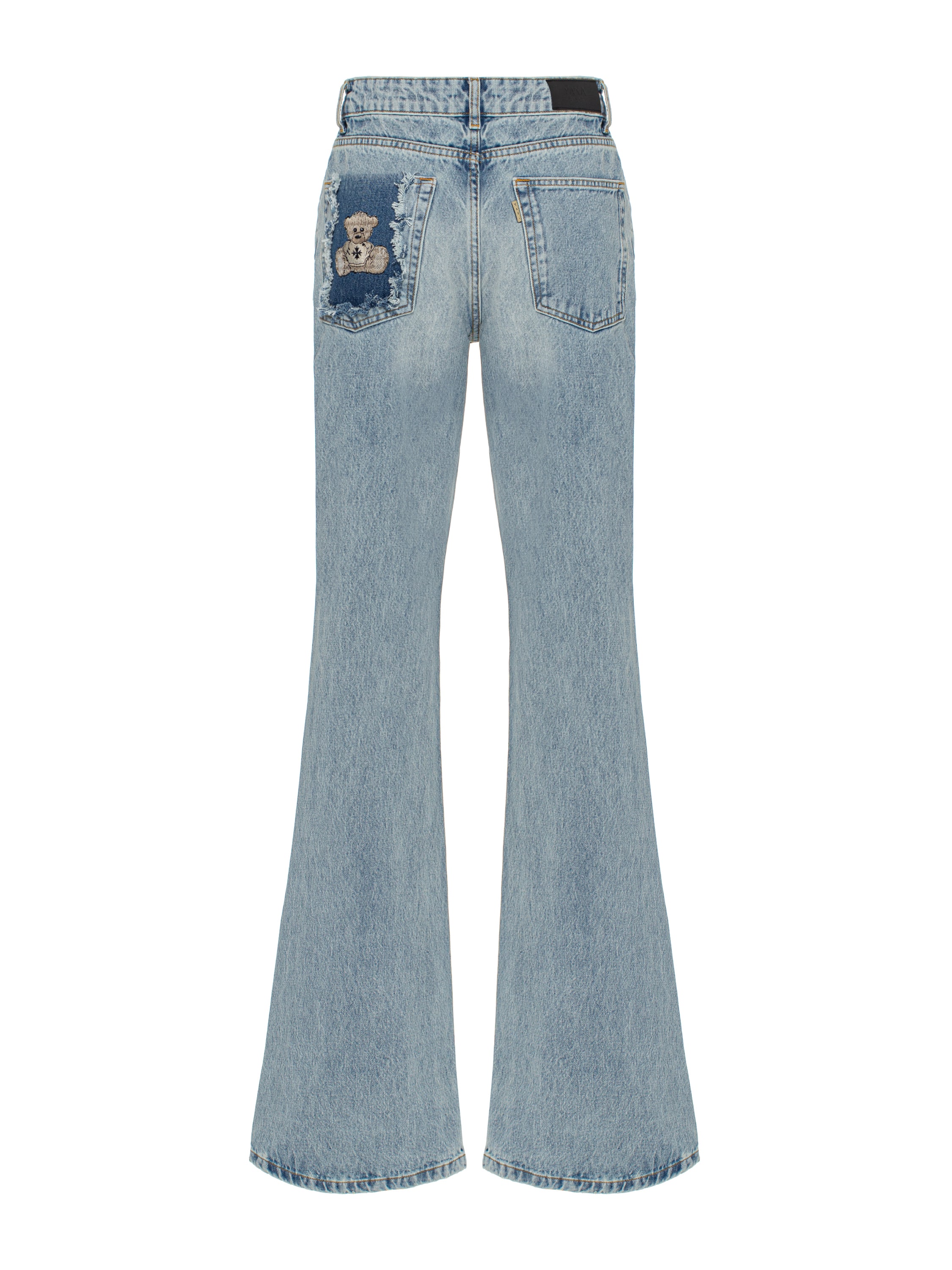 Flared Yana Jeans made of light blue denim are complemented by embroidery in the form of a teddy bear on the back pocket. The jeans fit comfortably and do not restrict movement. High-rise model.