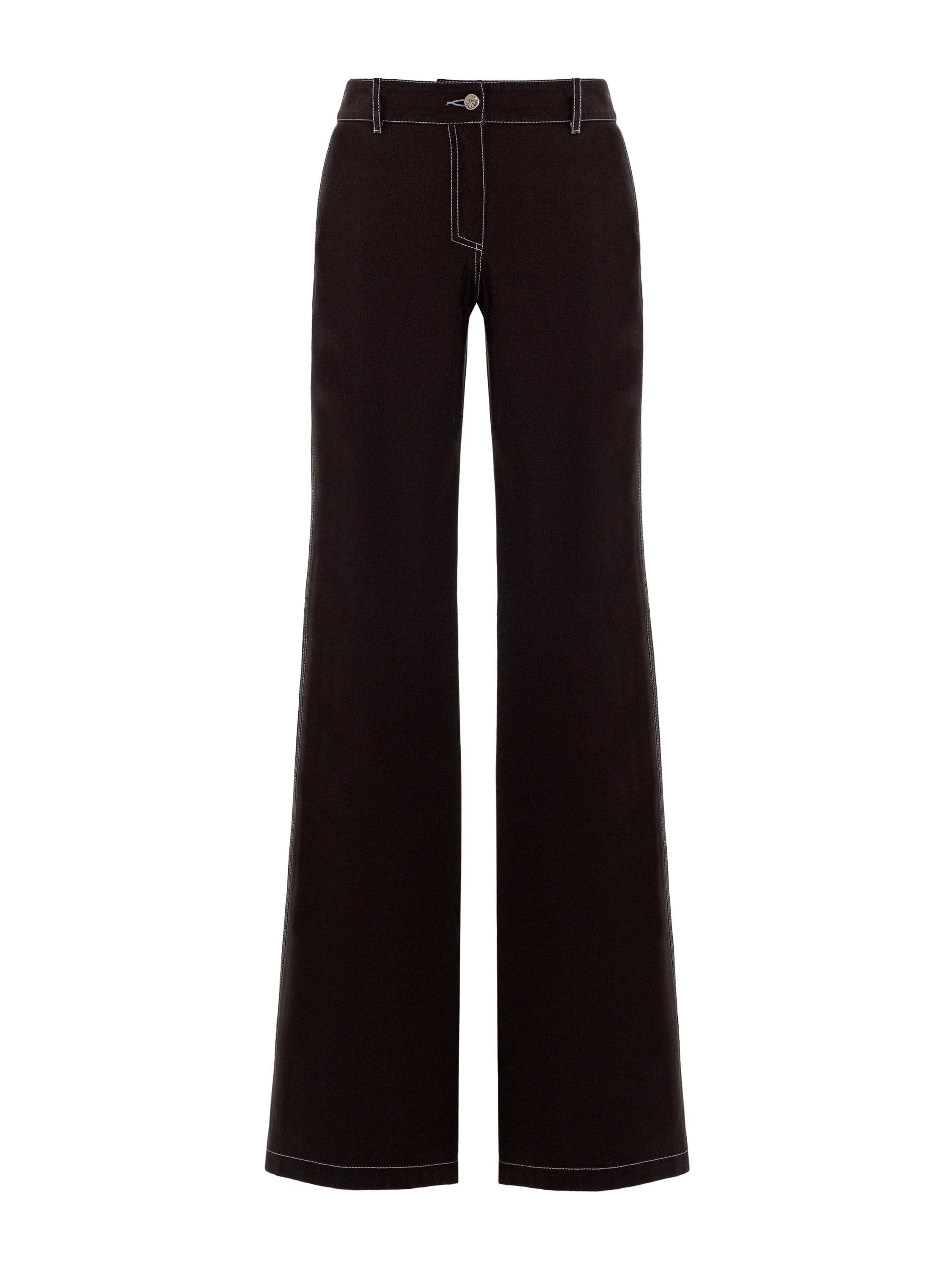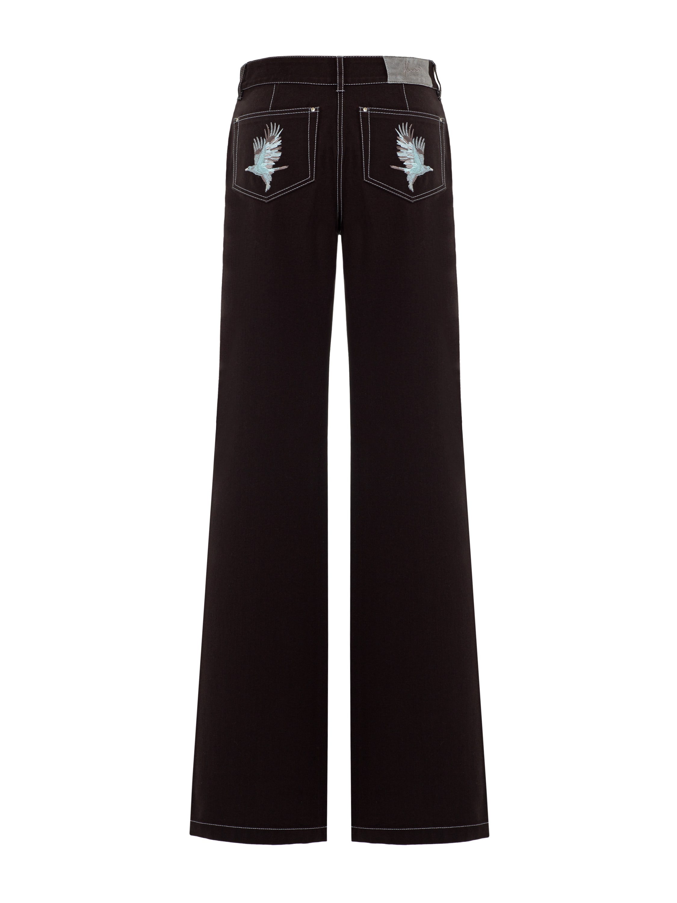 The dark brown jeans are made of cotton fabric. The flared model is decorated with eagle embroidery on the back pockets.
