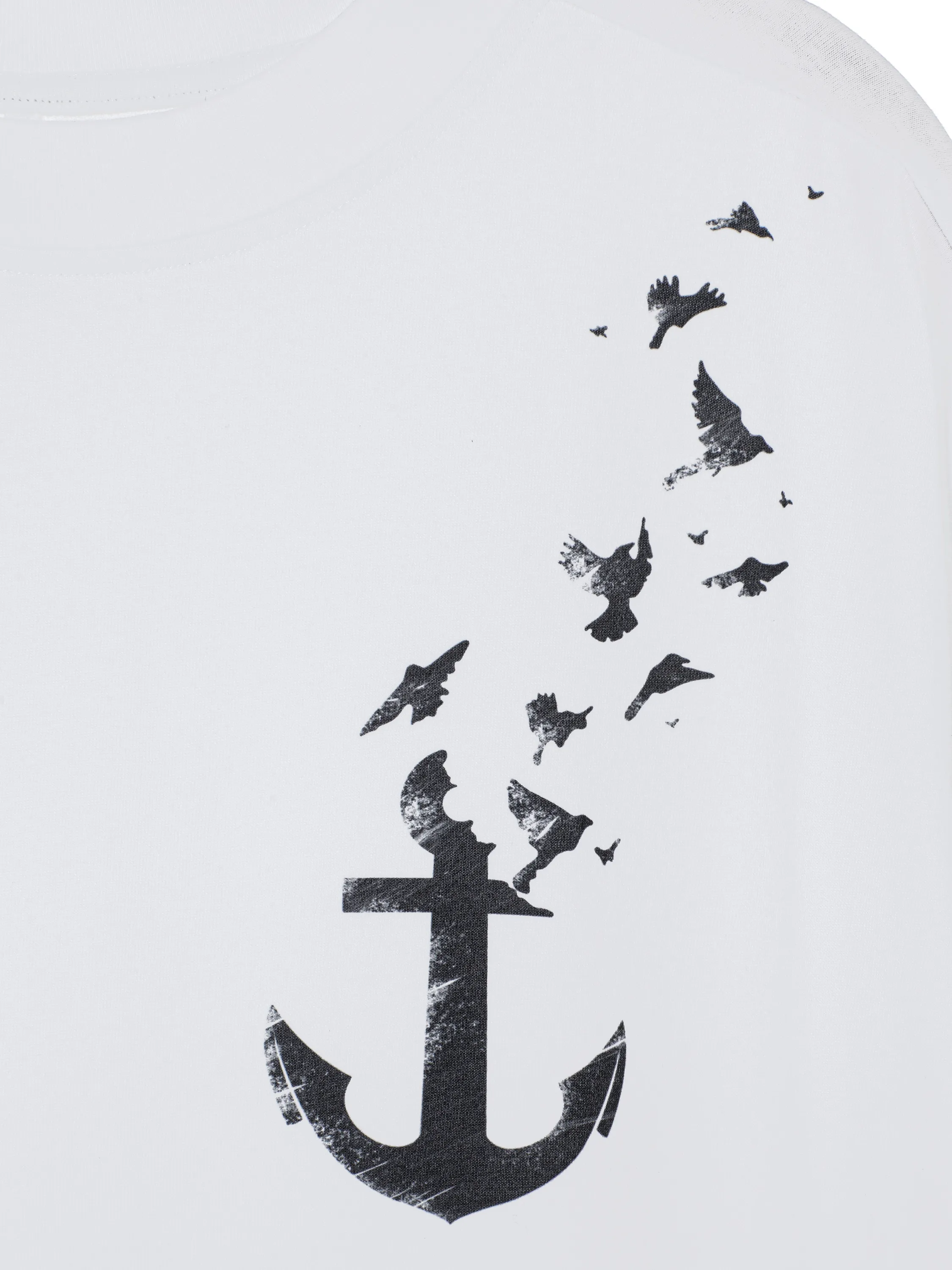 A basic white T-shirt is complemented by a minimalist print in the form of an anchor and black birds on the chest. The item is made of soft natural cotton. The material allows air to pass through well, so the T-shirt will be comfortable even in the hottest weather.
