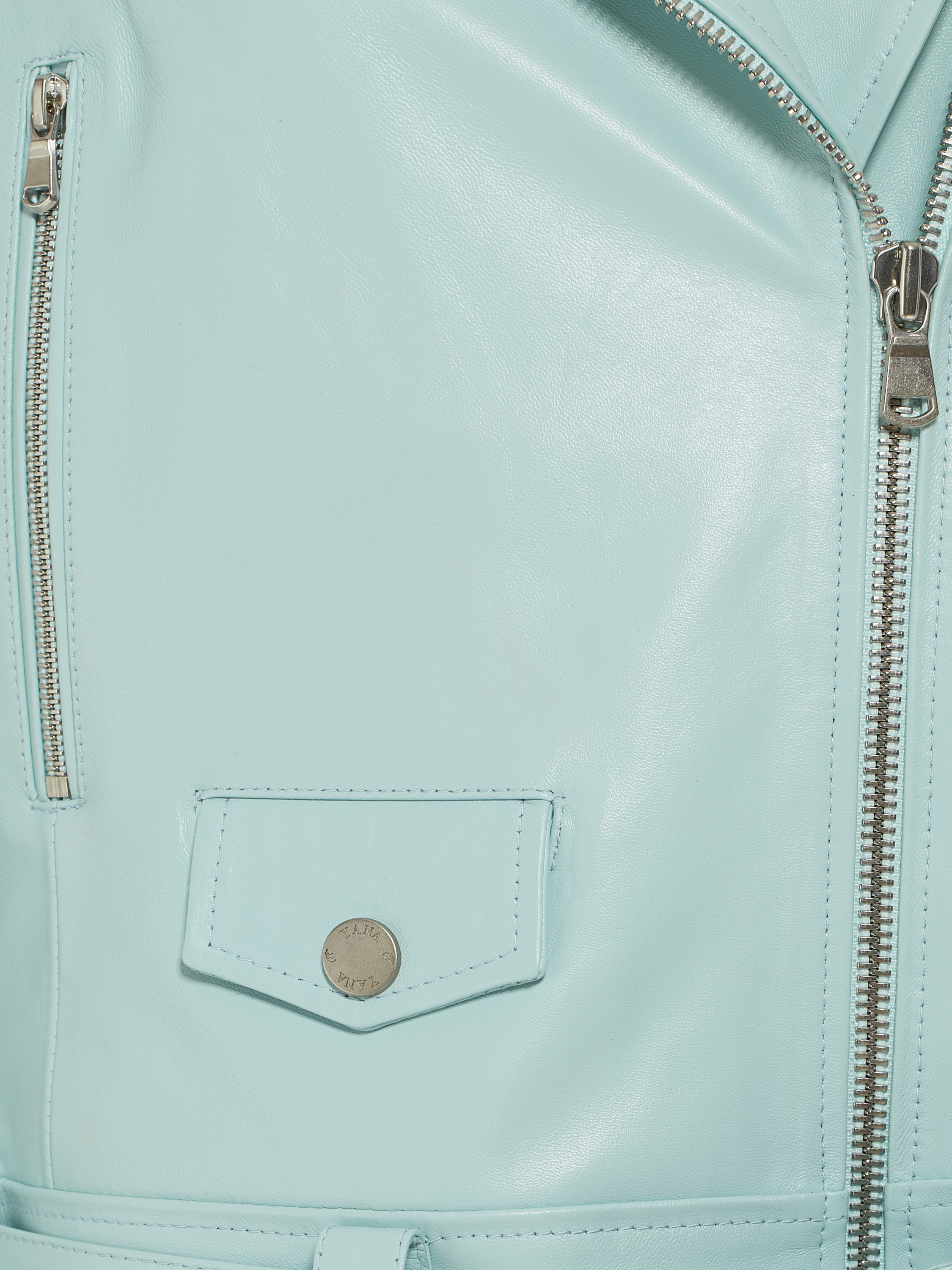 The biker jacket will be the perfect finishing touch for both an evening and an everyday look. The model is made of genuine smooth light blue leather. Three welt zip pockets, one small flap pocket and a belt at the waist. Fastens with a front zipper.