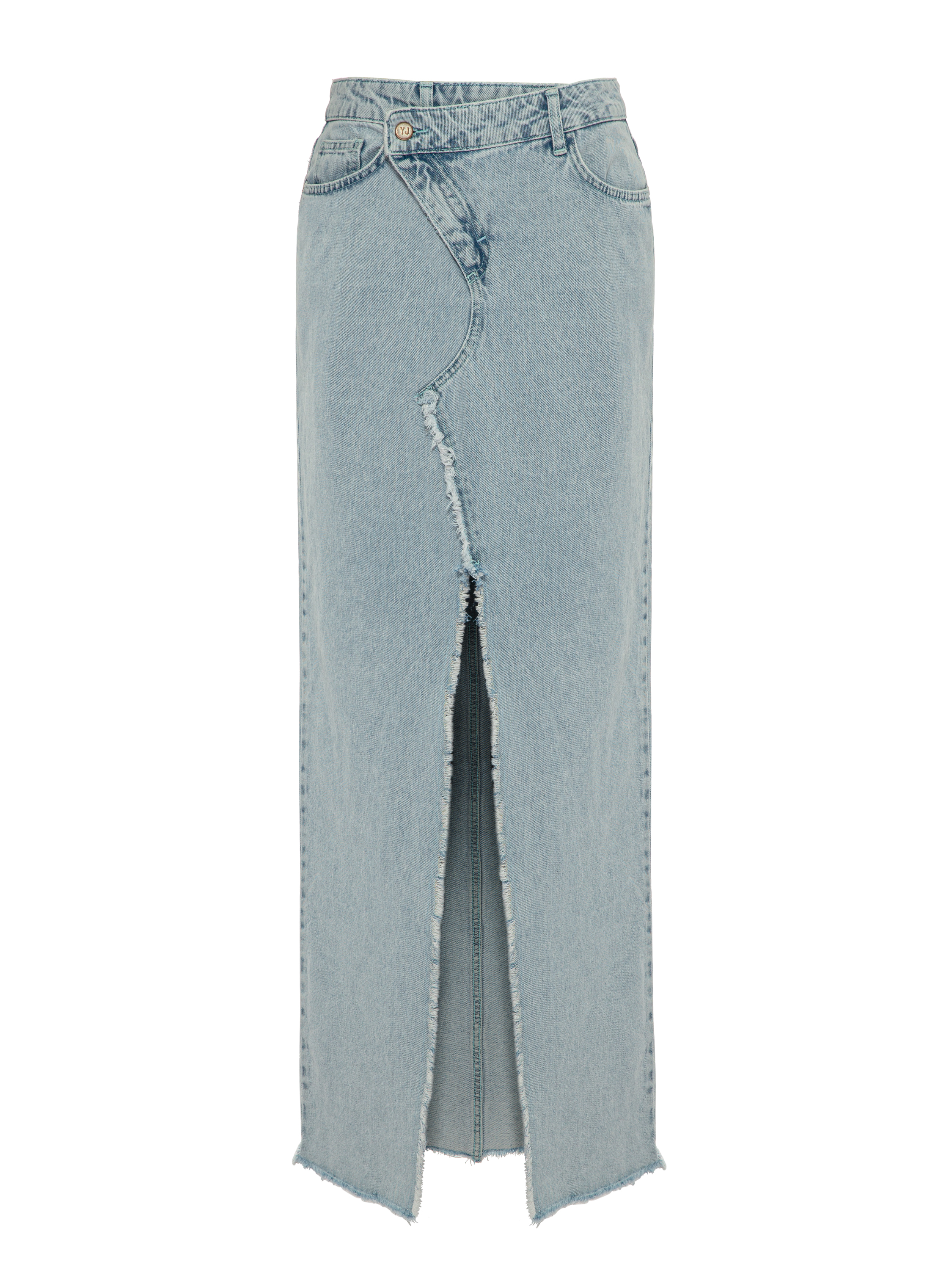 Maxi denim skirt from the Yana Jeans line is made of light blue pure cotton and complemented by an asymmetric closure, raw edges and a high slit at the front. Length of the item: 109.5 cm. Waist circumference: XS — 67 cm, S — 71 cm, M — 75 cm, L — 79 cm, XL — 83 cm.