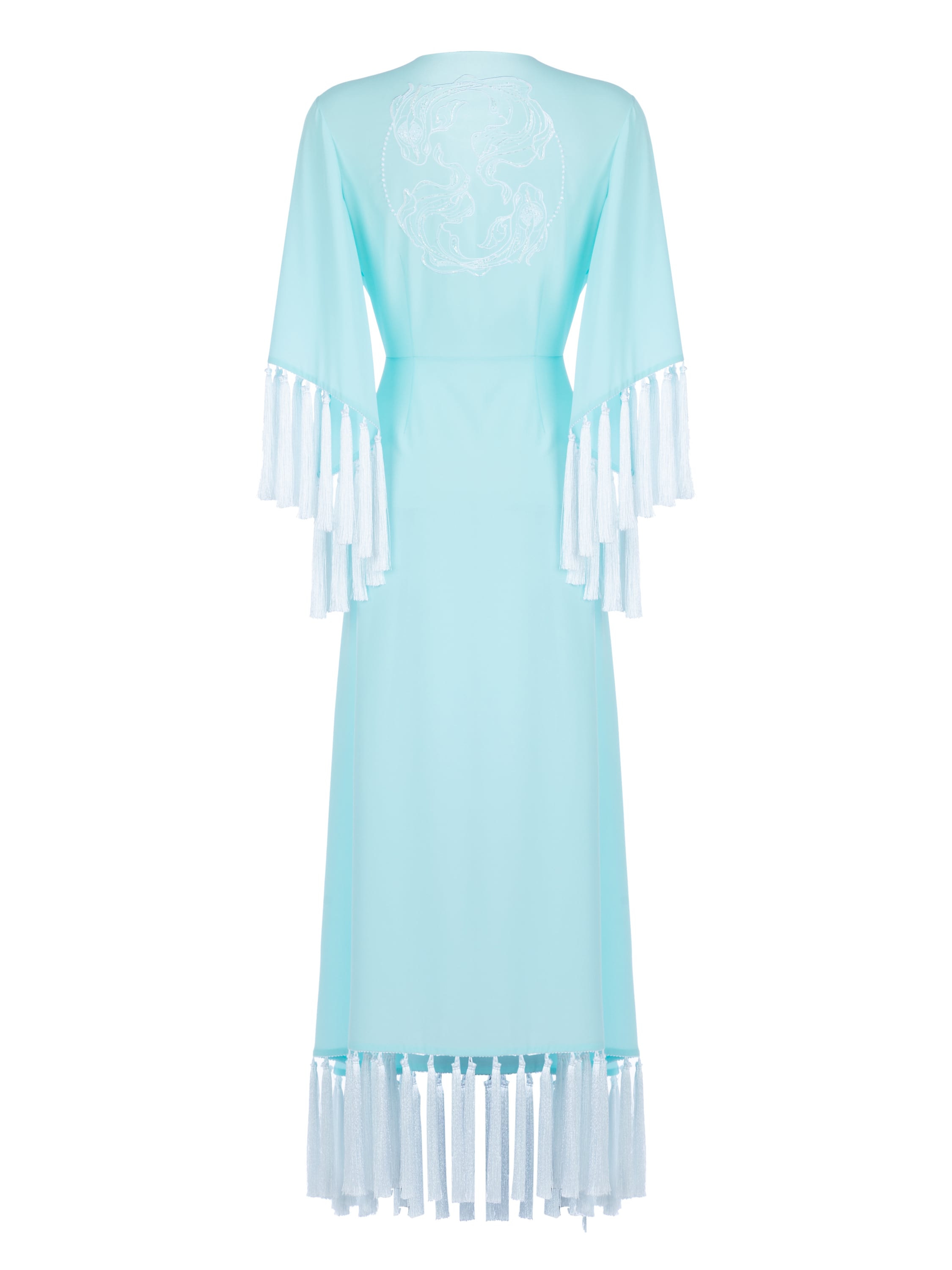 The light blue chiffon midi dress with wide kimono-style sleeves is wrap-style and complemented with beaded embroidery on the back. The hem and sleeves are decorated with white fringe. All that’s left is to put on mules and take a miniature clutch in your hand.