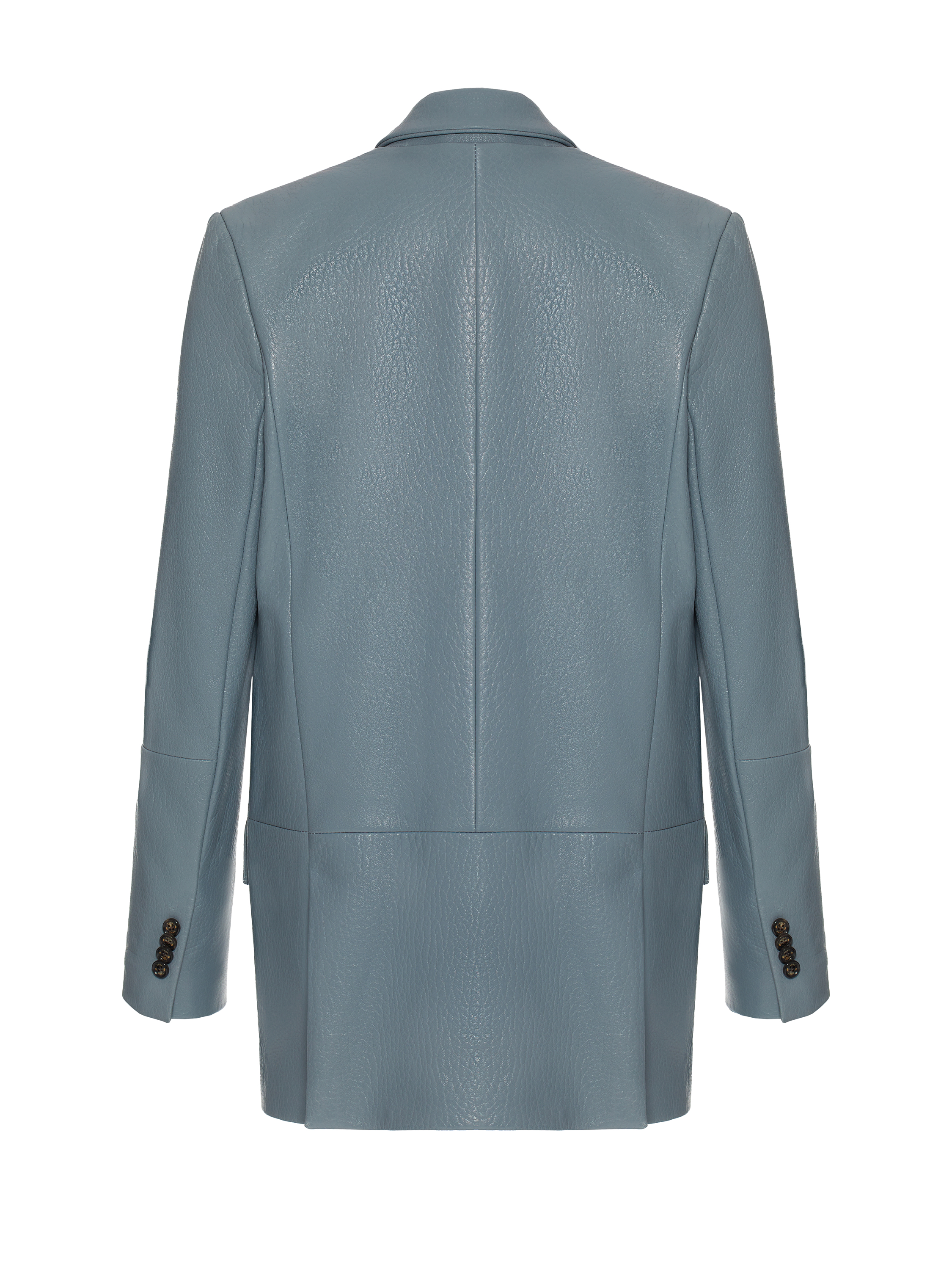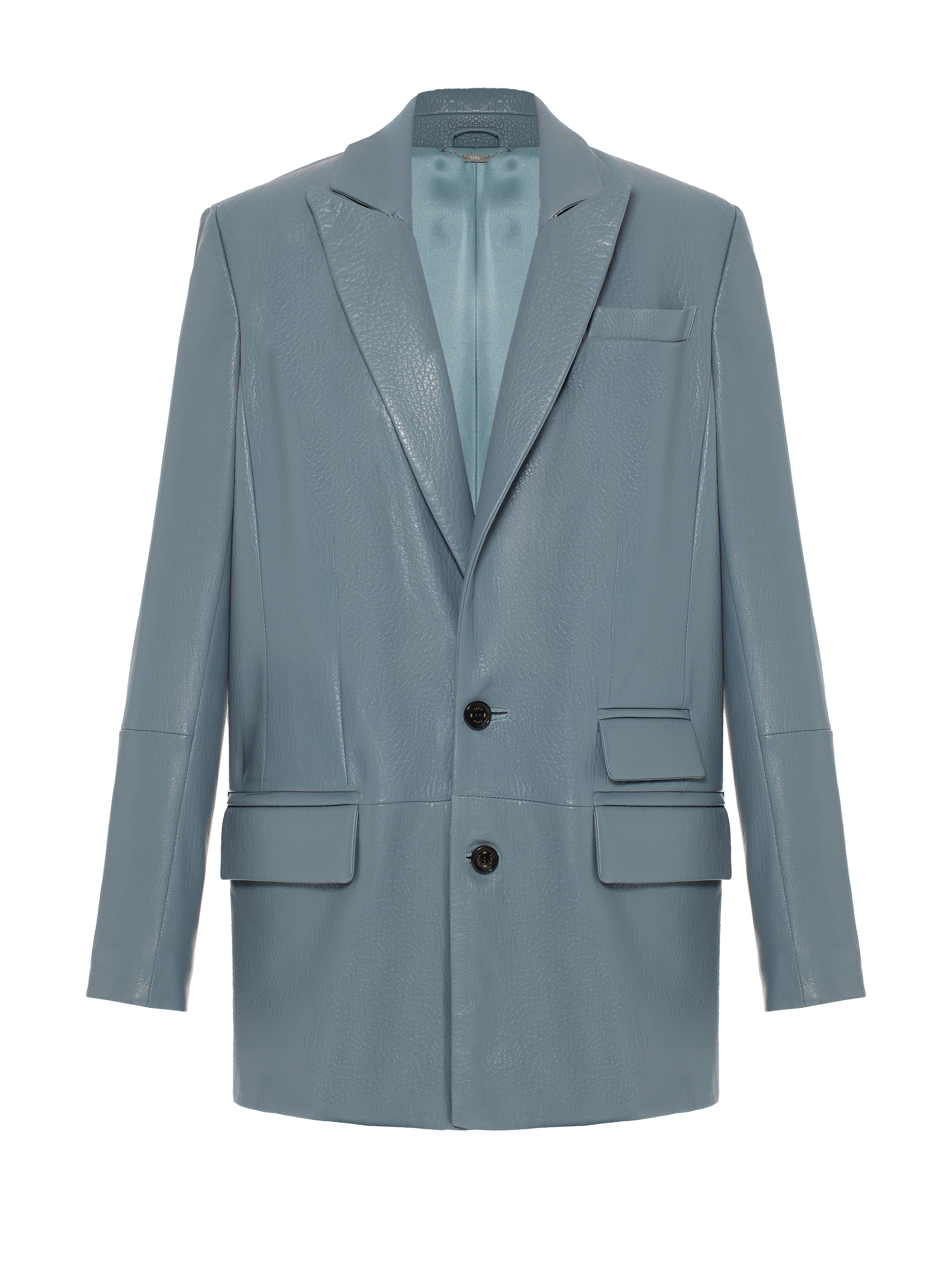 Light blue single-breasted straight-cut blazer made of textured genuine leather. The model is complemented by welt pockets with flaps on the sides and shaped lapels.