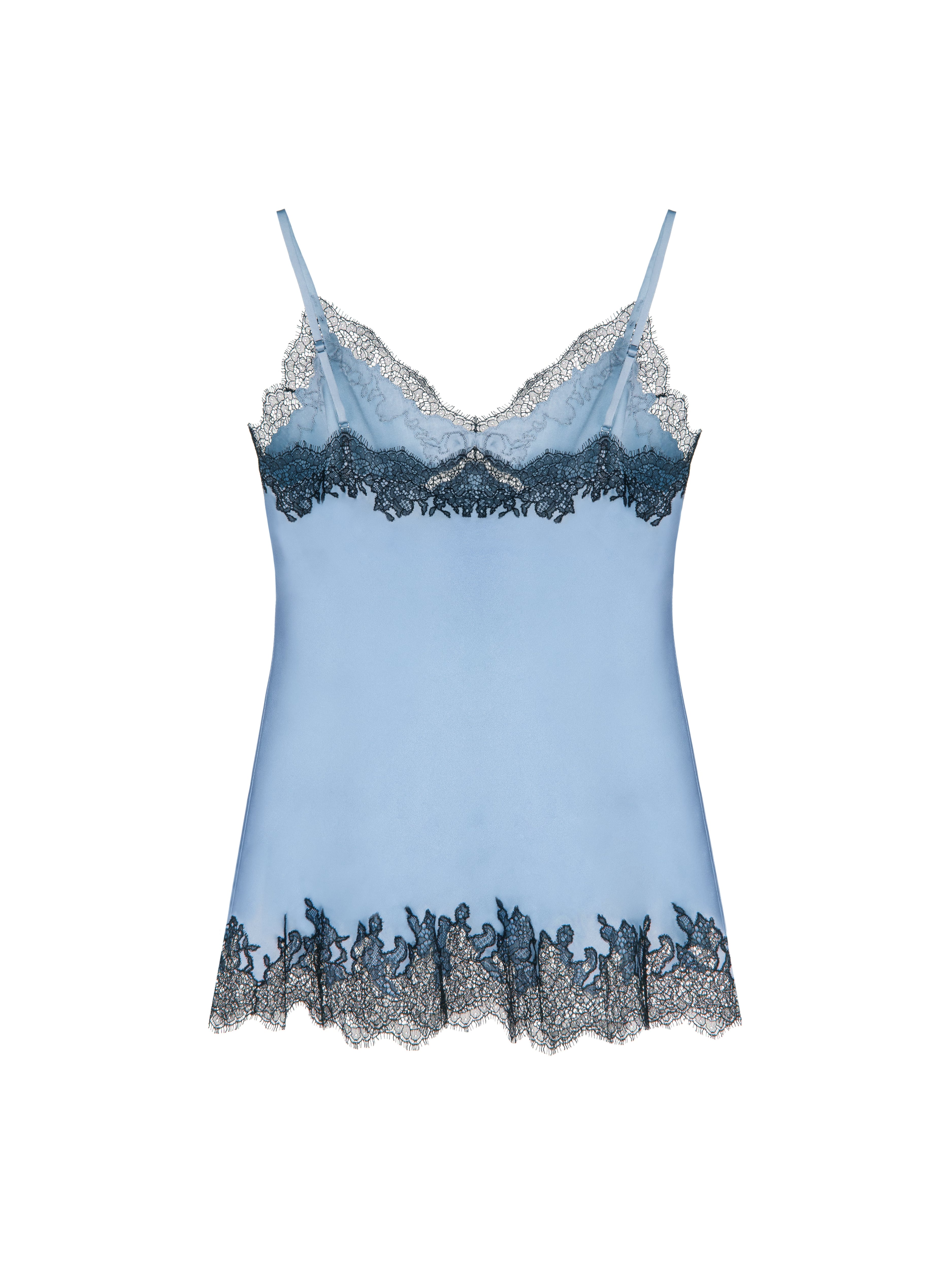 A light blue silk top will serve as a basis for creating a sensual look. The lightweight lingerie-style model is decorated with openwork black lace. The fit can be easily adjusted with sliders on the narrow straps.