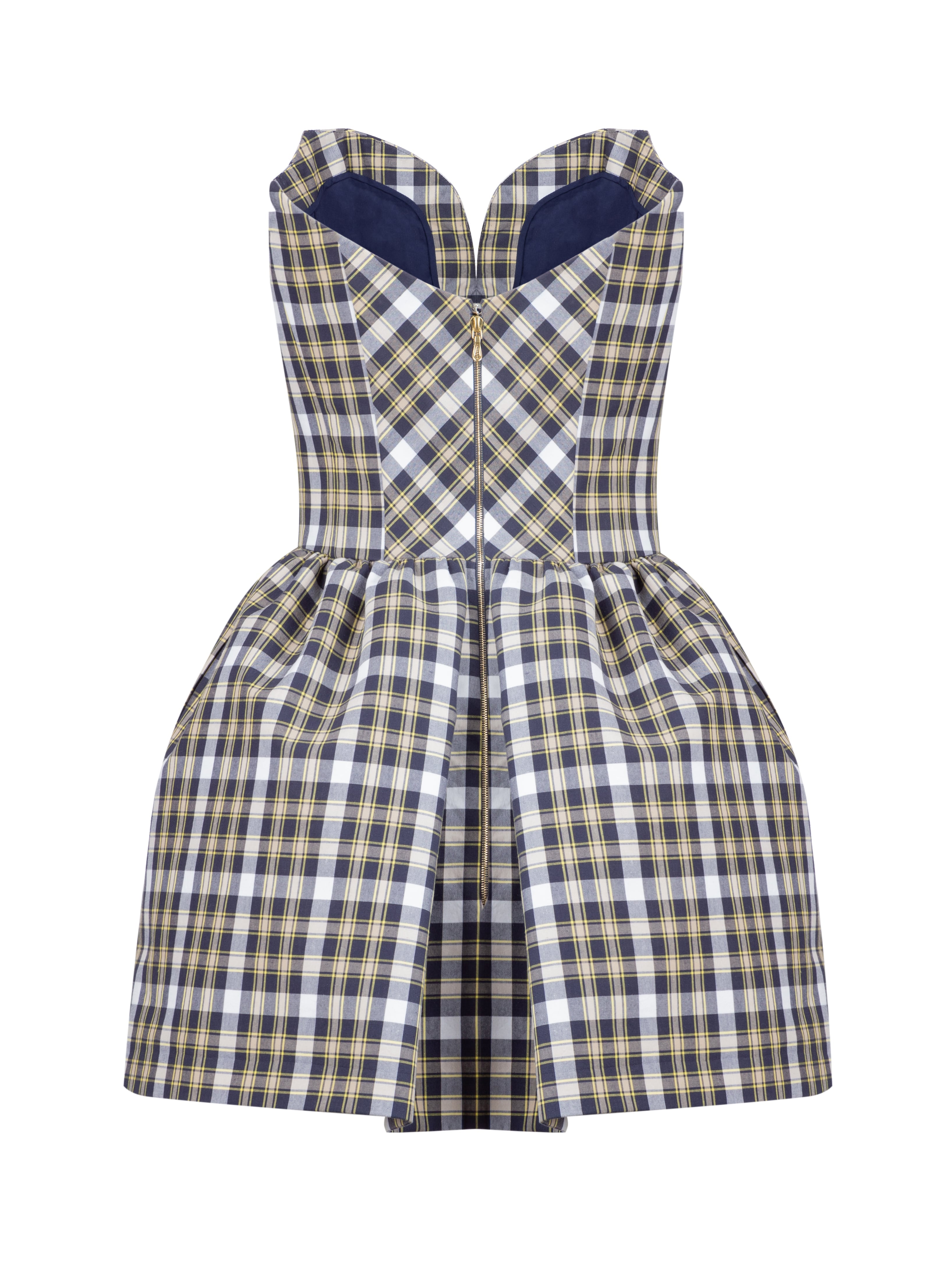 A blue-and-yellow checked mini dress with an open shoulder line, a full skirt and a heart-shaped neckline is the embodiment of femininity and elegance. The model is made of natural cotton and complemented with a gold zipper at the back.