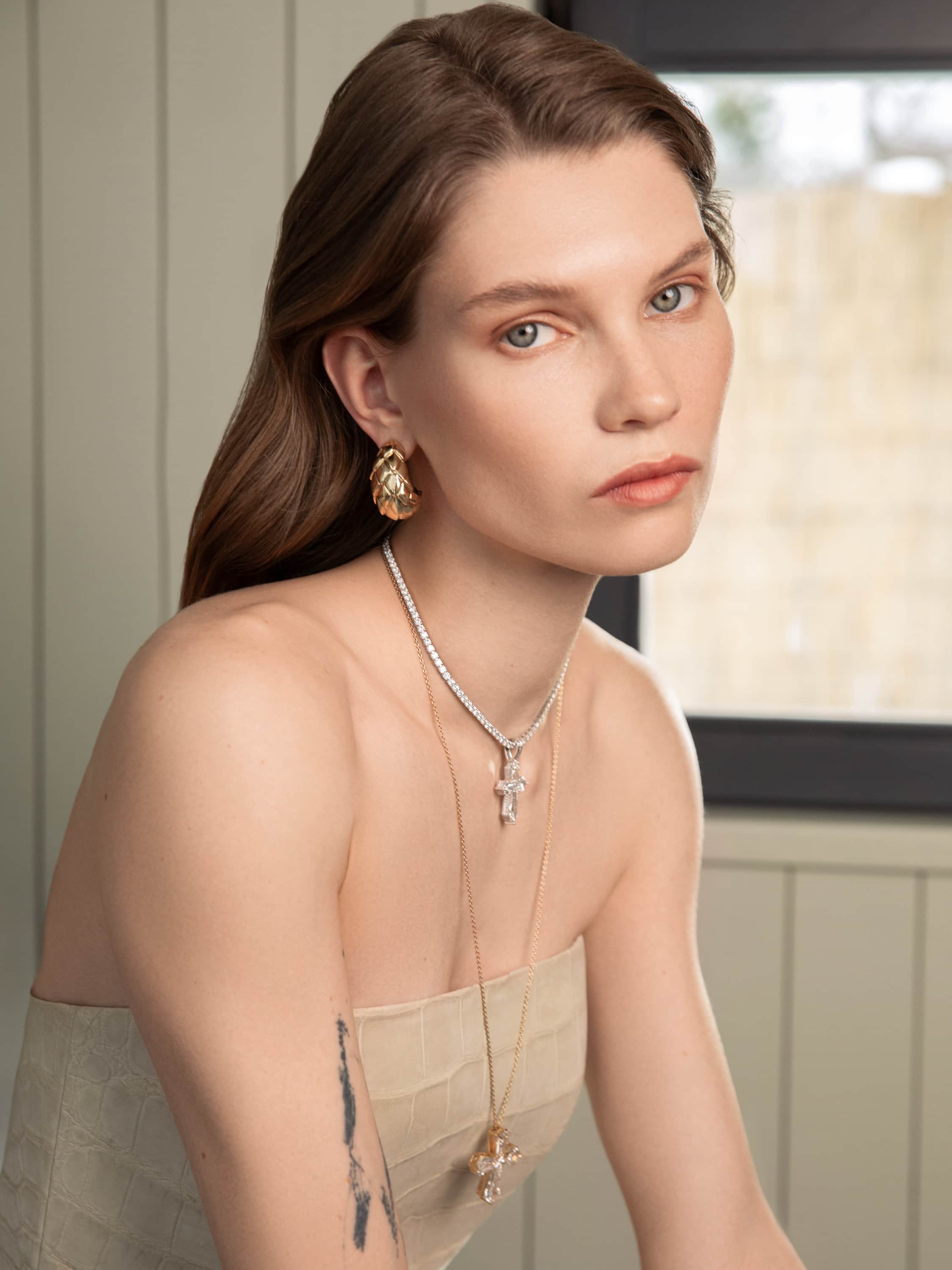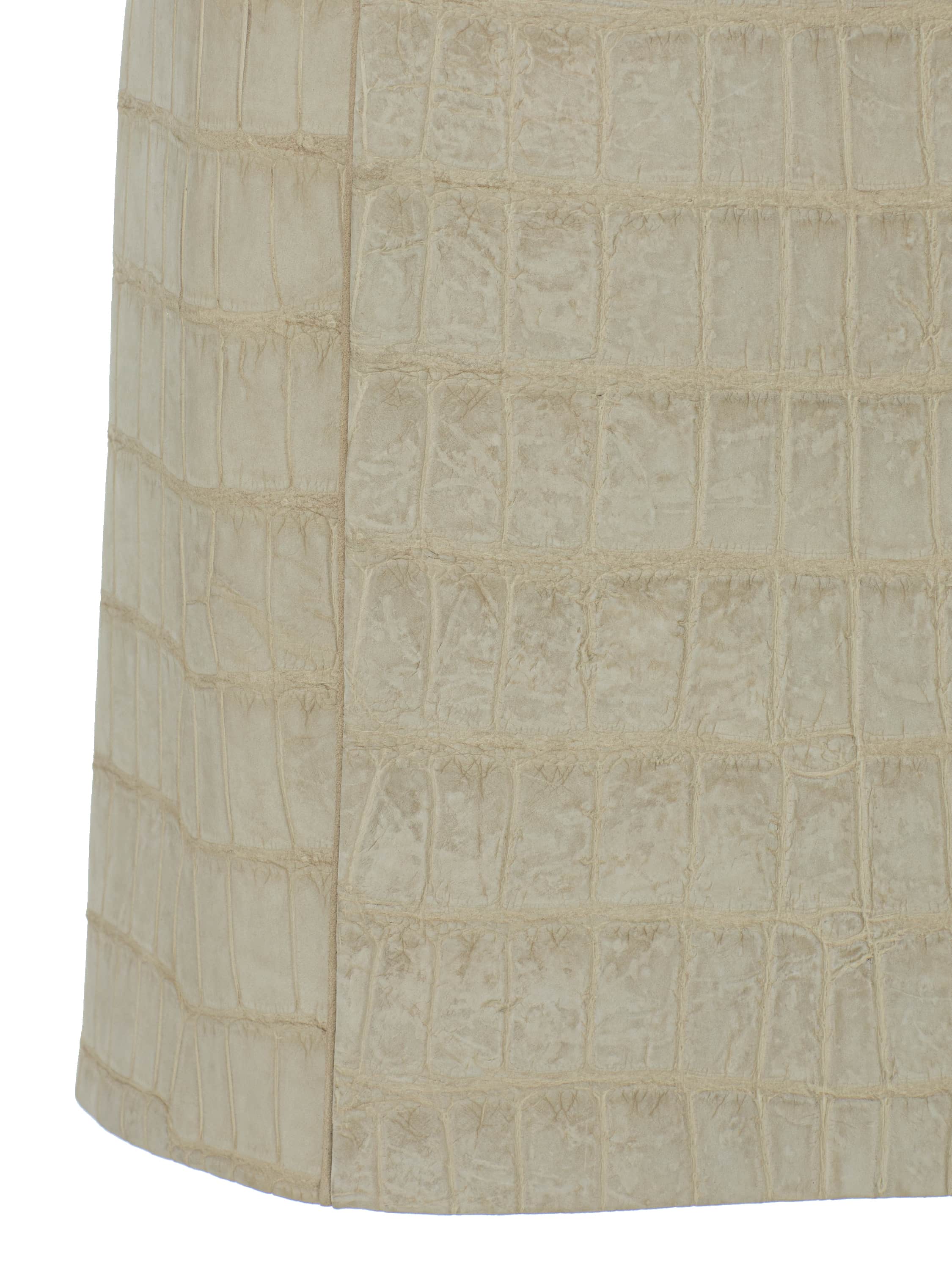 The minimalist set of a corset and a mini skirt is made of beige crocodile leather. The set from the new Yana Dress collection is easy to combine with any jewelry sets. The corset and skirt fasten with zippers at the back.
