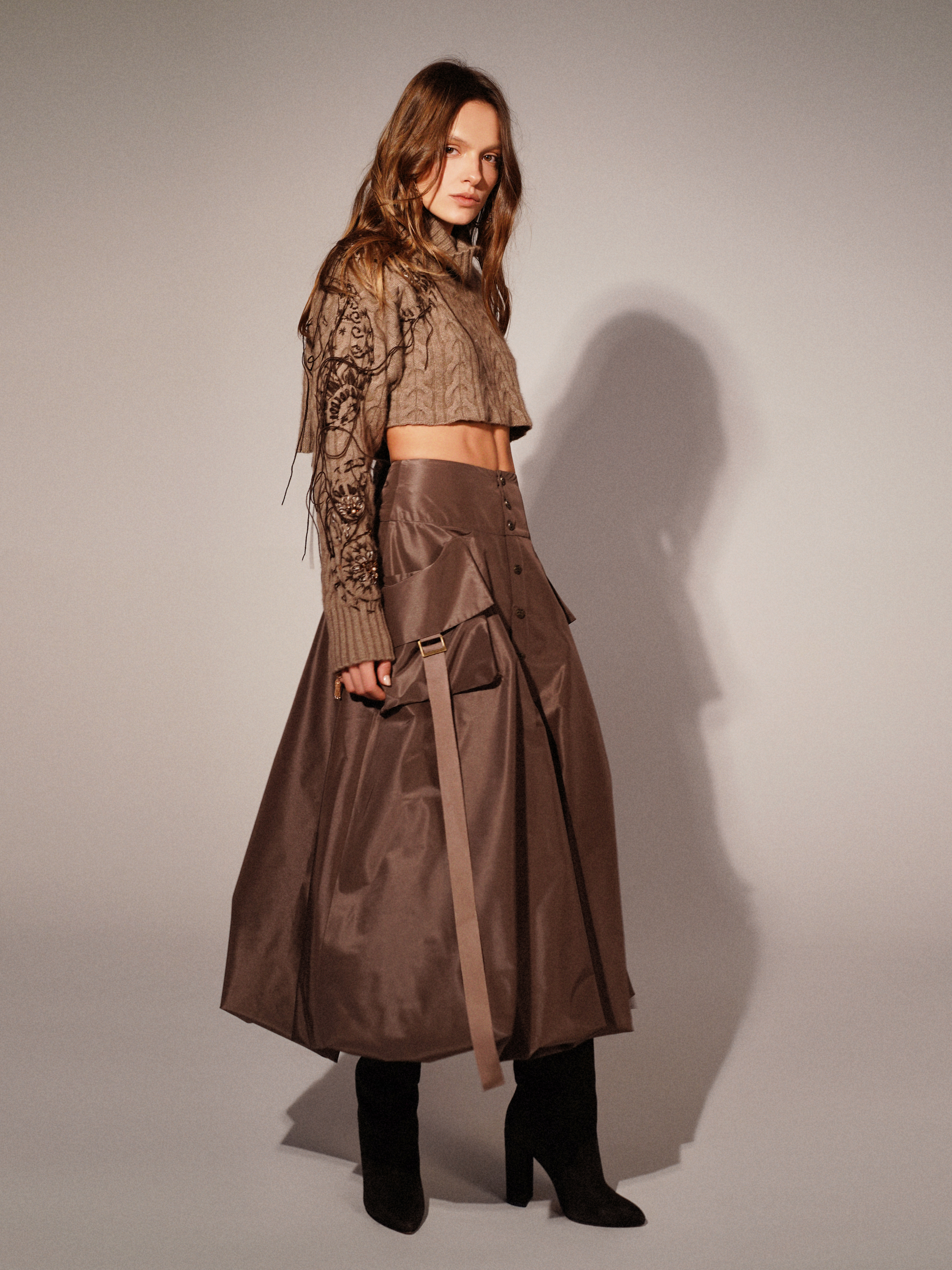 Brown balloon midi skirt made of shimmering taffeta. The model is complemented by two voluminous patch pockets with flaps on the sides. Fastens with branded snap buttons along the entire length.