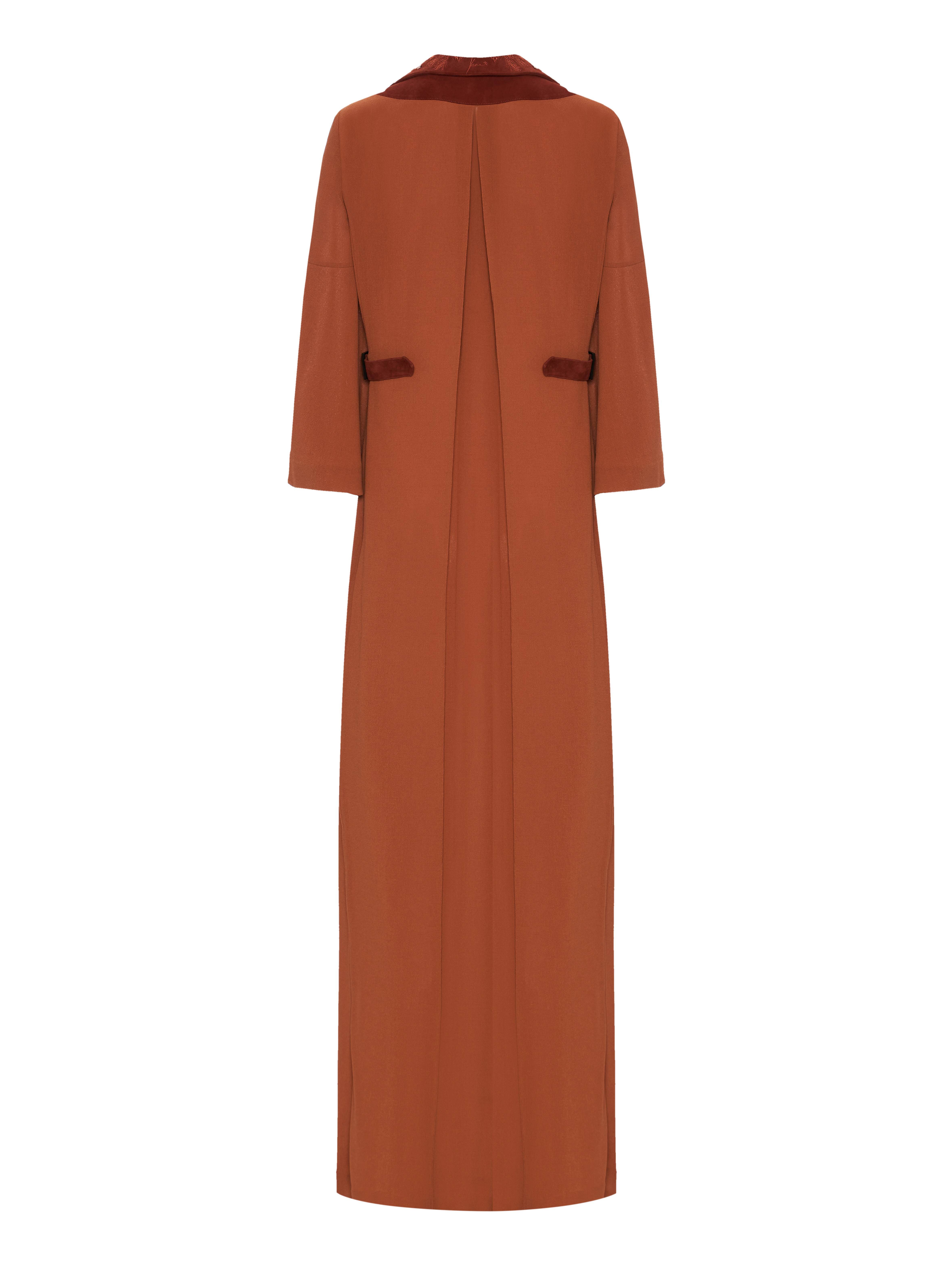 Brown maxi dress with flared 3/4 sleeves and lacing on the chest. The model has a comfortable, loose fit. The collar and trims are made of tone-on-tone genuine suede. Tassel ties at the front.