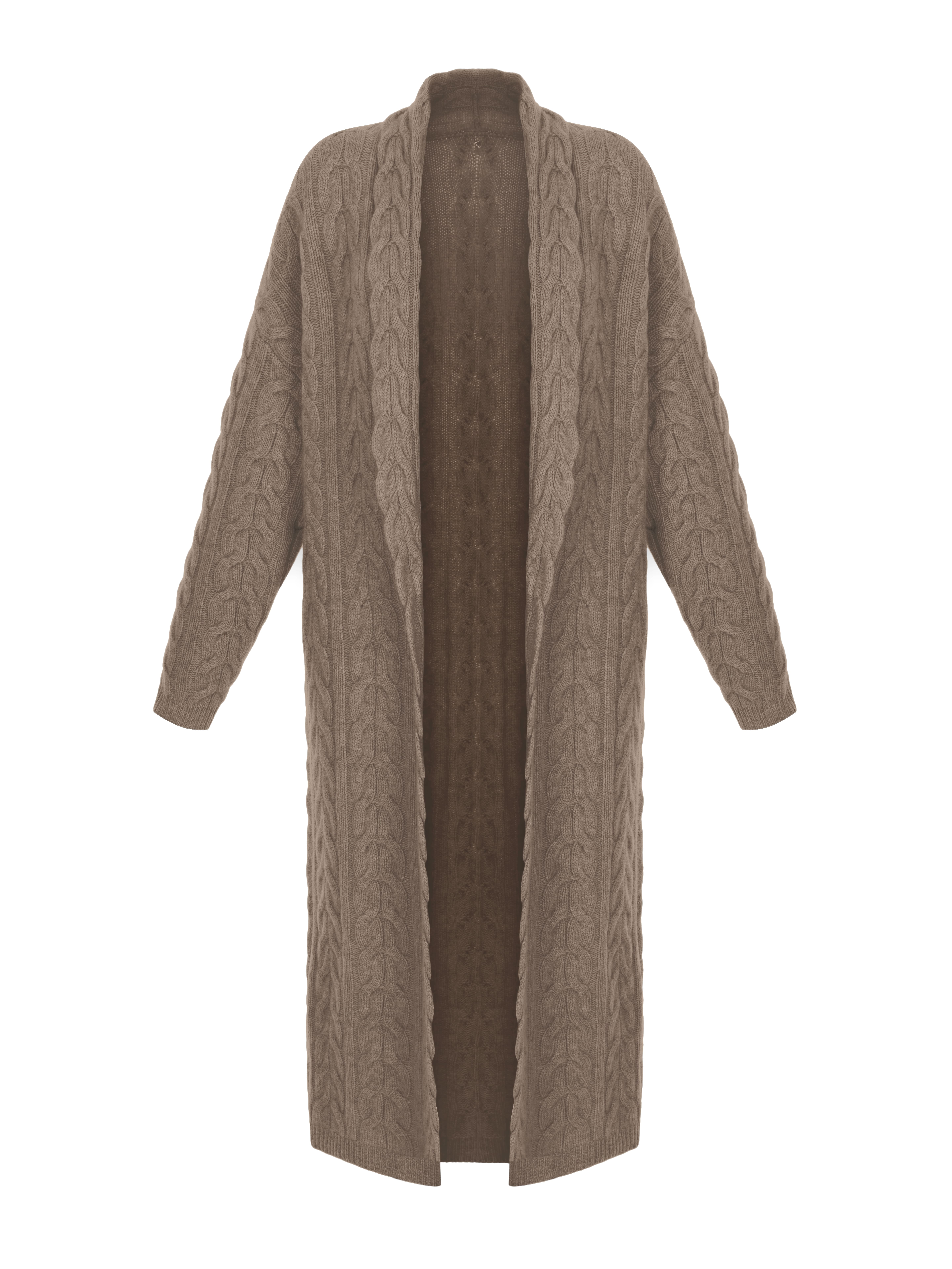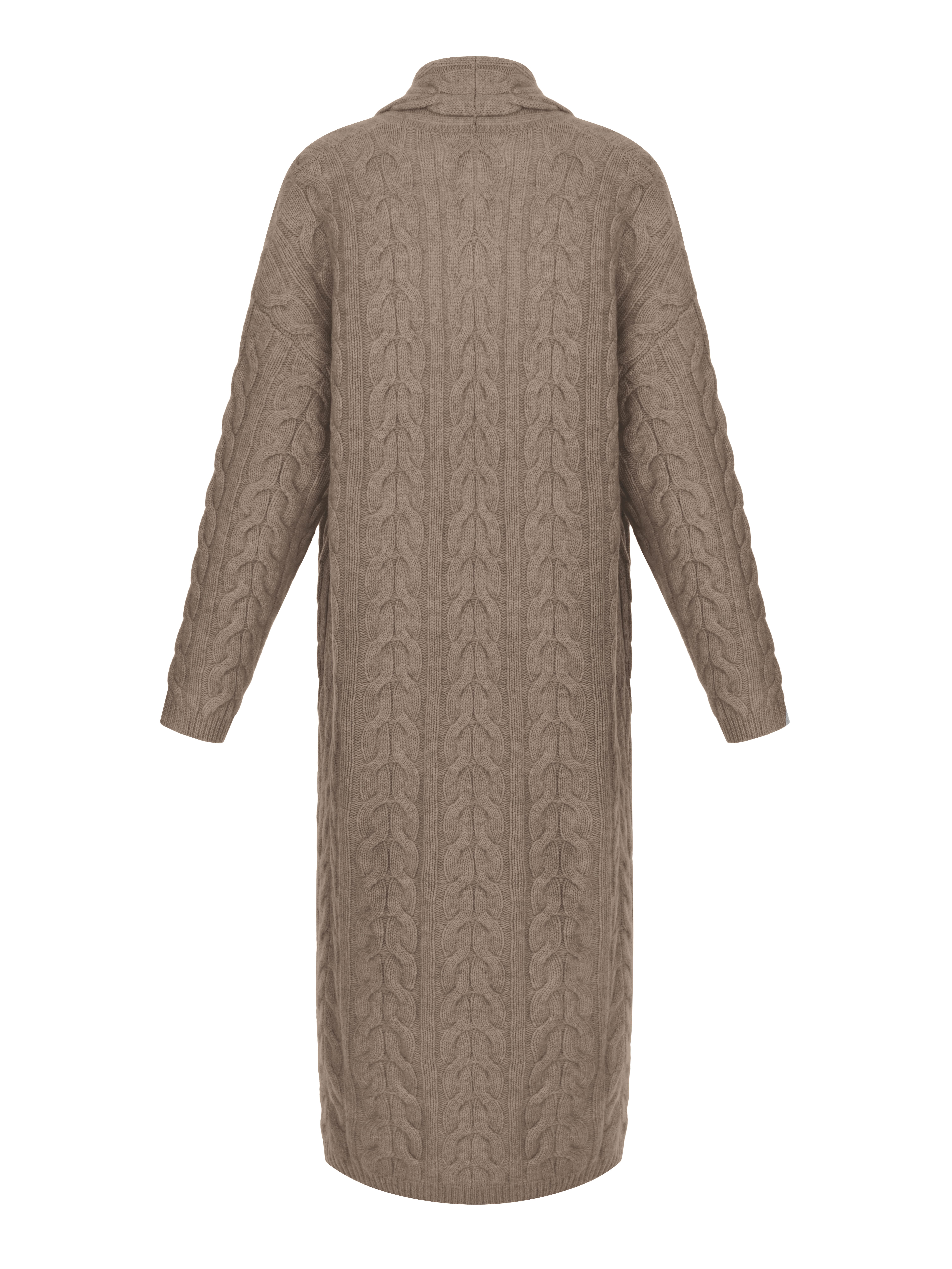 The knitted brown coat-cardigan is made of natural baby cashmere. Cable knit, no fastening, shawl collar.