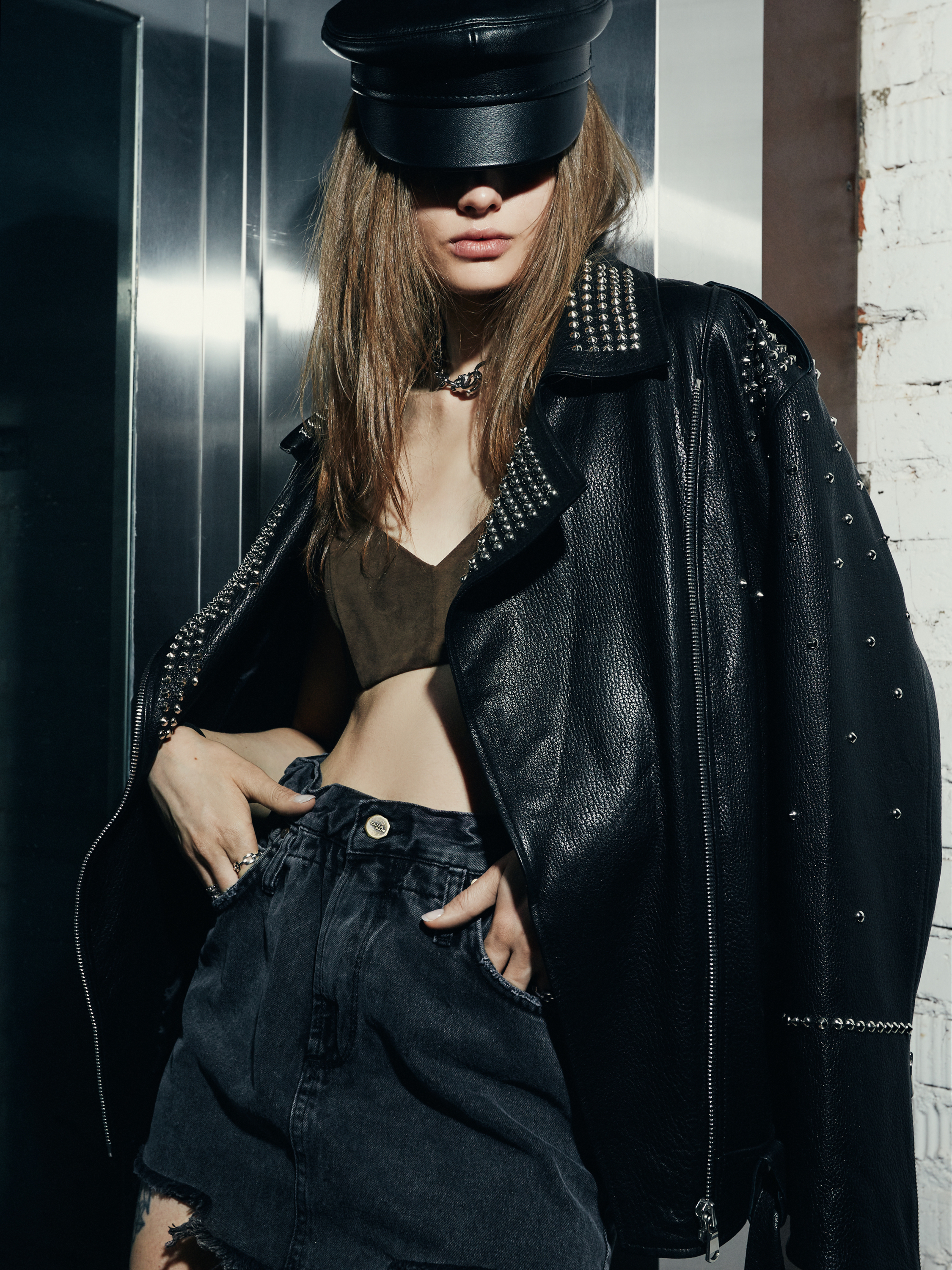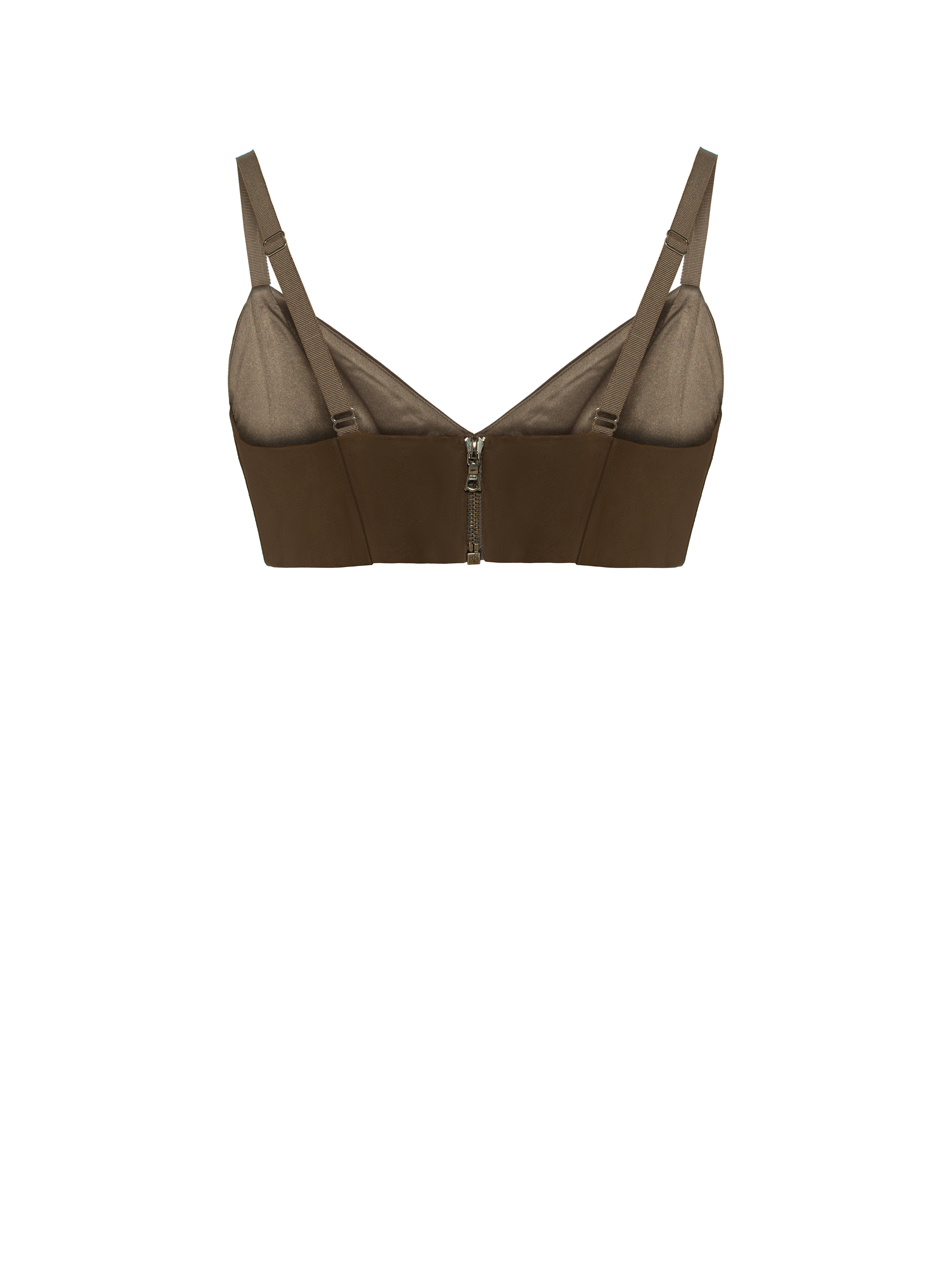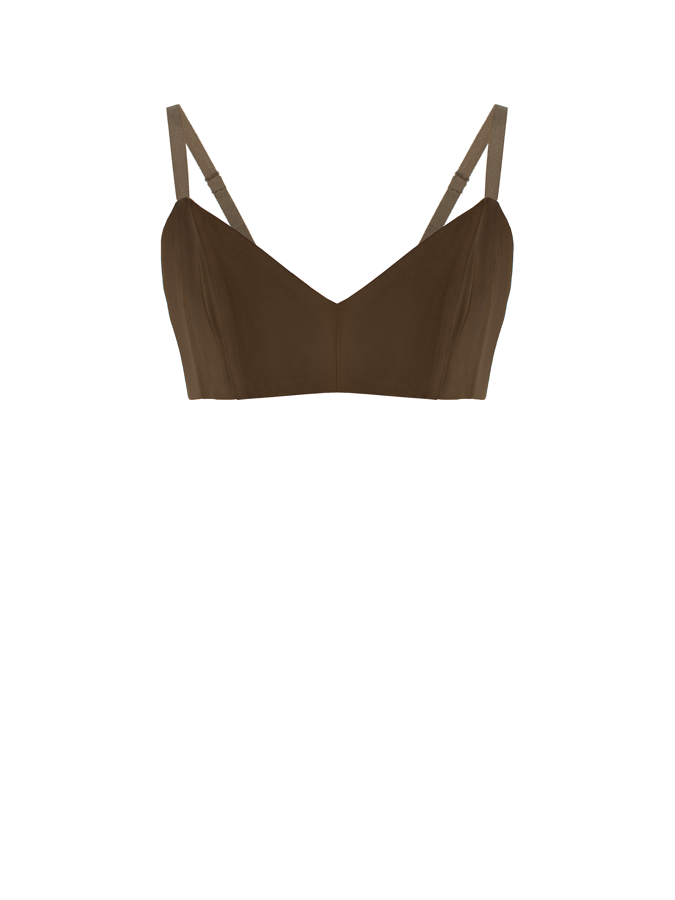 A short brown suede crop top with thin grosgrain straps. The model is complemented by a tonal natural silk lining. Fastens with a zipper at the back. The fit can be easily adjusted with sliders on the straps.