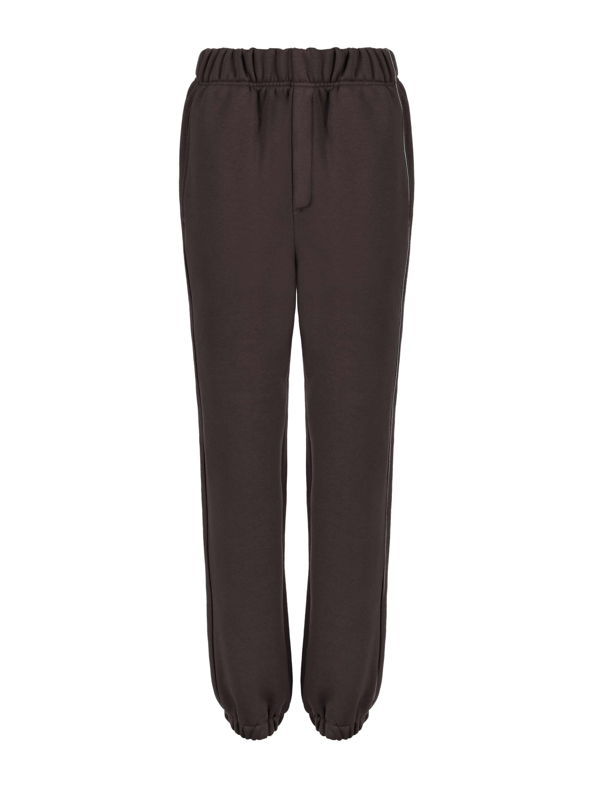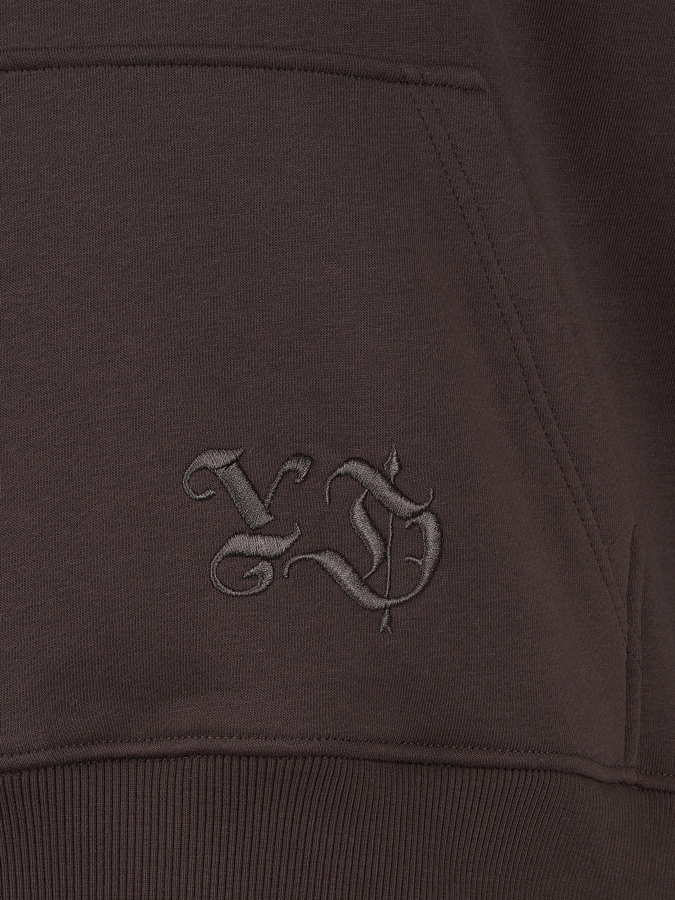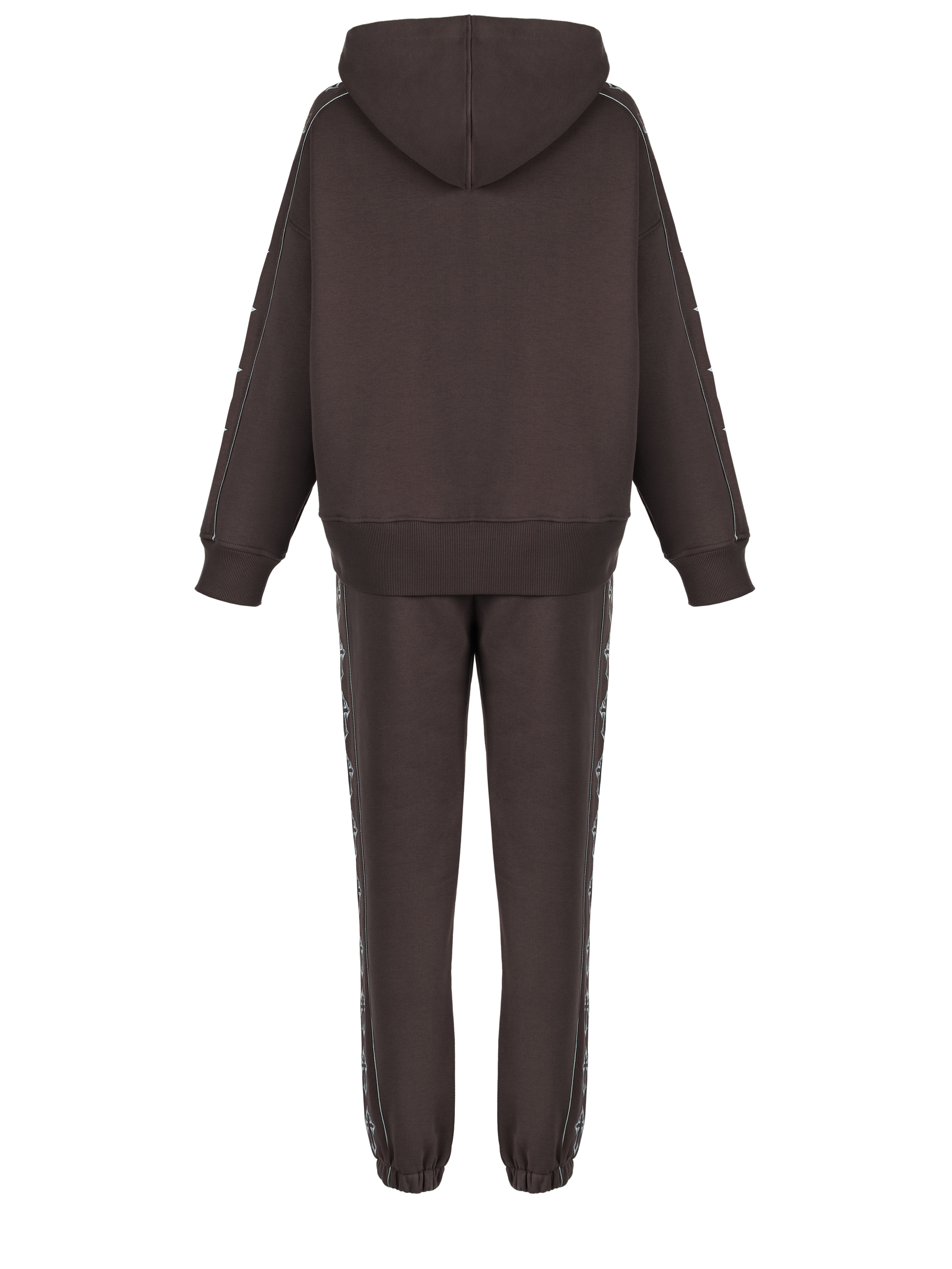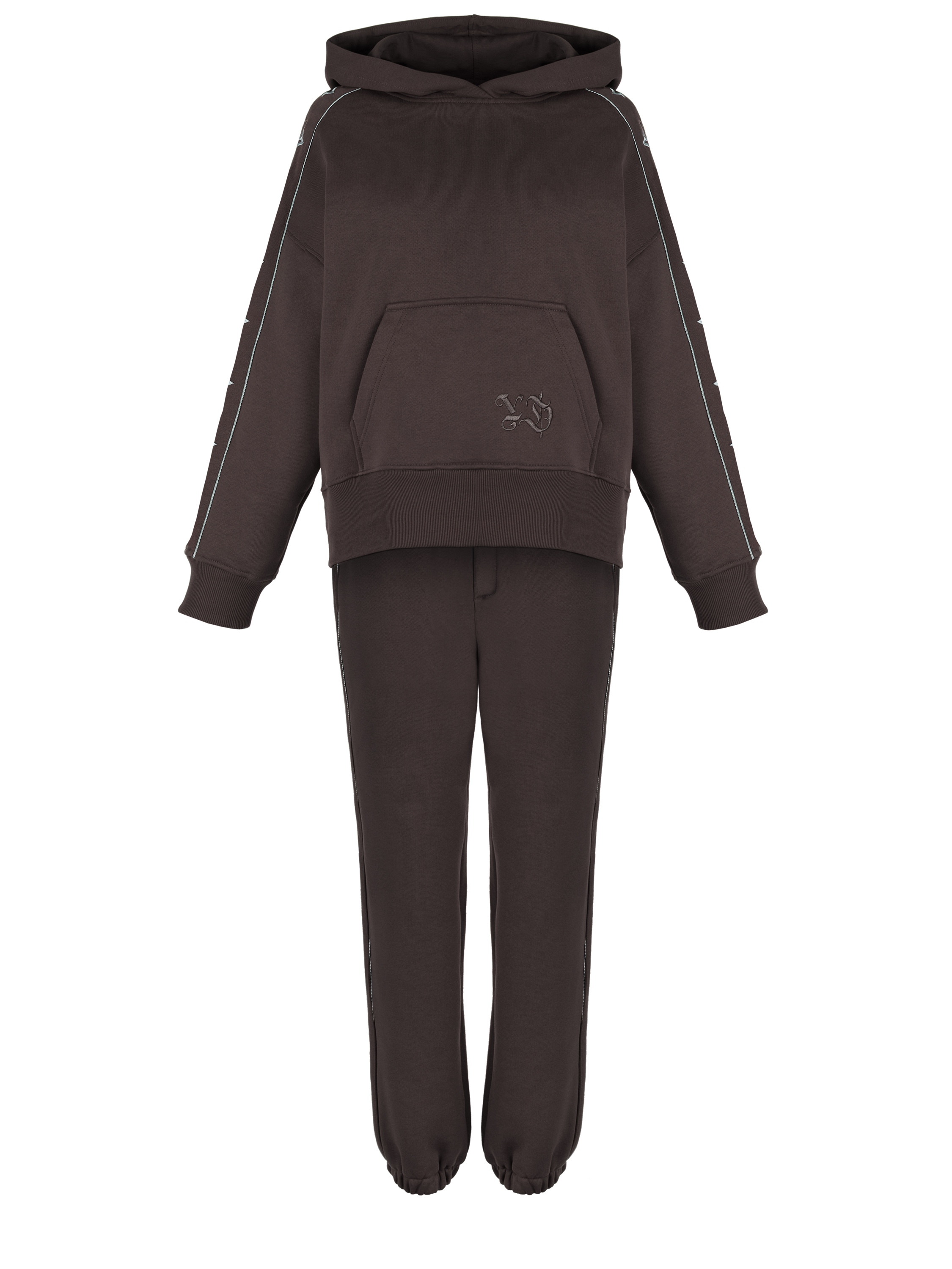 A jersey tracksuit in brown color consists of a hoodie with grey cross-shaped embroidery on the sleeves and jogger trousers with side stripes and elastic bands at the hem. A large kangaroo pocket with the brand logo on the front.