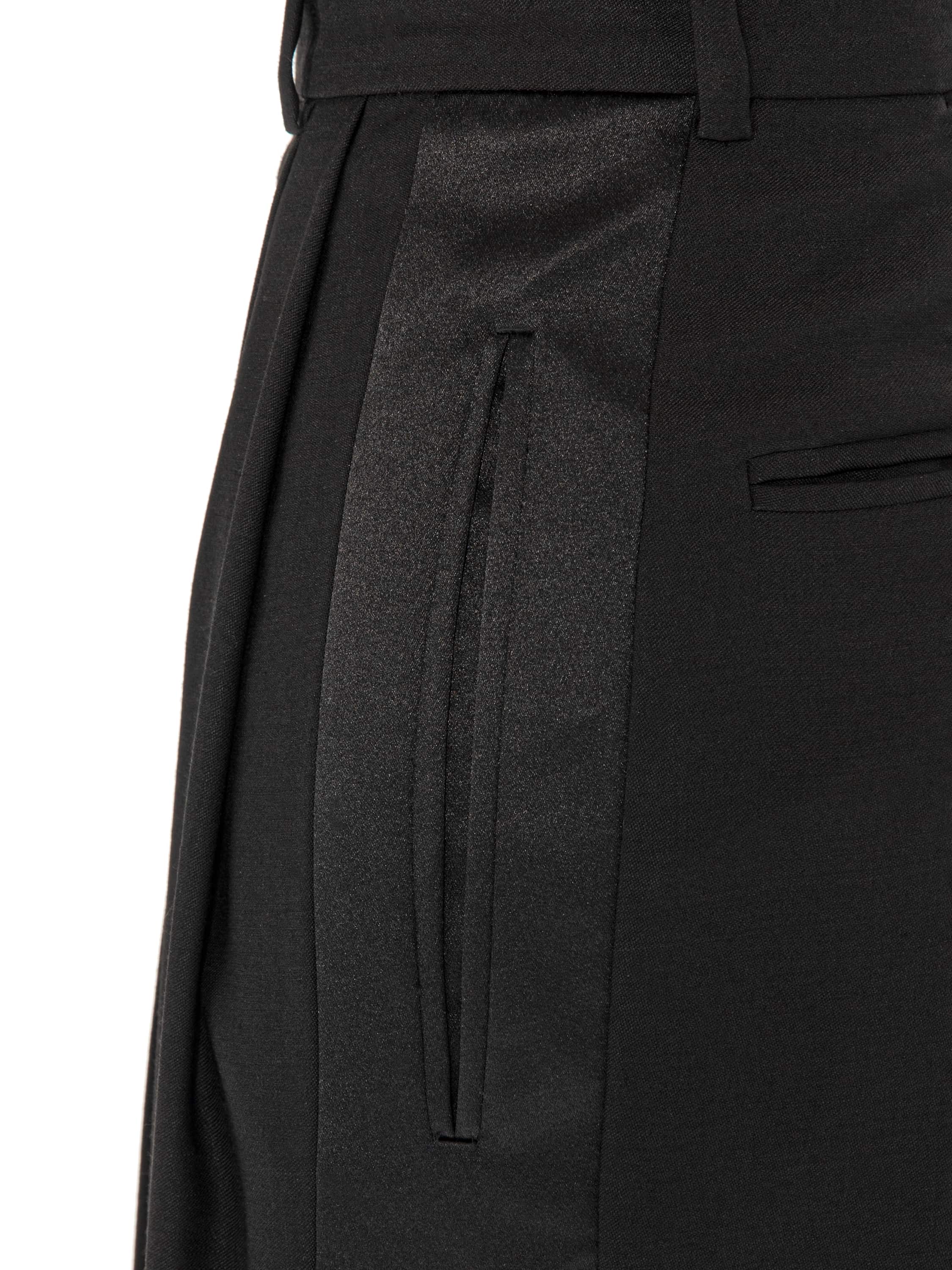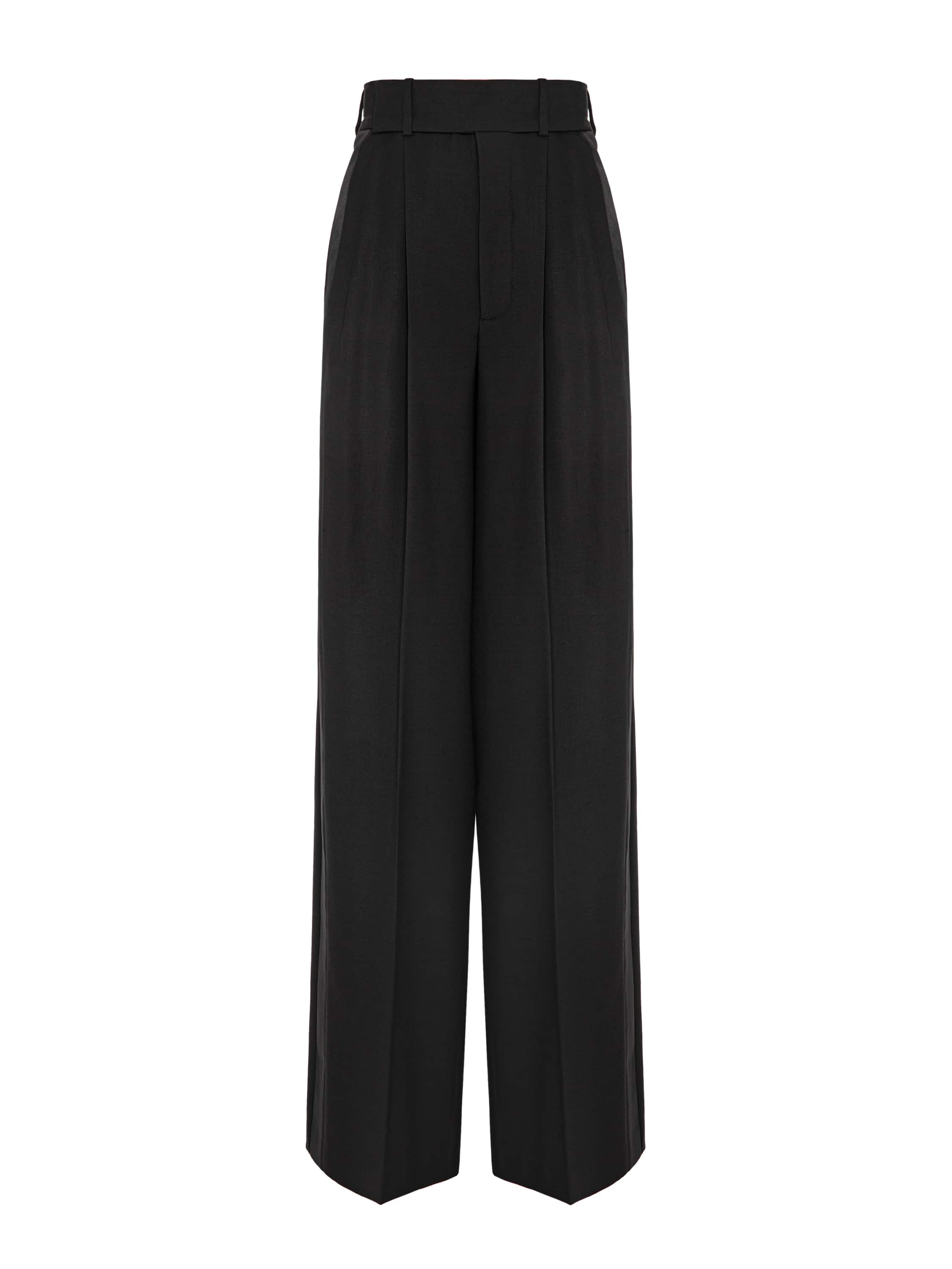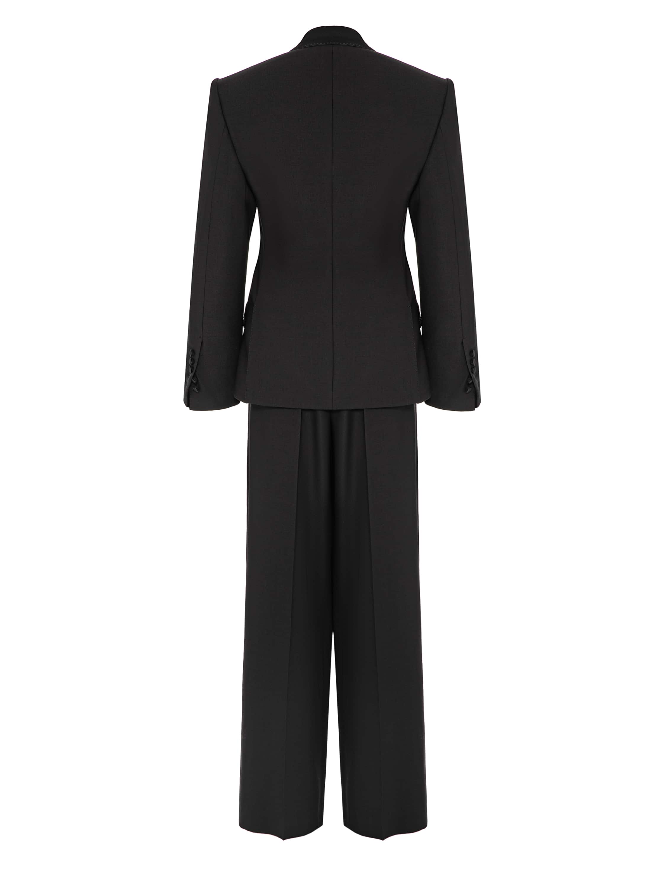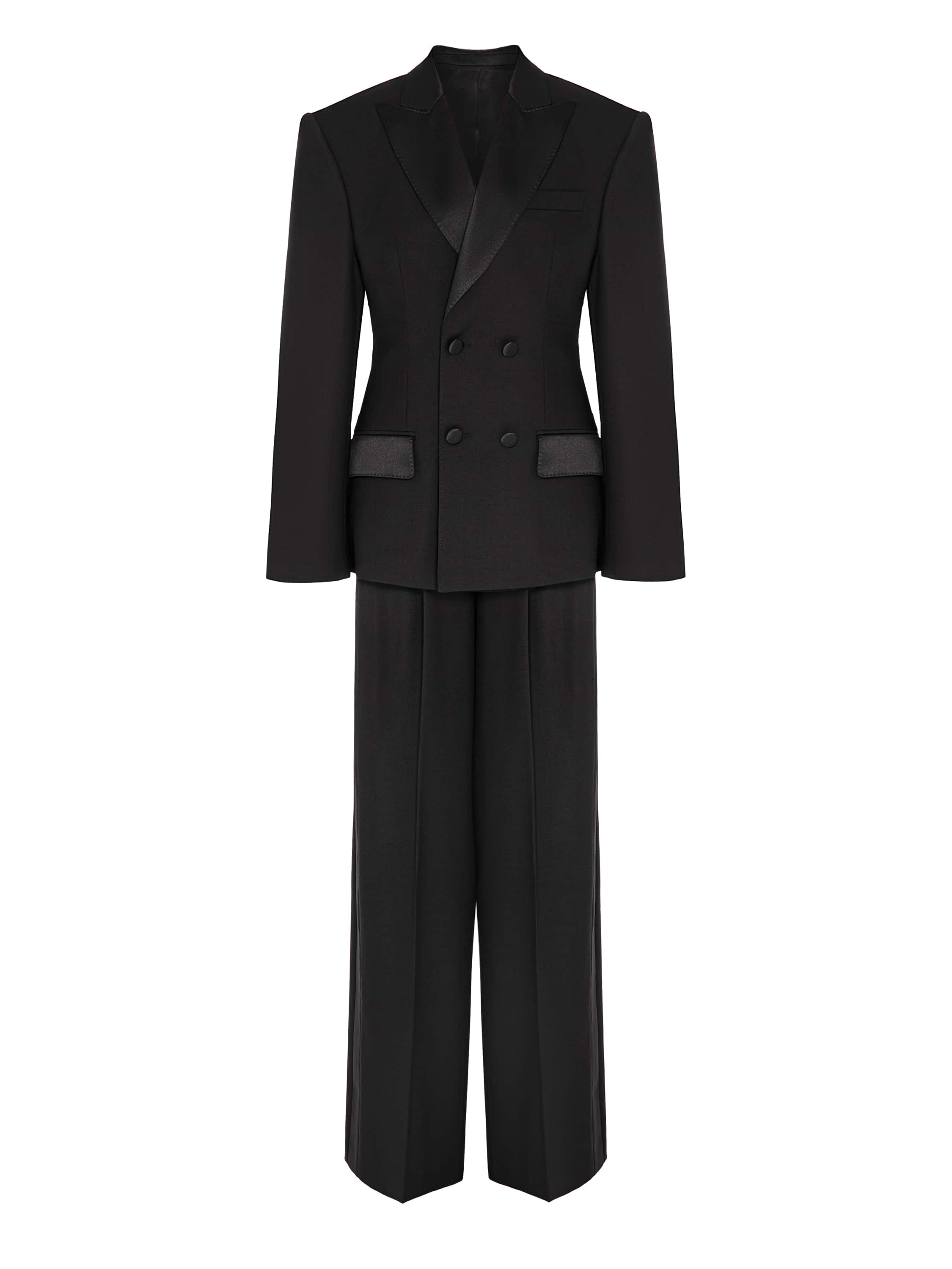 The laconic black two-piece suit consists of a double-breasted jacket and palazzo trousers with side stripes. The jacket is complemented by shaped lapels, a welt pocket and satin flaps.