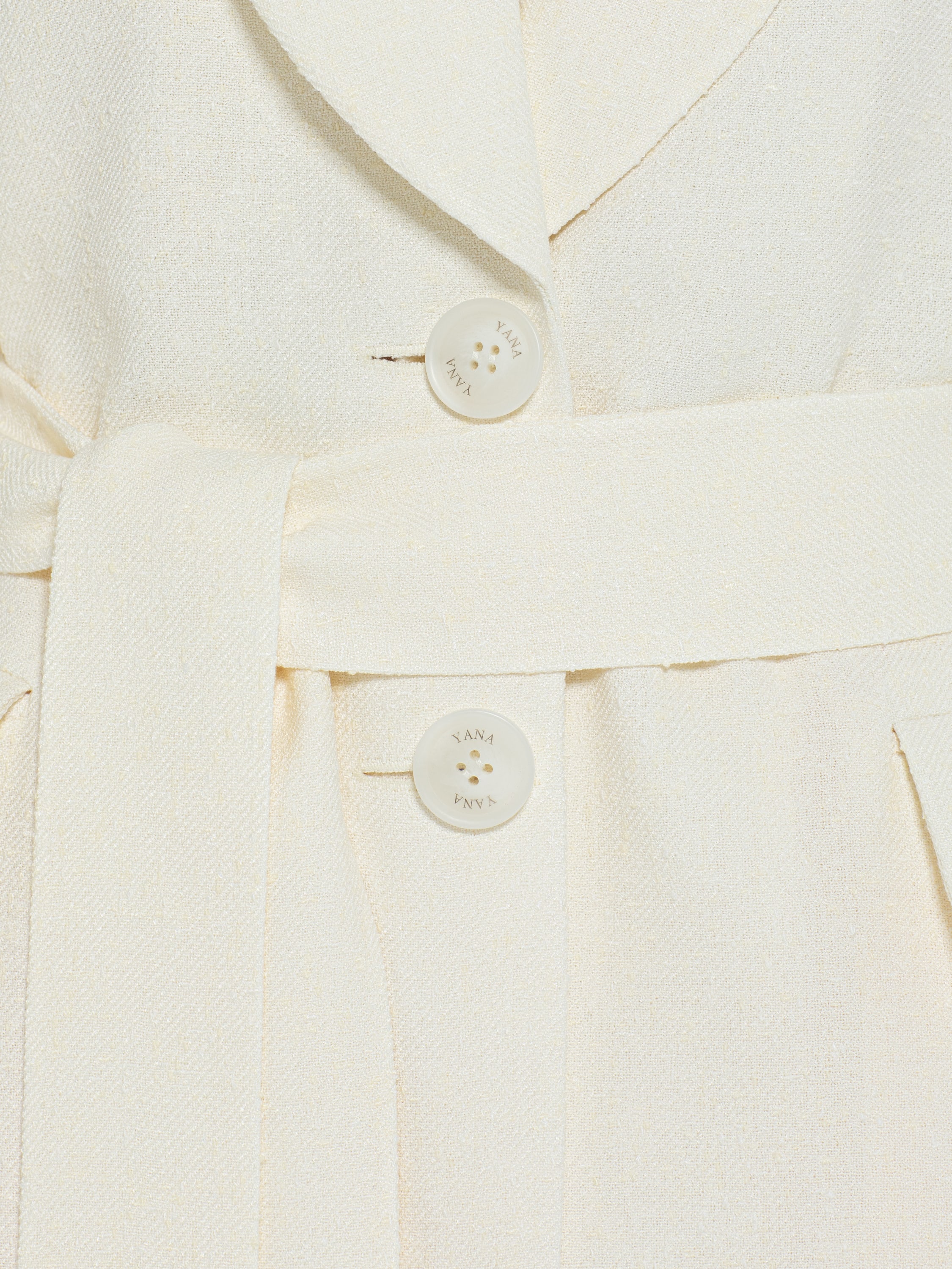 The milky tweed two-piece suit consists of a single-breasted jacket with a belt and straight-cut trousers. The laconic set is suitable both for a formal event and for a business meeting.