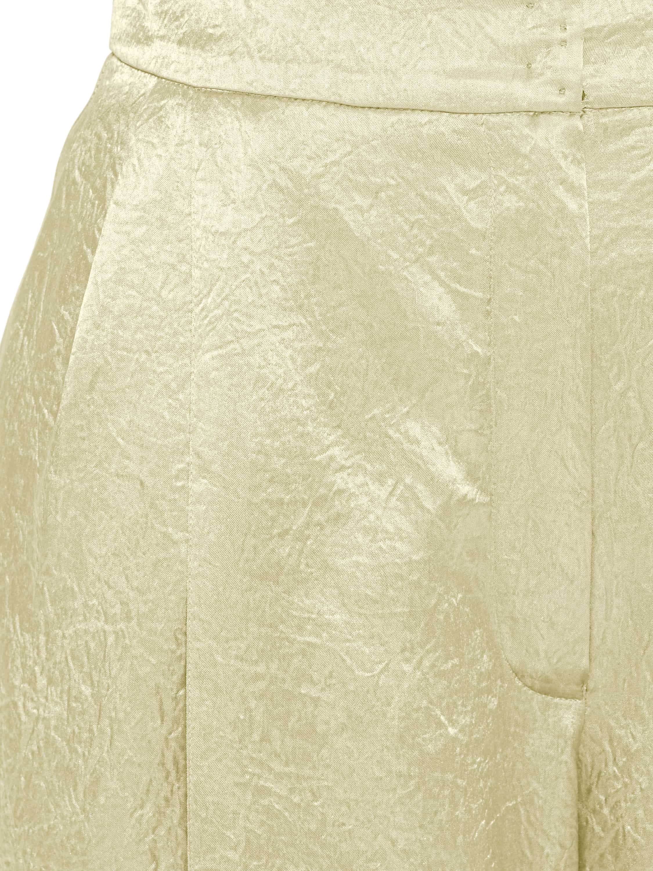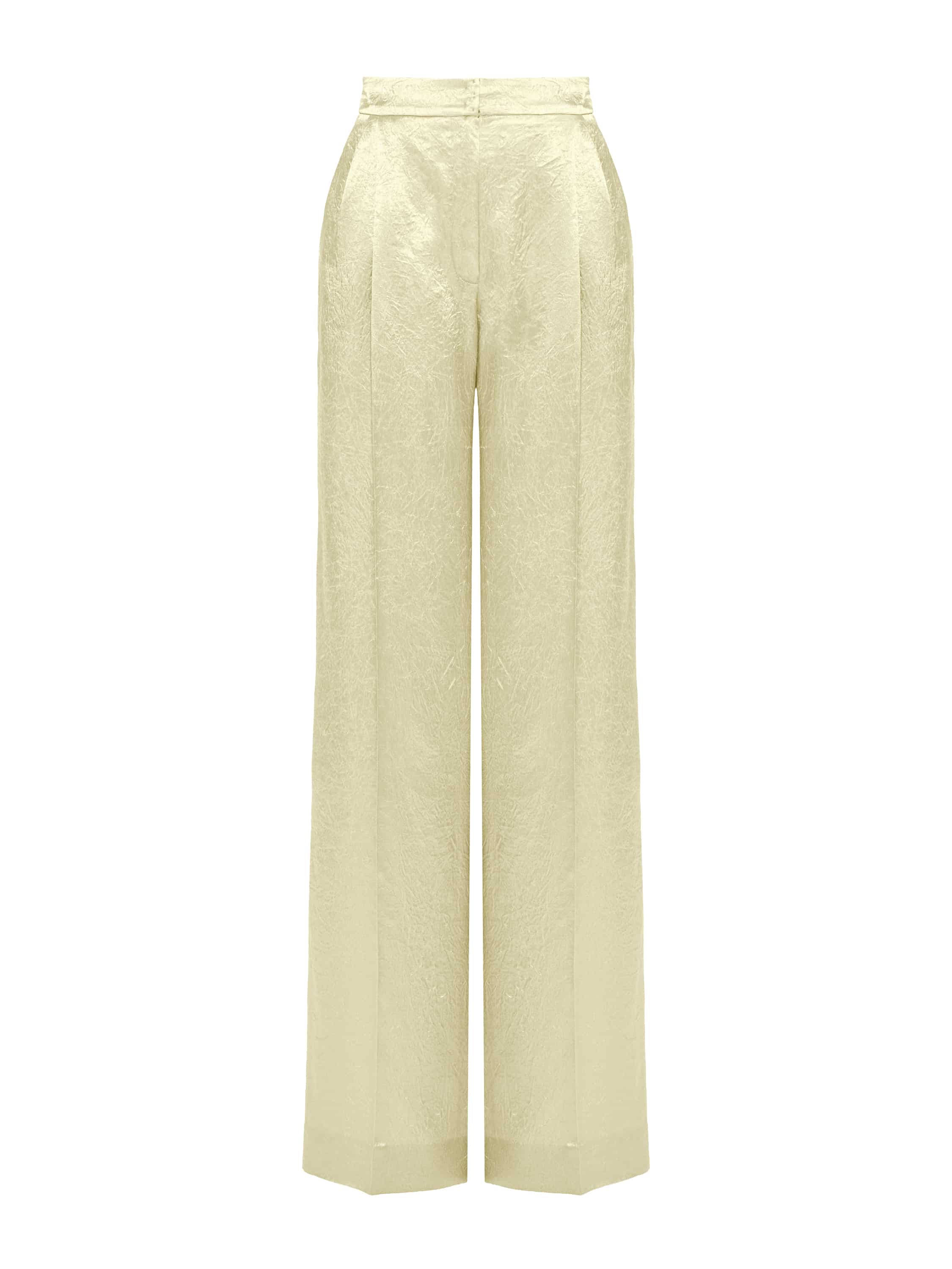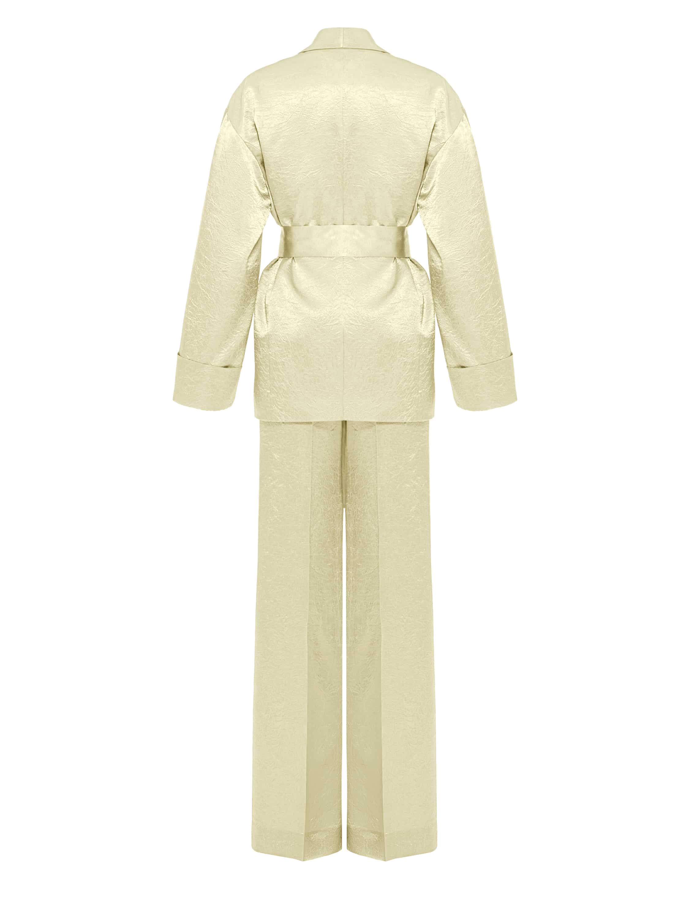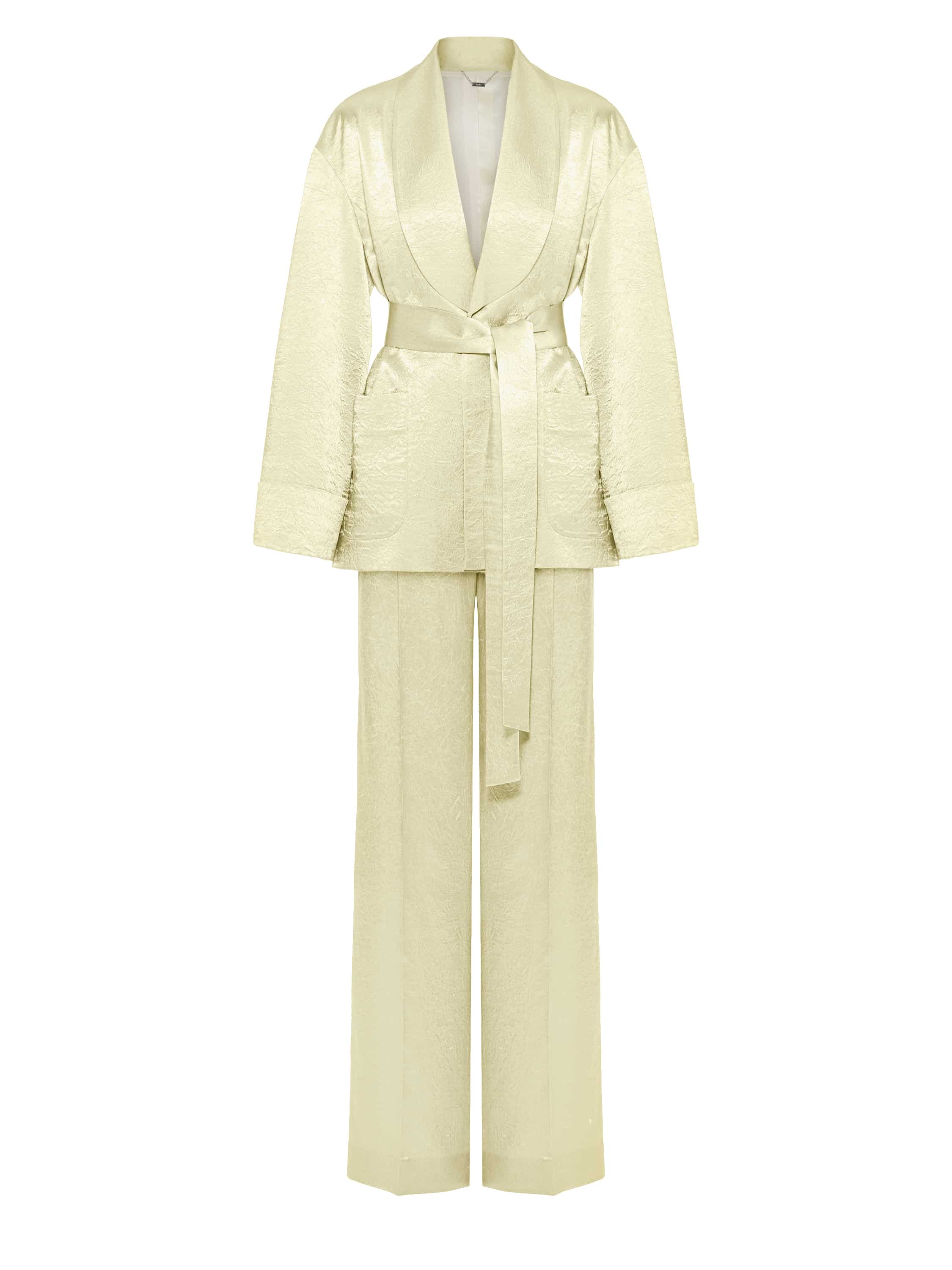 The suit is made of natural yellow silk. The set consists of a cropped robe with a belt and pockets, and loose trousers with pressed creases.