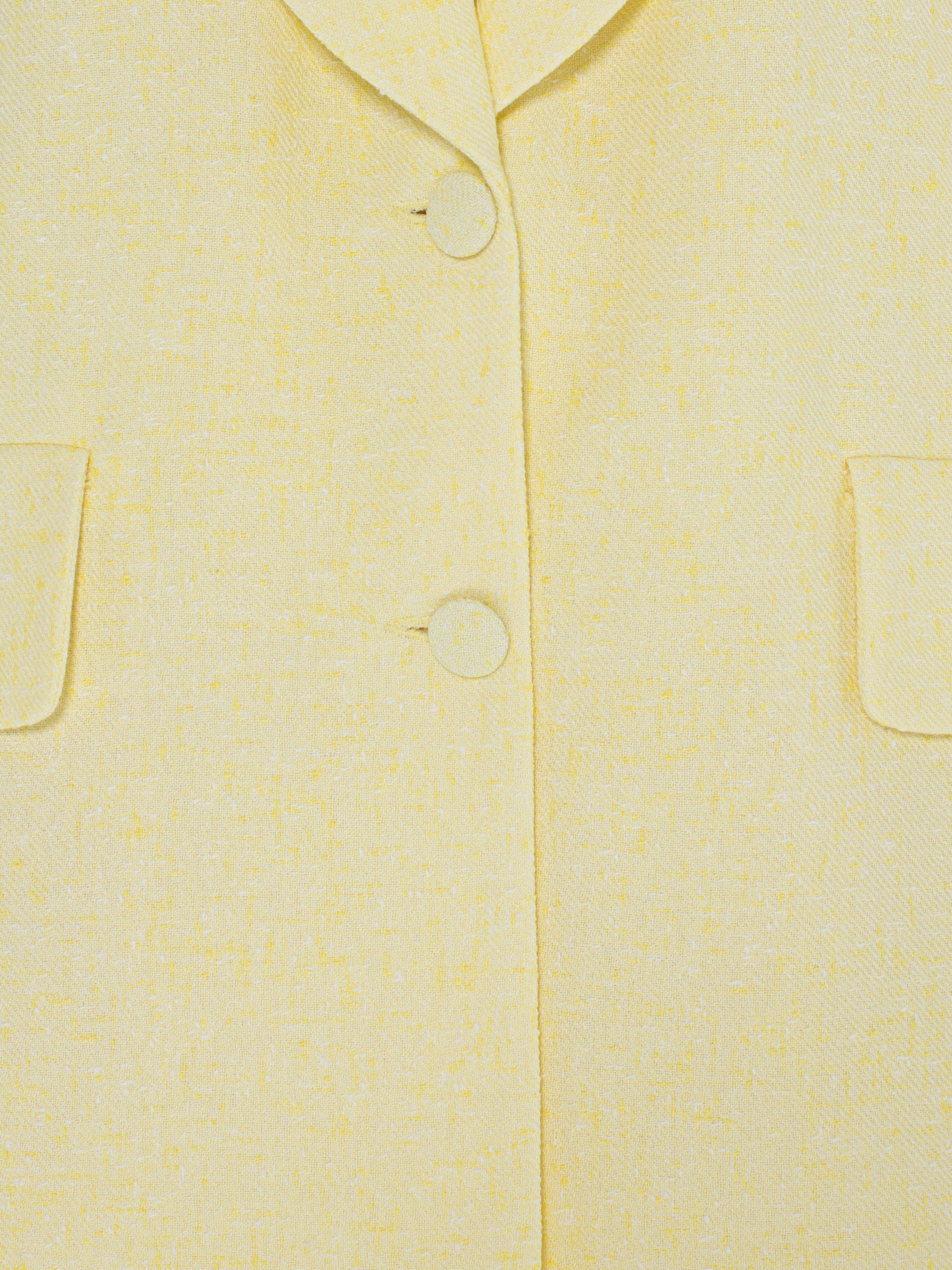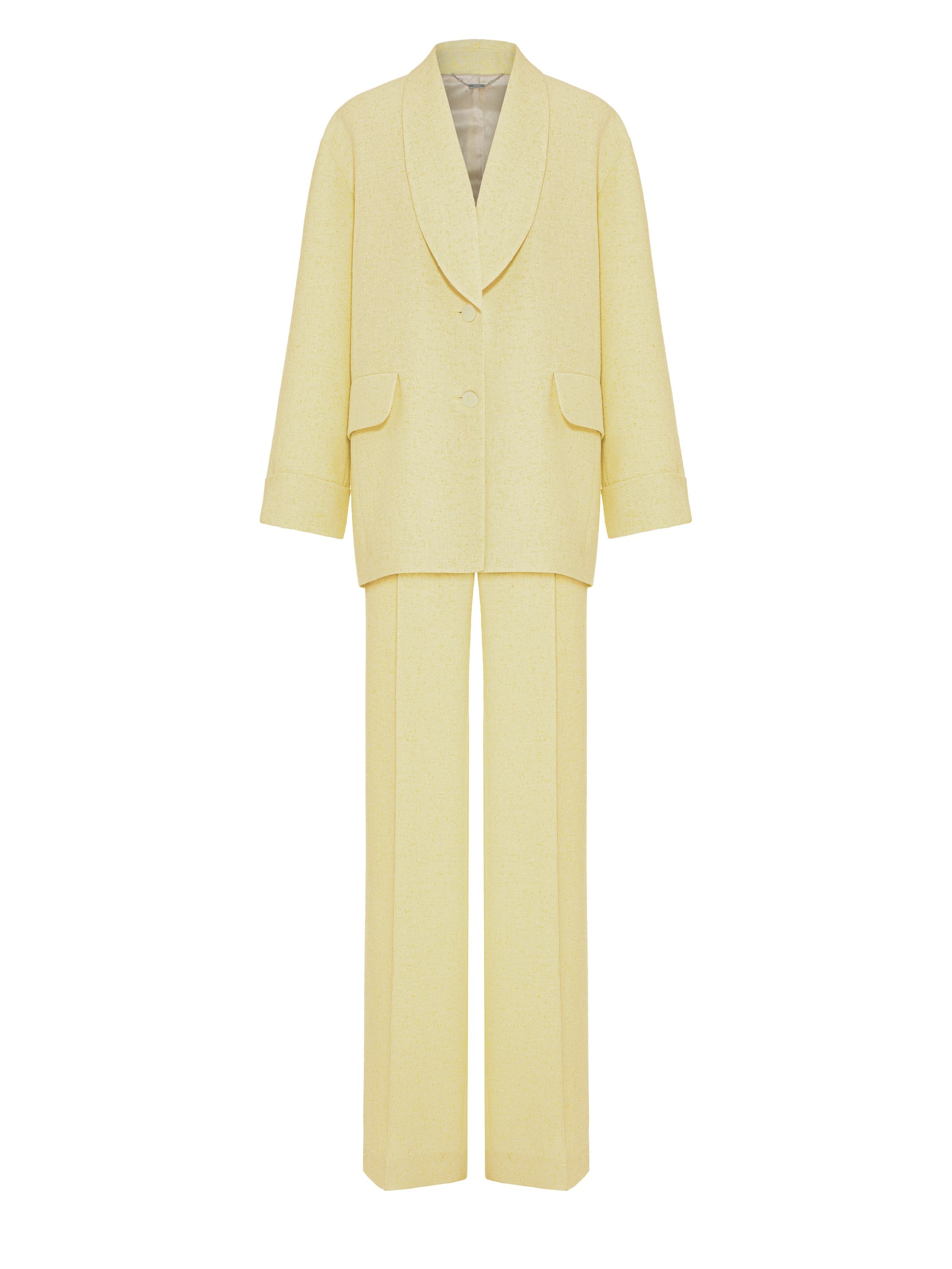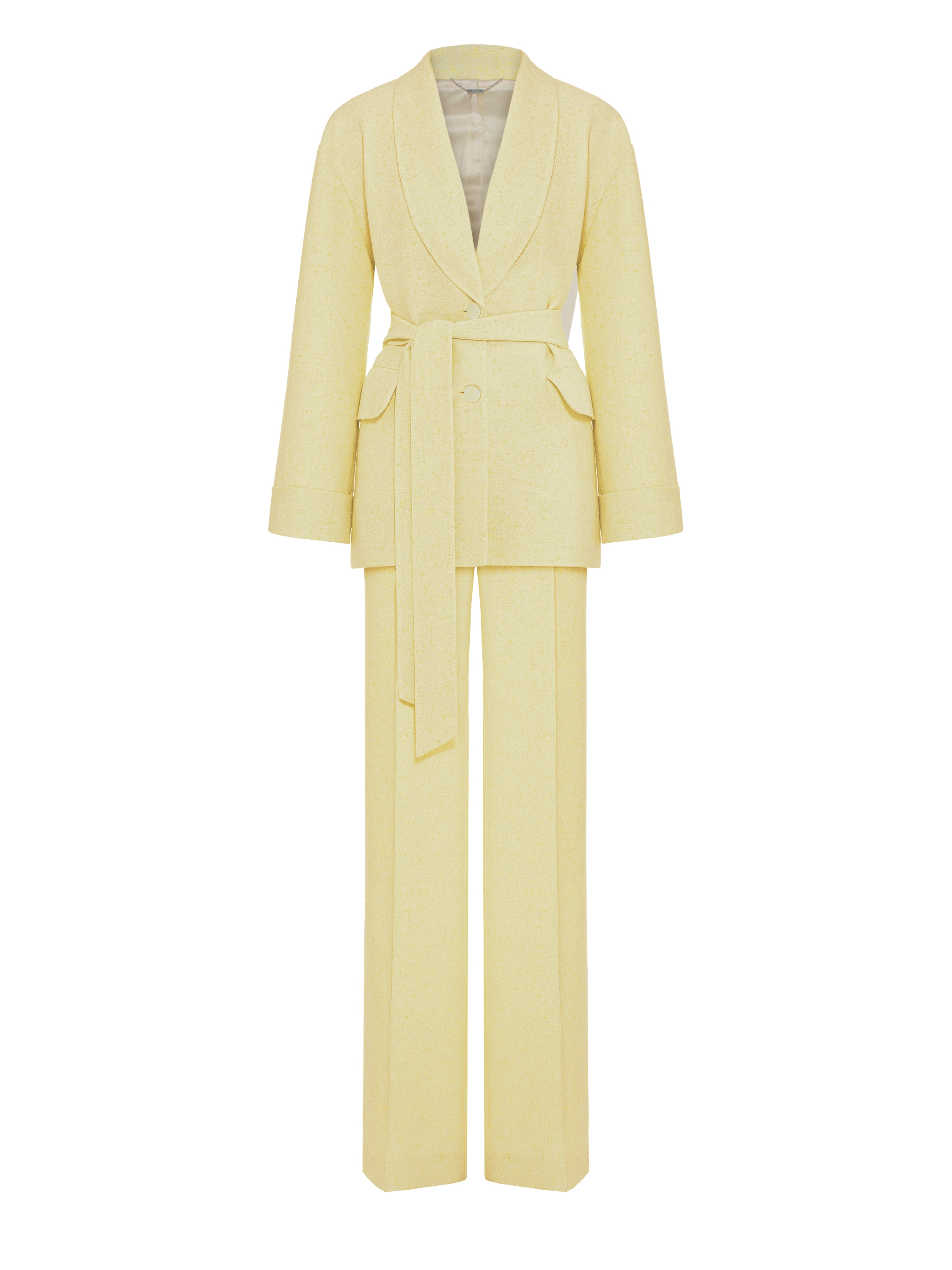 The yellow tweed two-piece suit consists of a single-breasted jacket with a belt and straight-cut trousers. The laconic set is suitable both for a formal event and a business meeting.